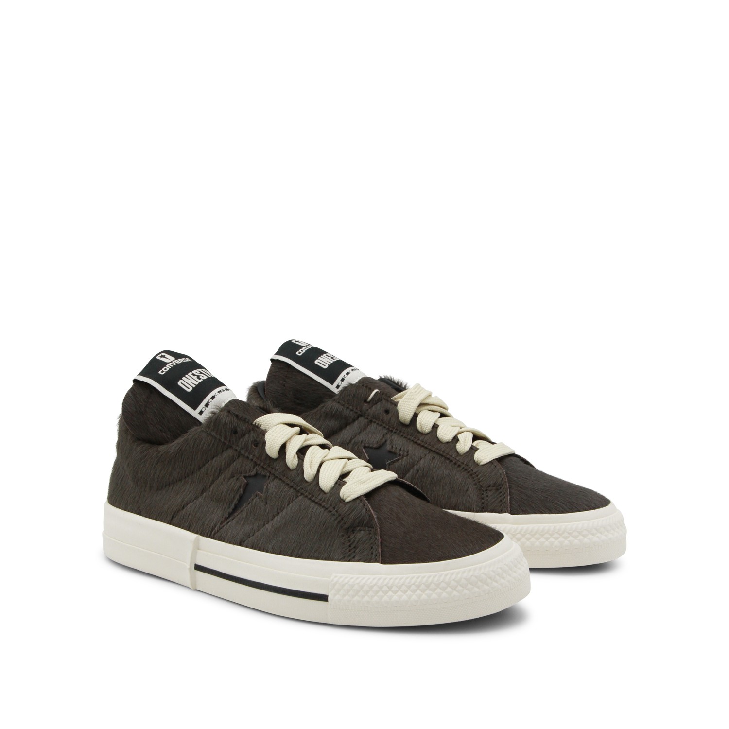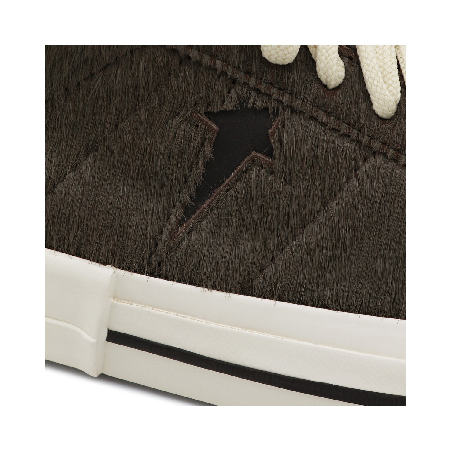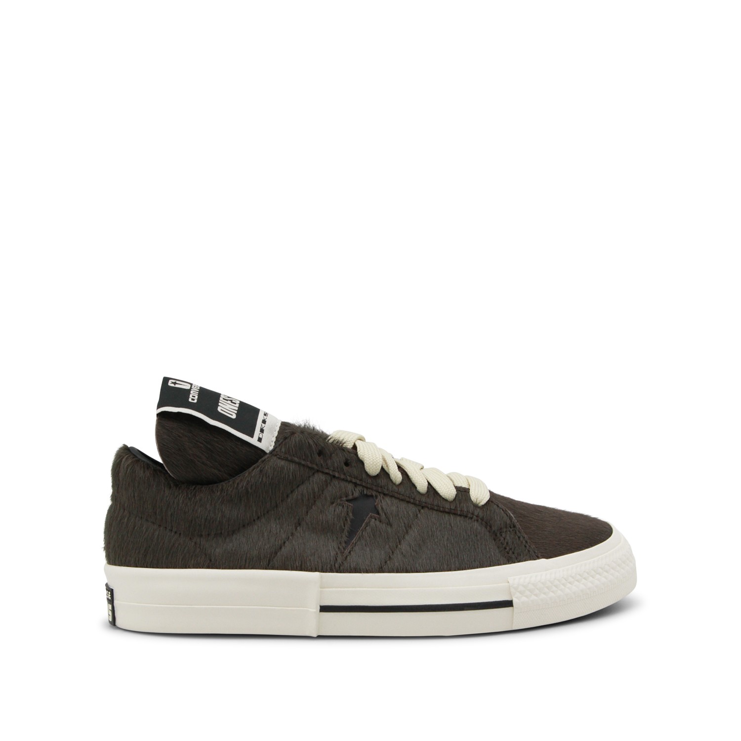 Dark grey leather sneakers from Converse X DRKSHDW featuring round toe, lace up contrasting fastening, frontal logo, details and contrasting rubber sole.