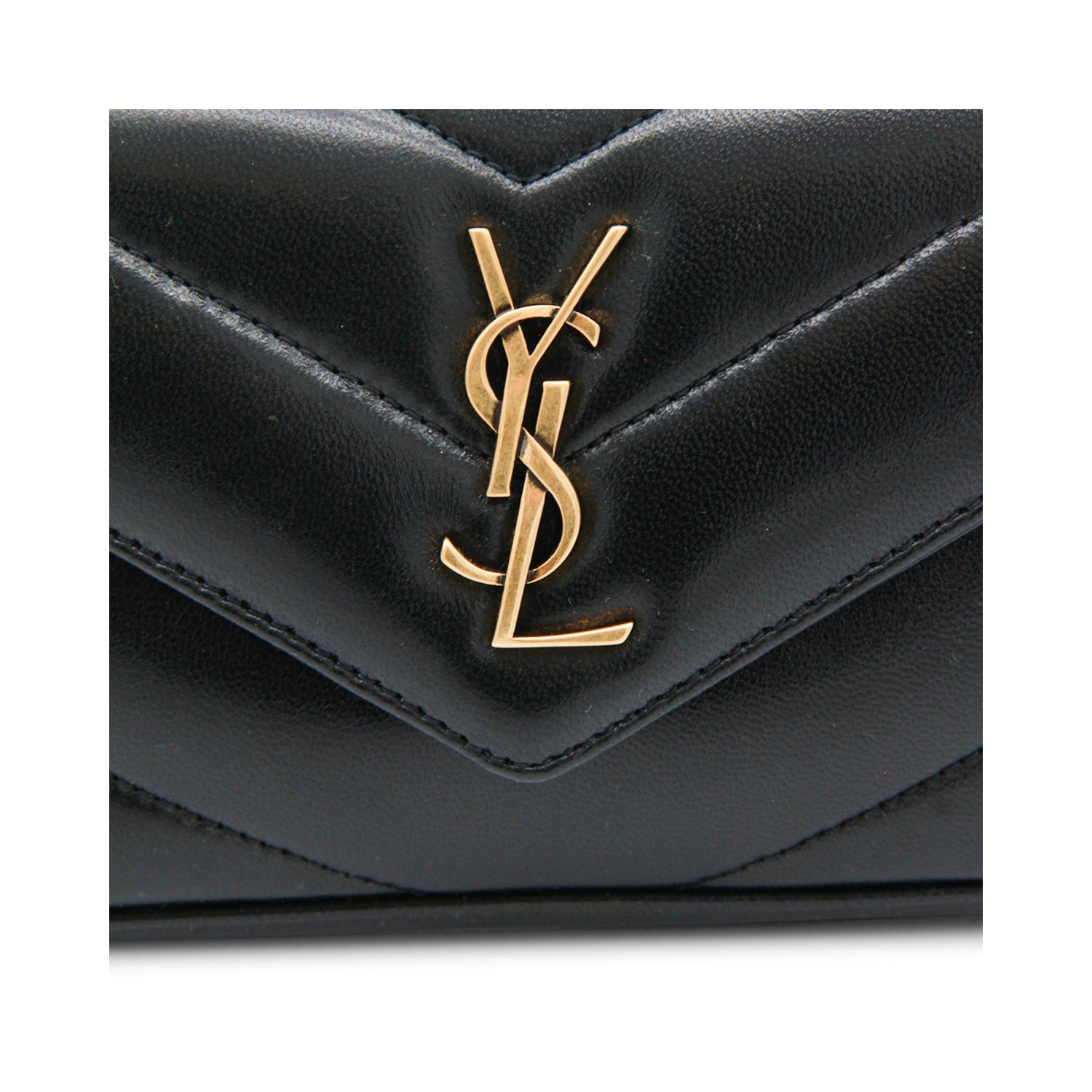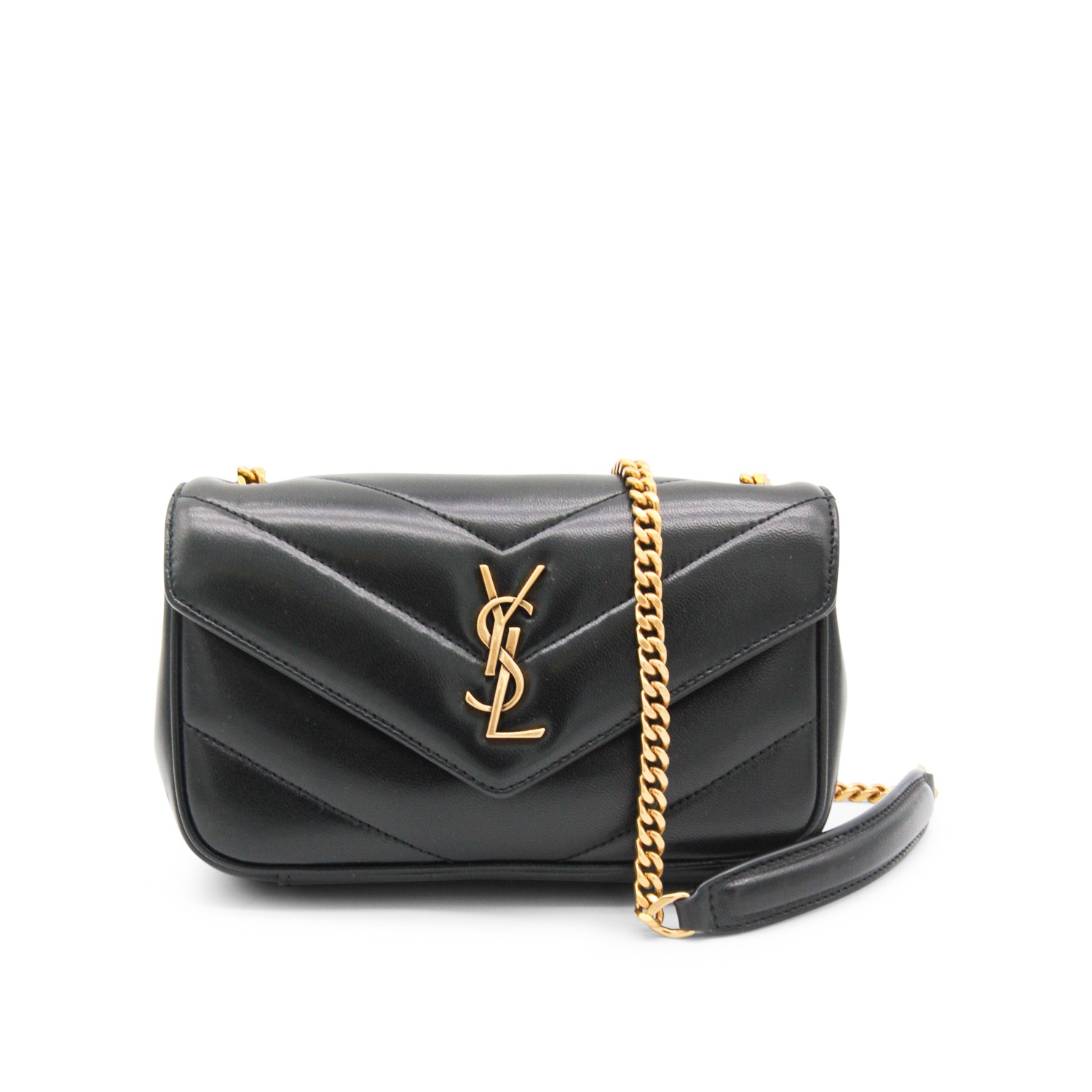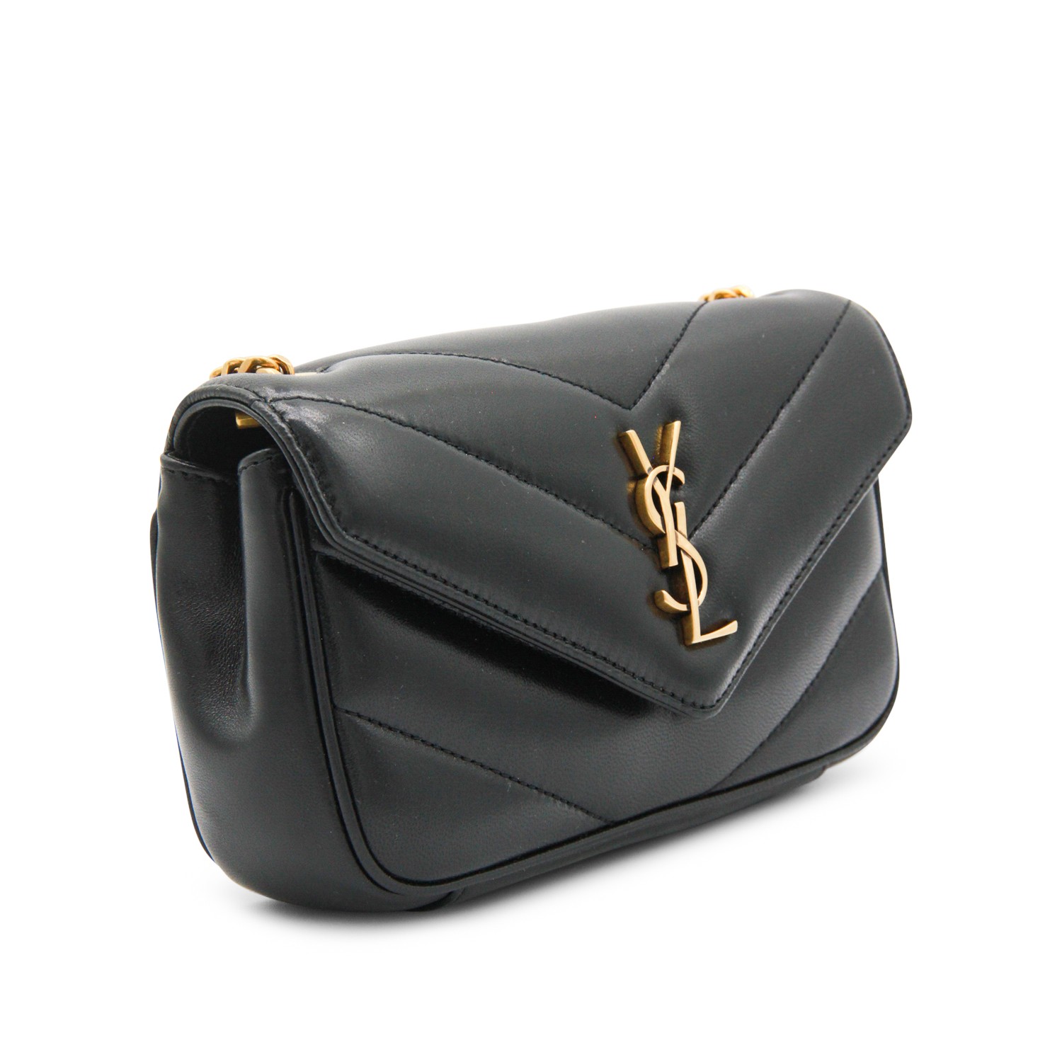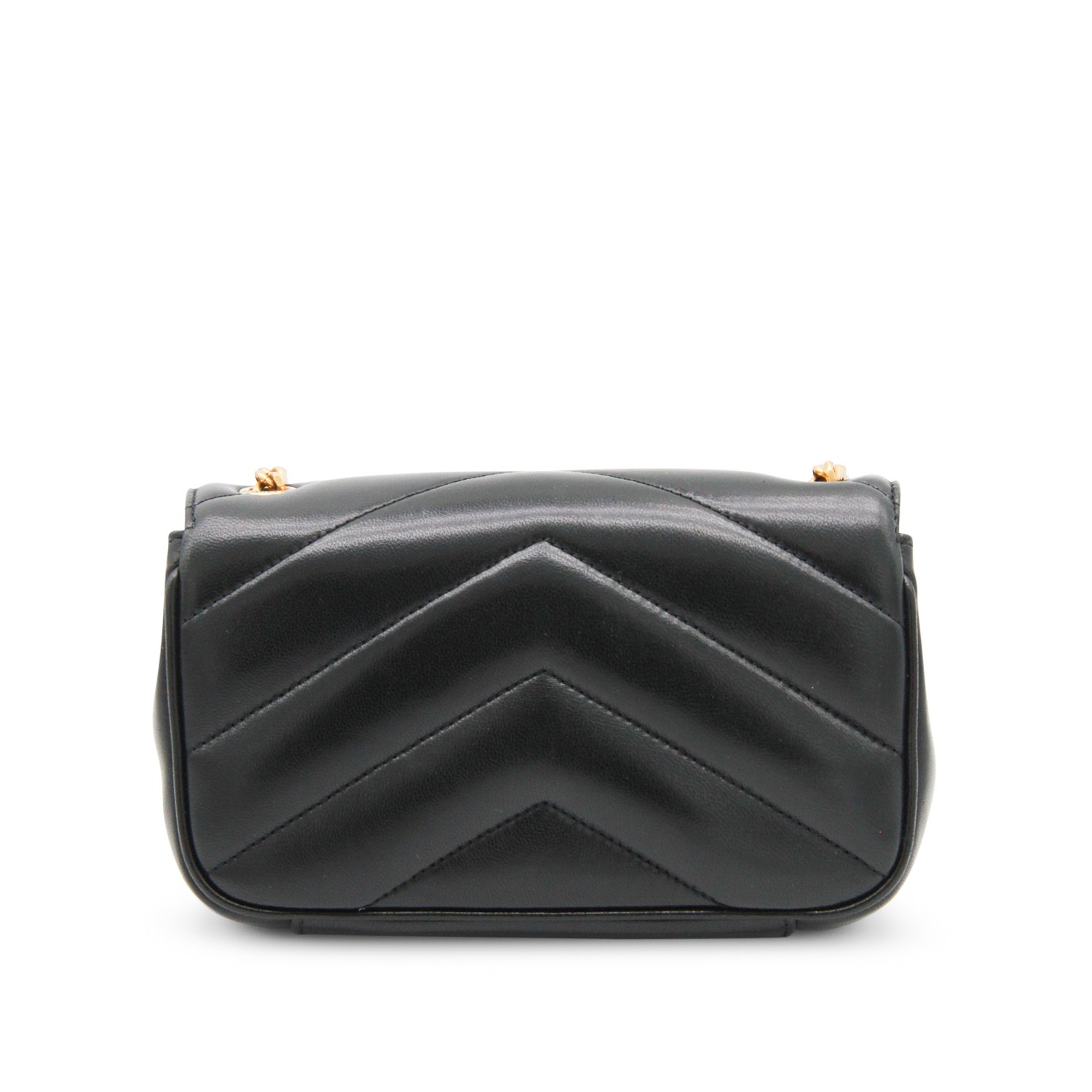 Black leather LouLou mini bag from Saint Laurent featuring gold tone metal hardware, chain-link shoulder strap, magnetic closure, frontal logo, main comparment and internal flat pocket.
