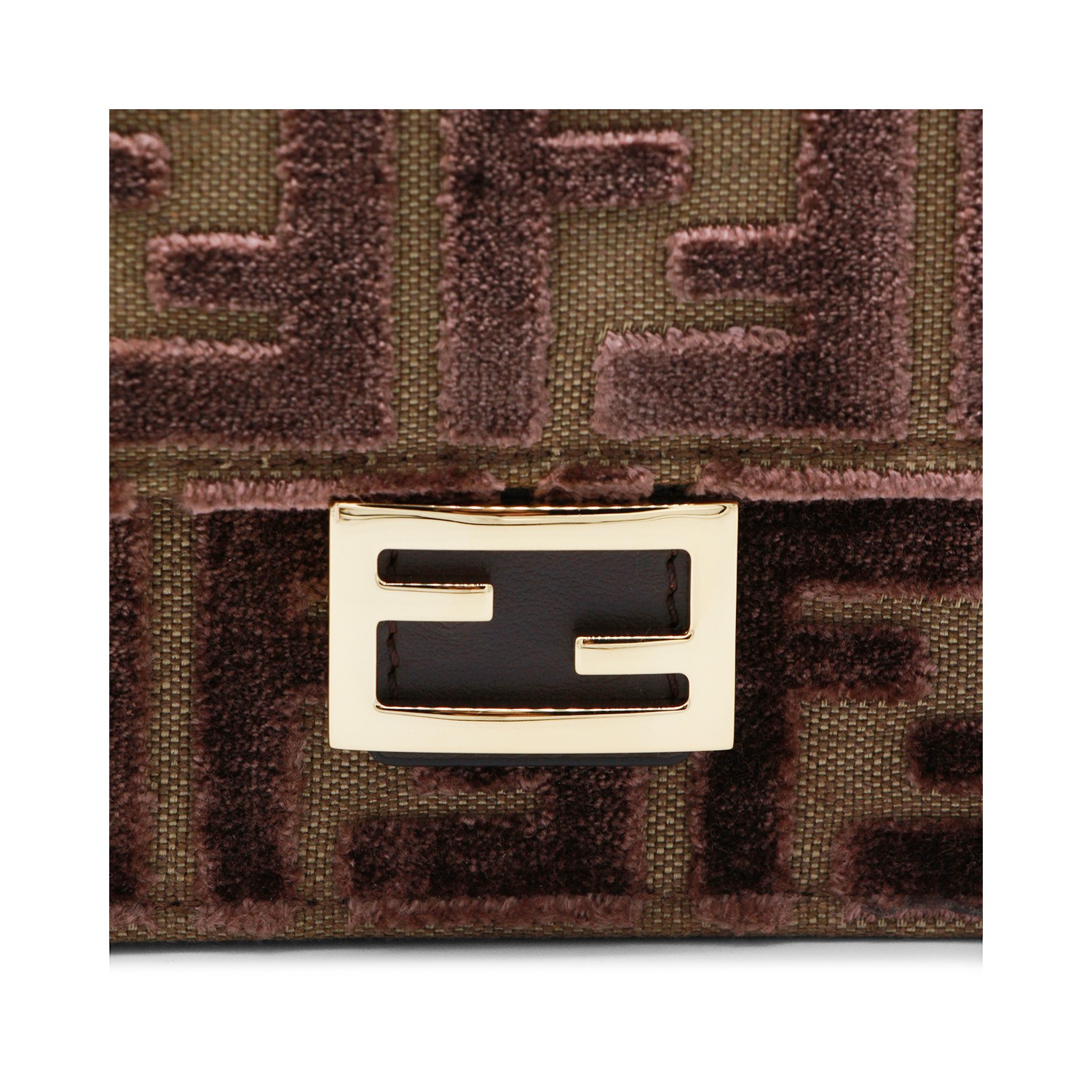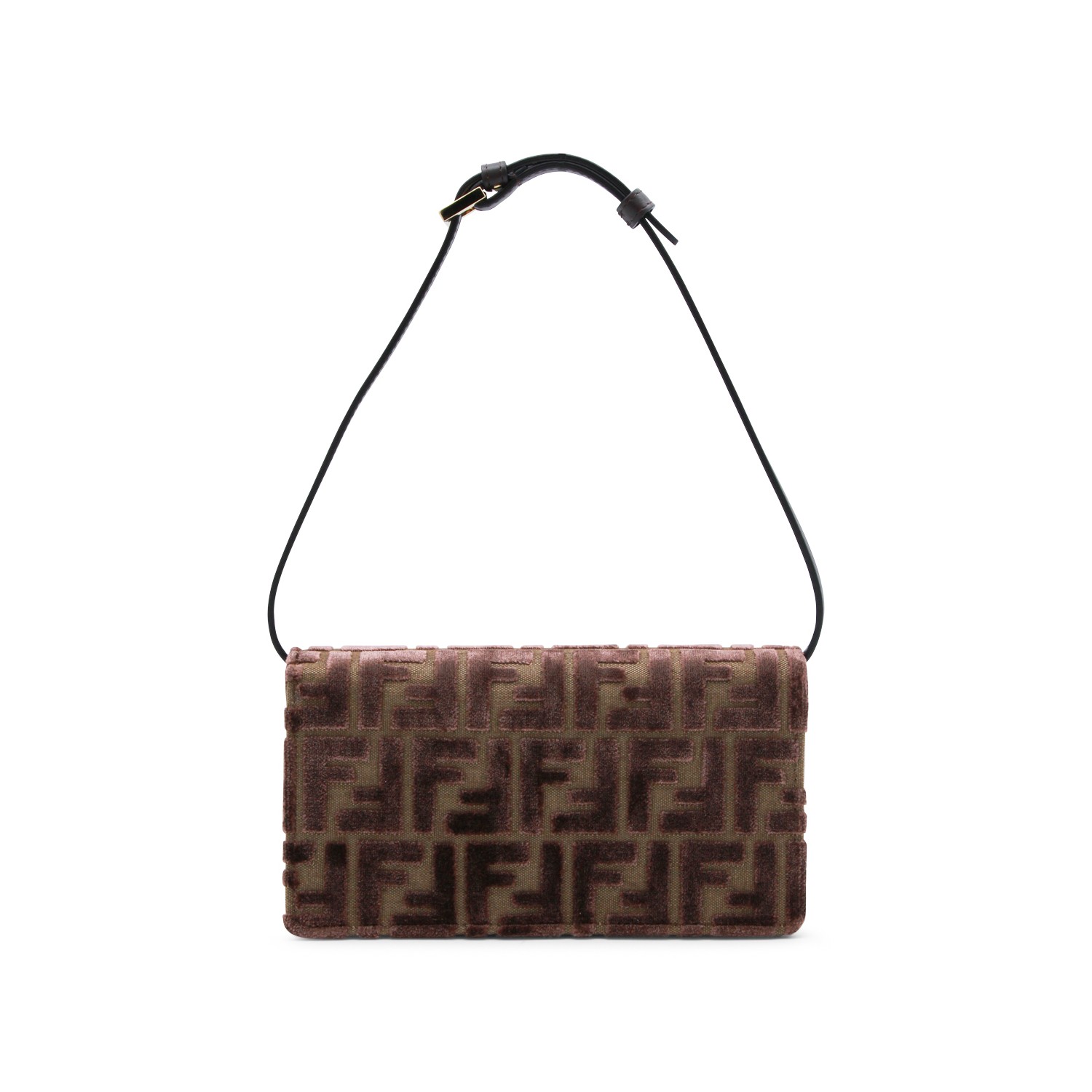 Brown leather Baguette wallet on chain from Fendi featuring jacquard velvet, flap with magnetic closure, adjustable top handle, chain shoulder strap, main compartment and card slots.