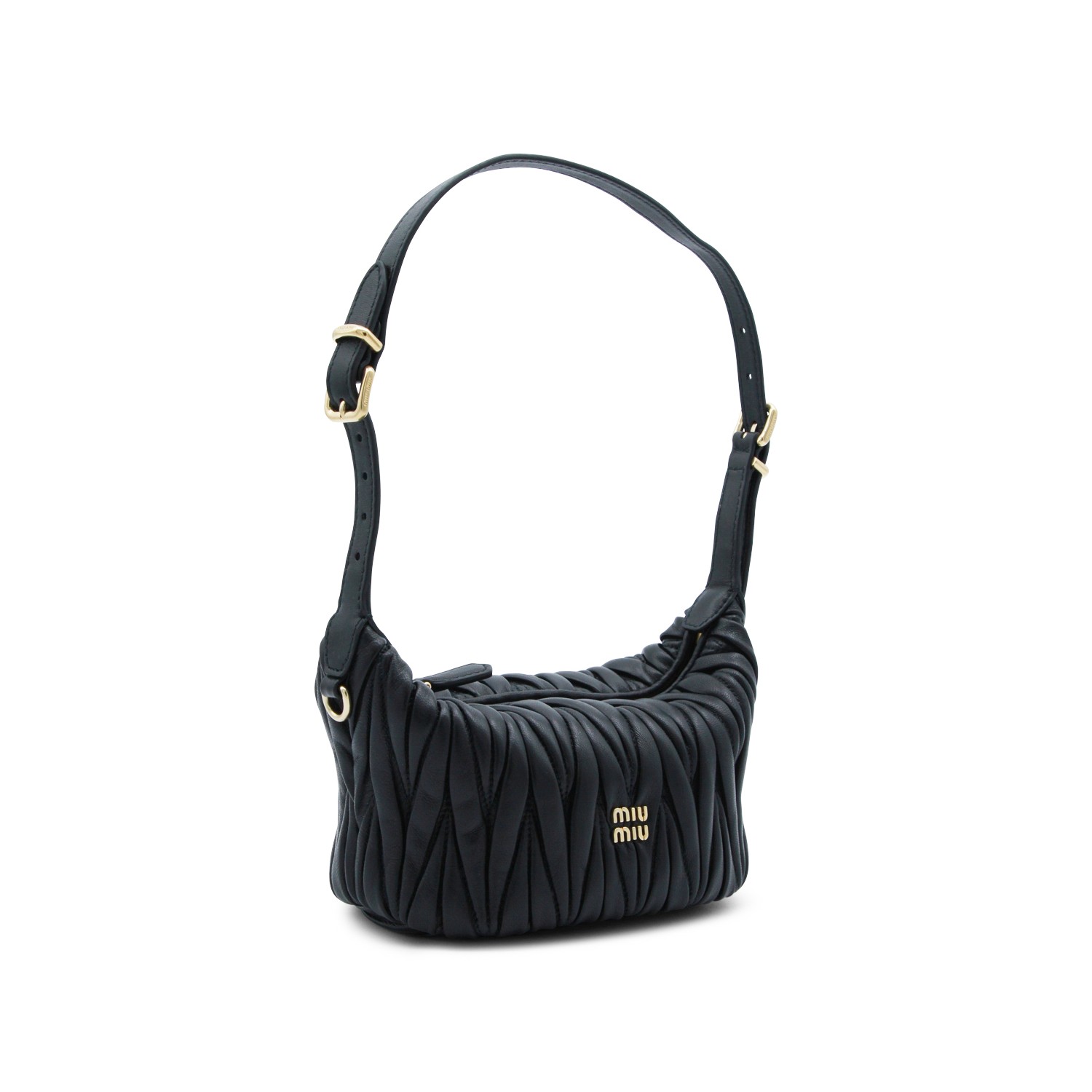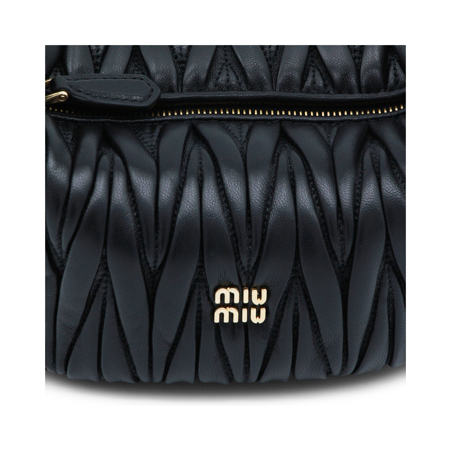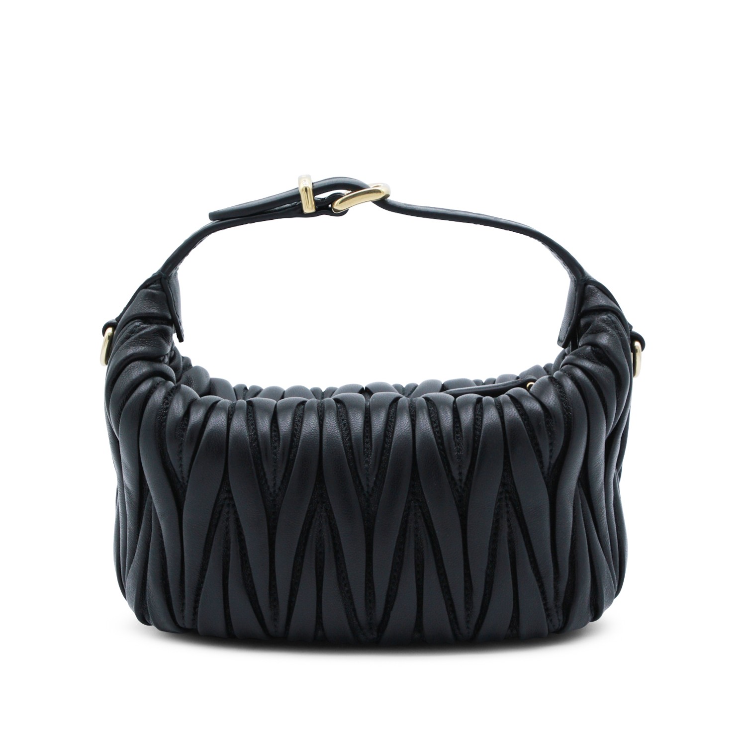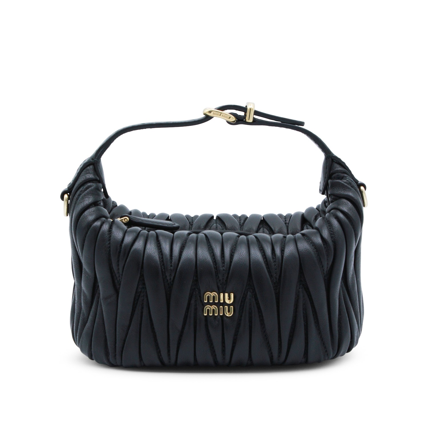 Black leather mini bag from Miu Miu featuring top handle, zip fastening, main compartment, internal zip pocket, golden hardware,frontal logo detail and all over details.