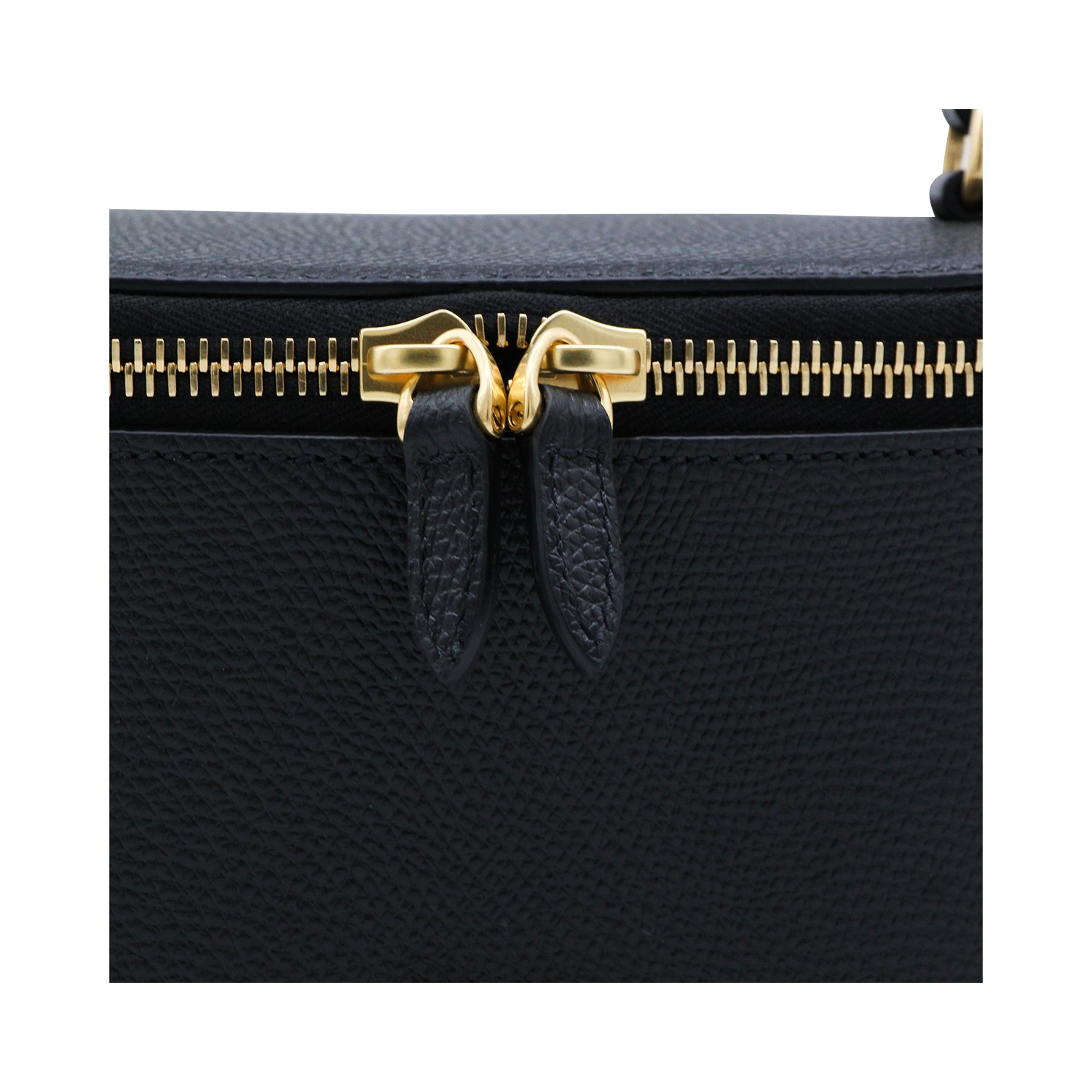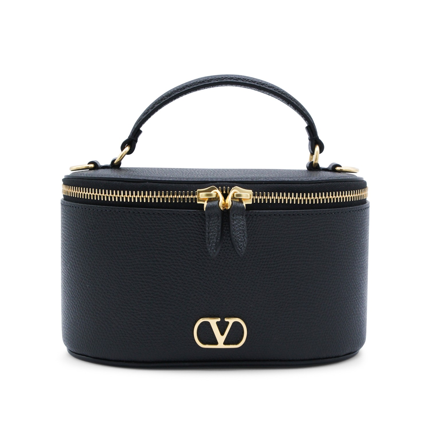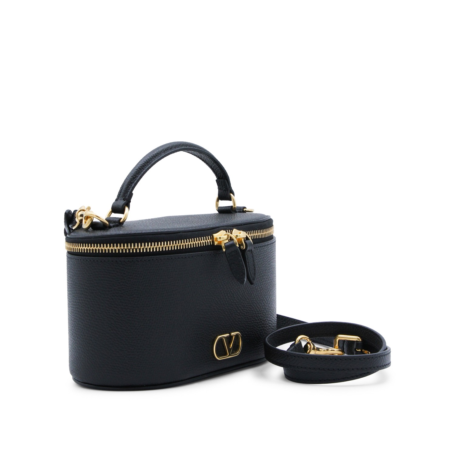 Black leather Mini Vanity bag from Valentino Garavani featuring top handle, adjustable and removable shoulder strap, zip closure, main compartment and gold tone logo.