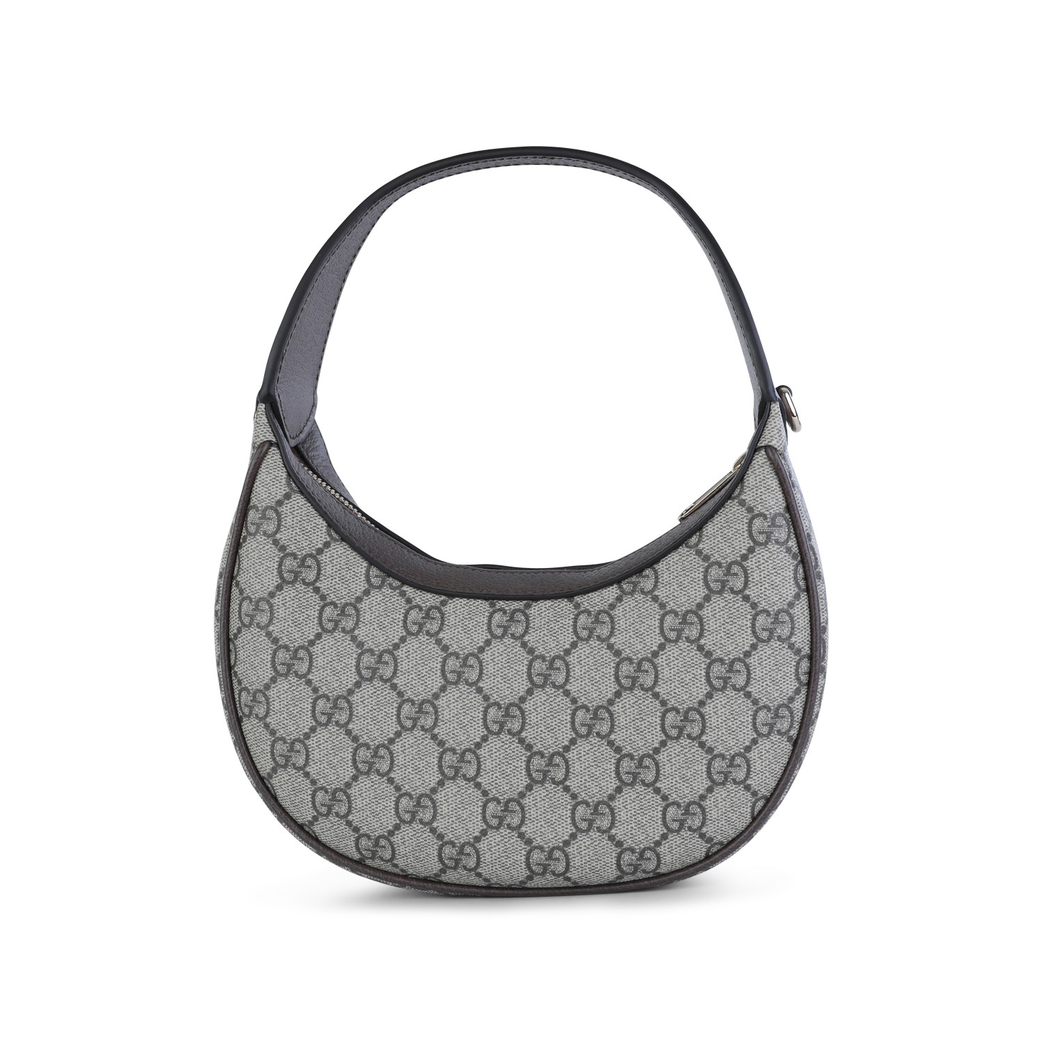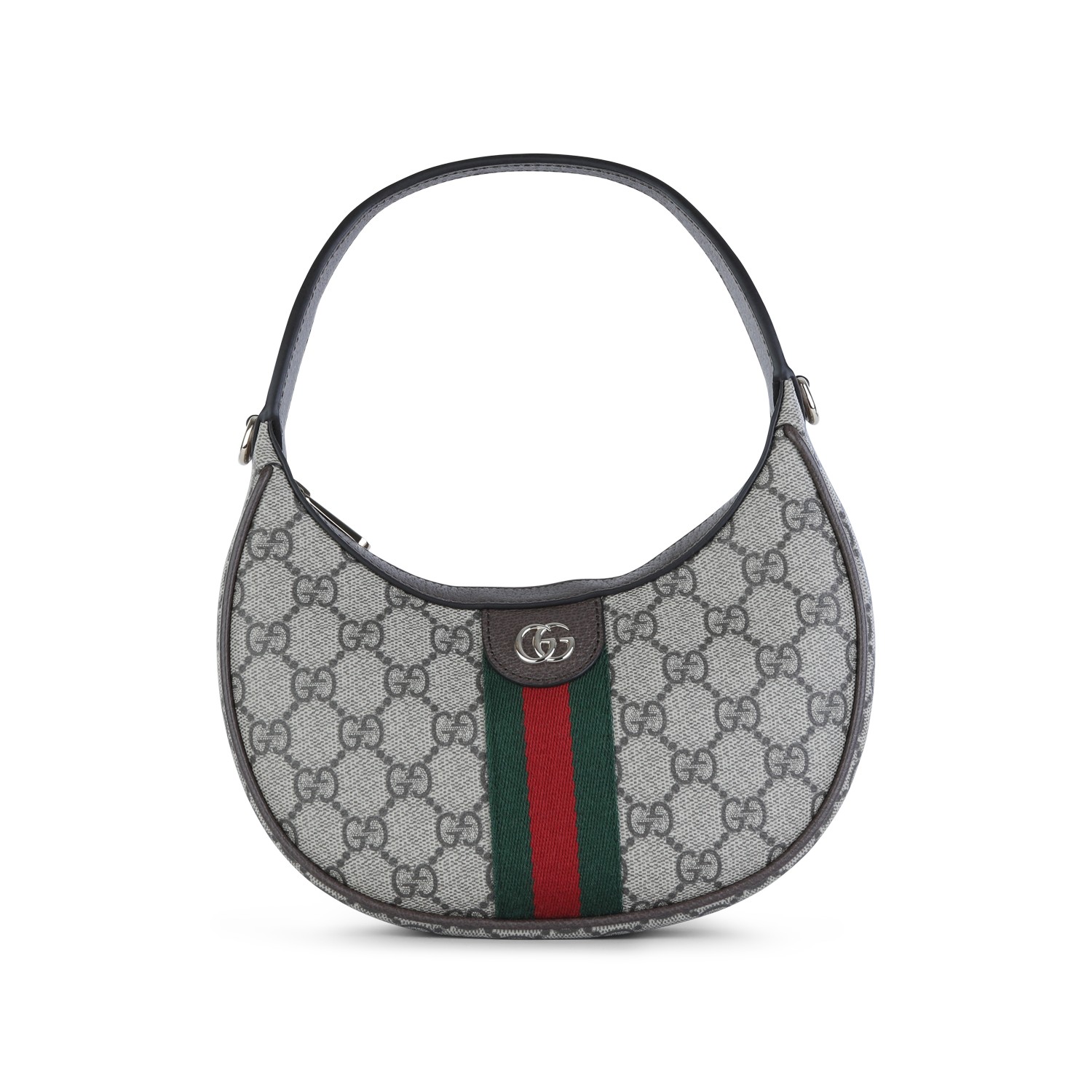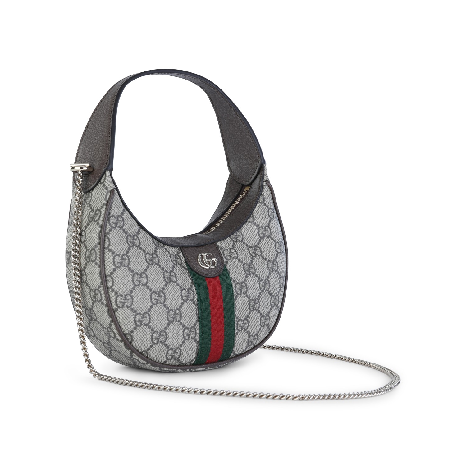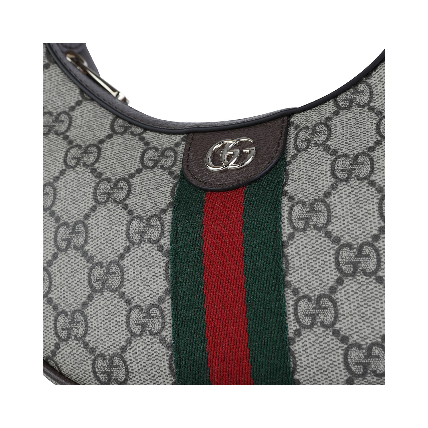 Beige Ophidia small mini bag from Gucci featuring all over GG monogram pattern, light gold tone hardware, Web ribbon, zip closure and main compartment.