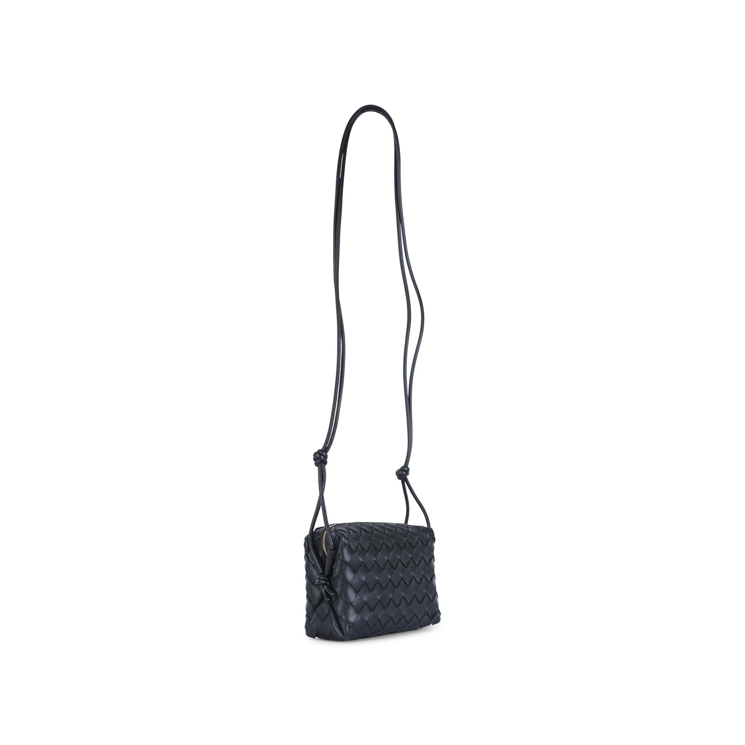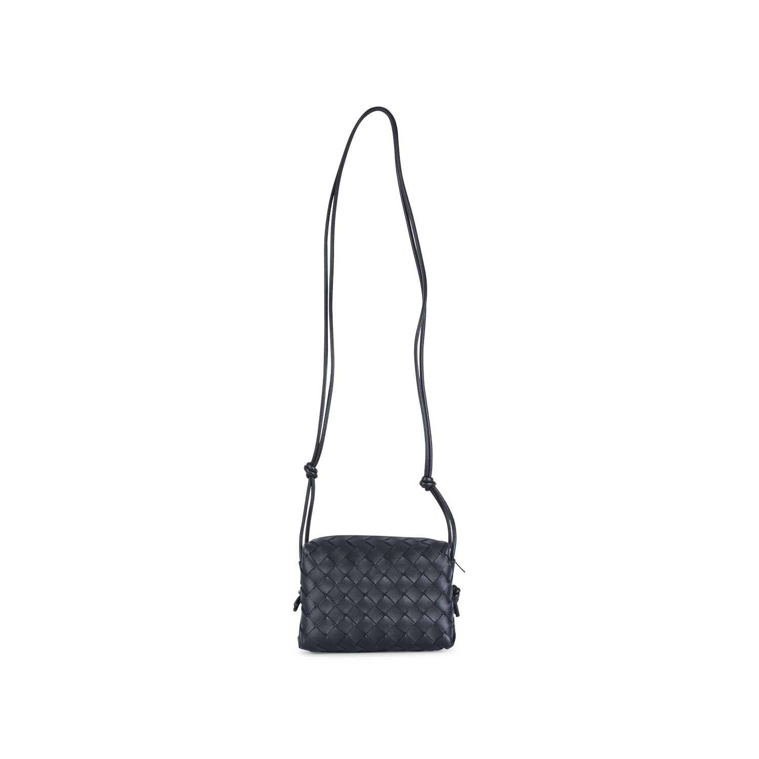 Black leather Mini Loop Camera bag from Bottega Veneta featuring adjsutable strap, zip fastening, silver tone hardware and inside pocket.