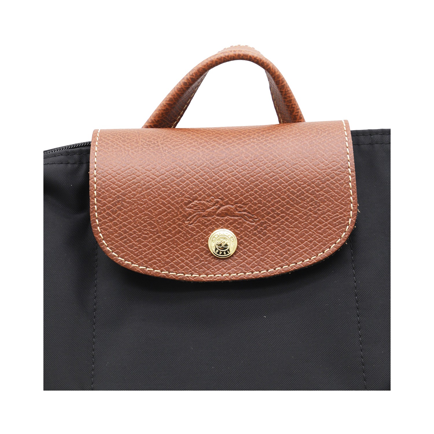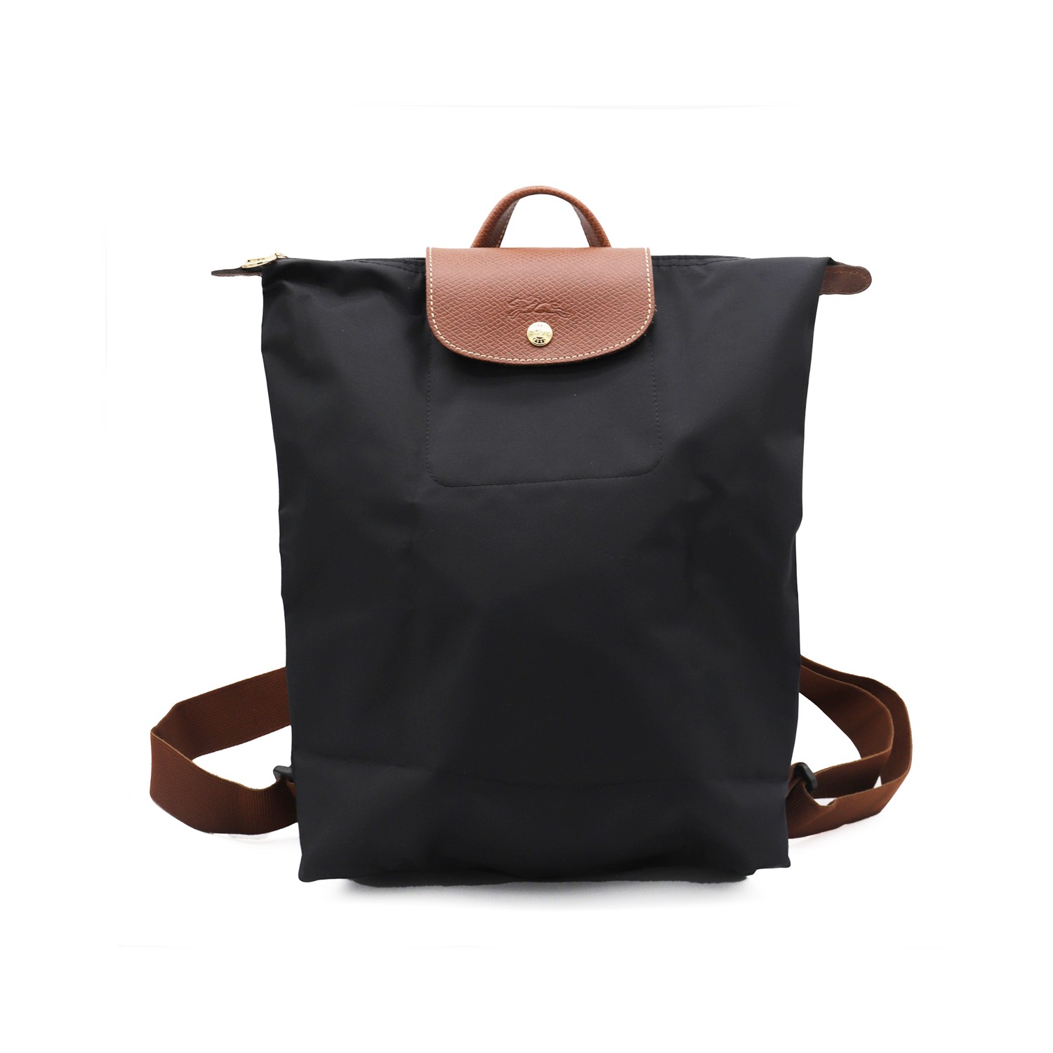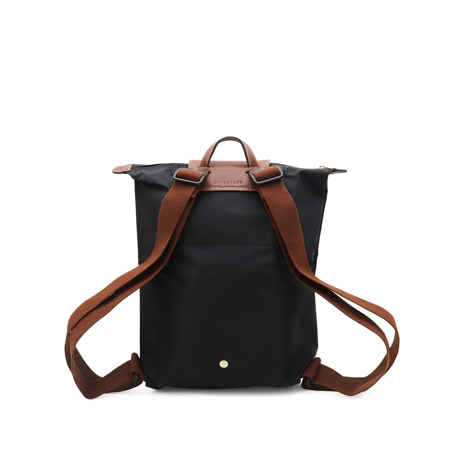 Black backpack from Longchamp featuring frontal zip fastening, leather details, adjustable straps, frontal logo and pocket.