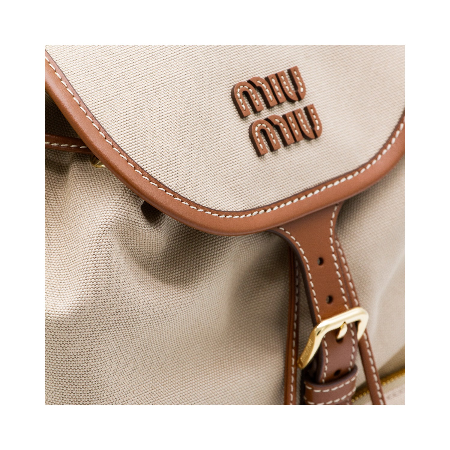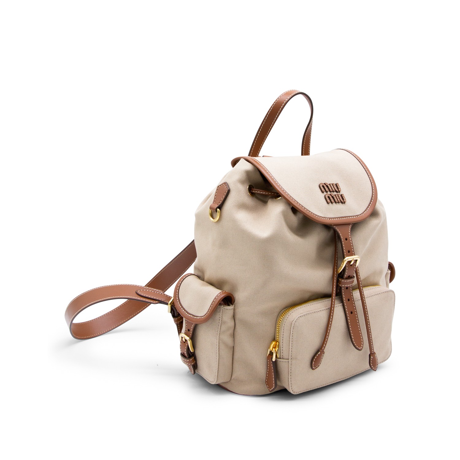 Beige cotton backpack from Miu Miu featuring fronta fastening, logo lettering, multipockets, gold tone gardware and leather details.