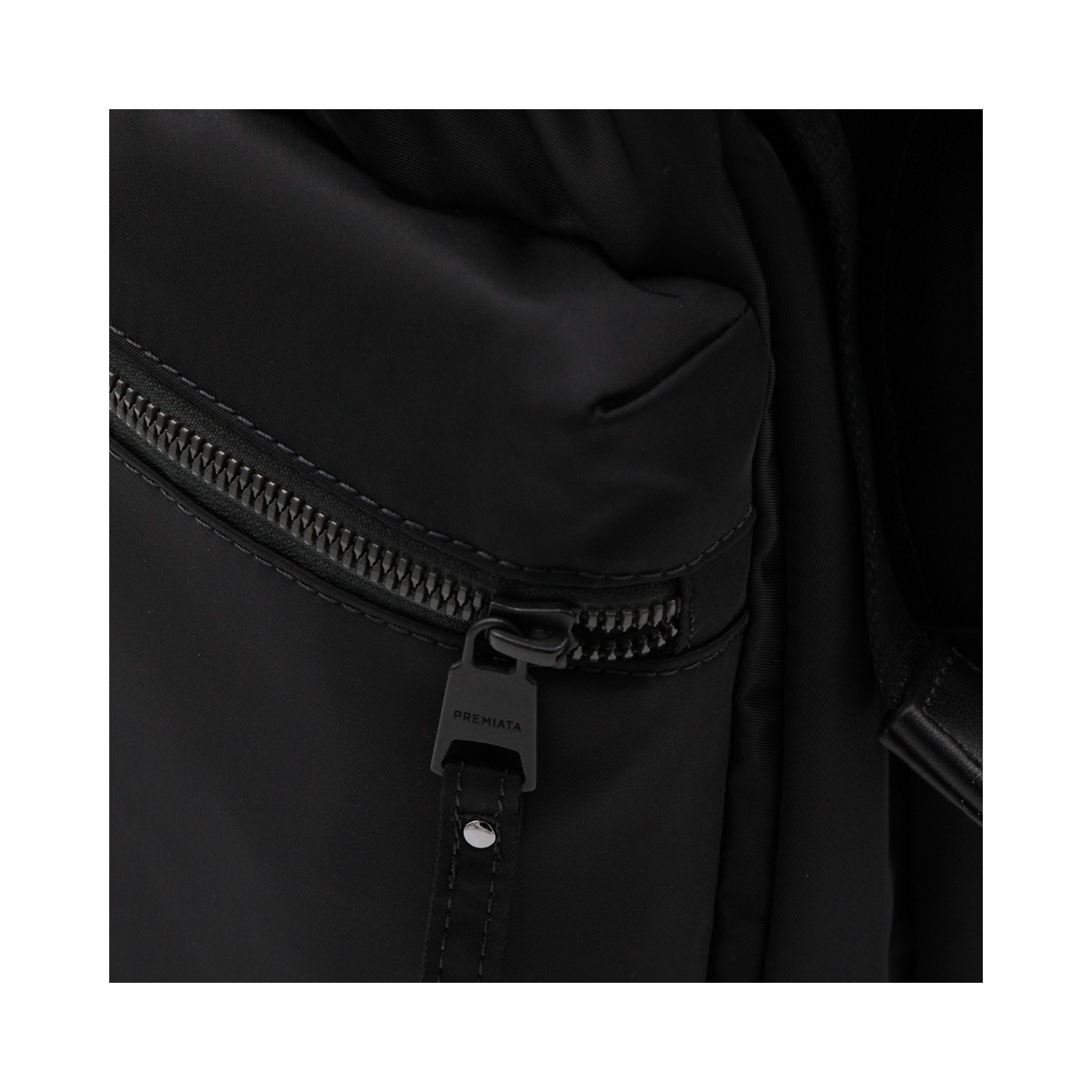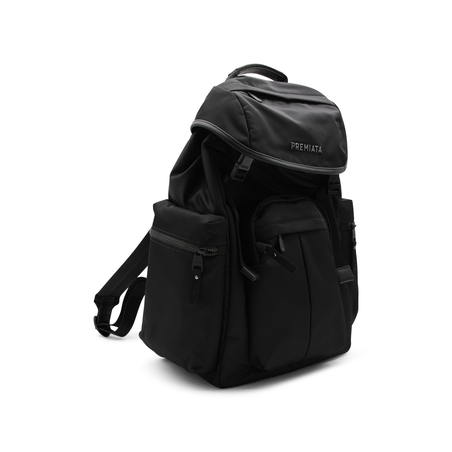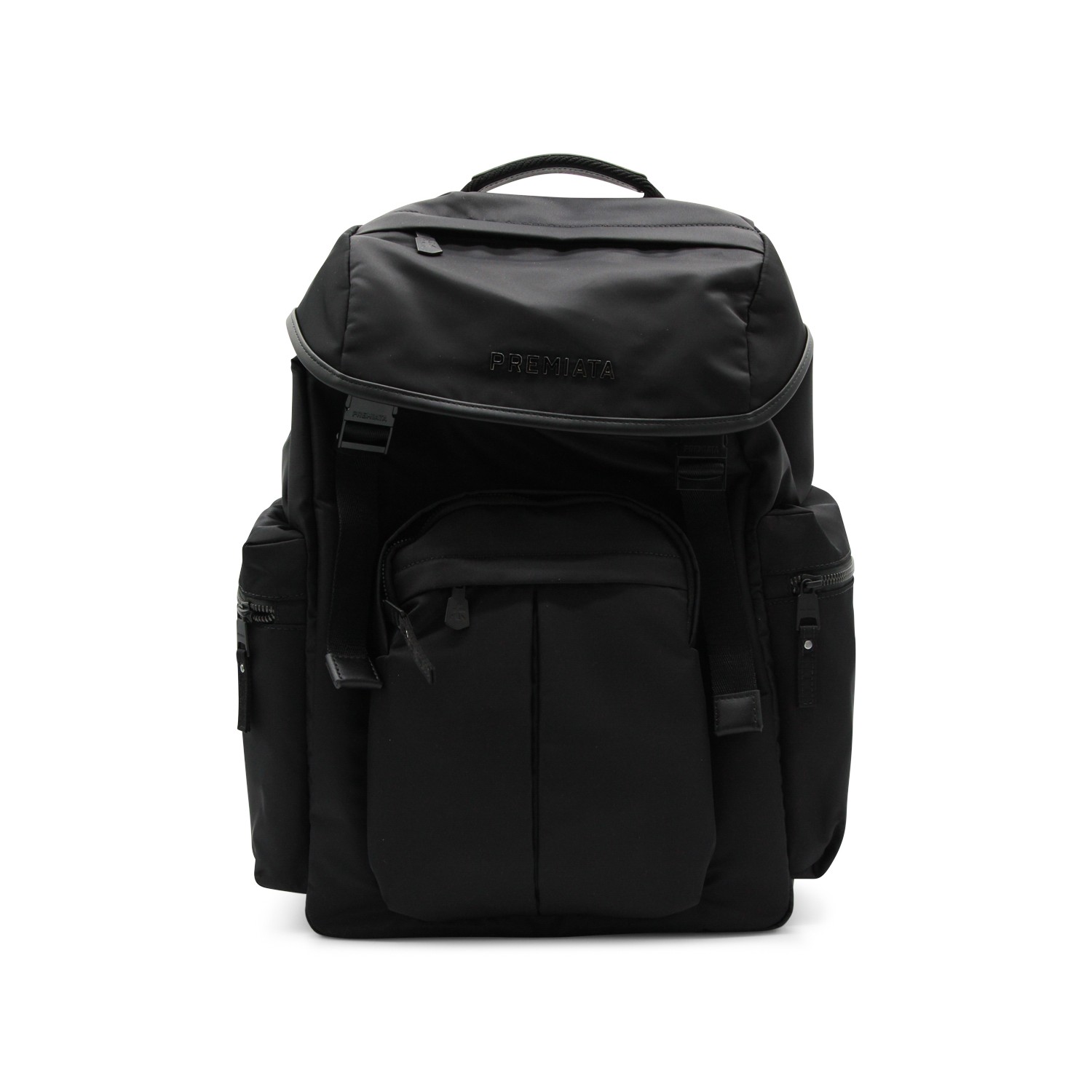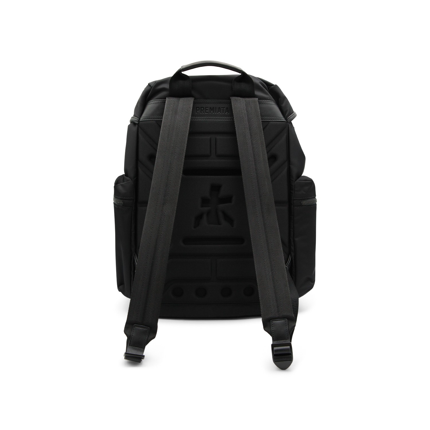 Black nylon Booker backpack from Premiata featuring short top handle, logo print, foldovertop with buckle closure, pockets, adjustable straps and compartments.