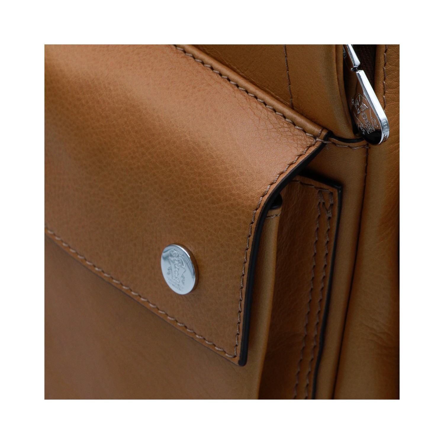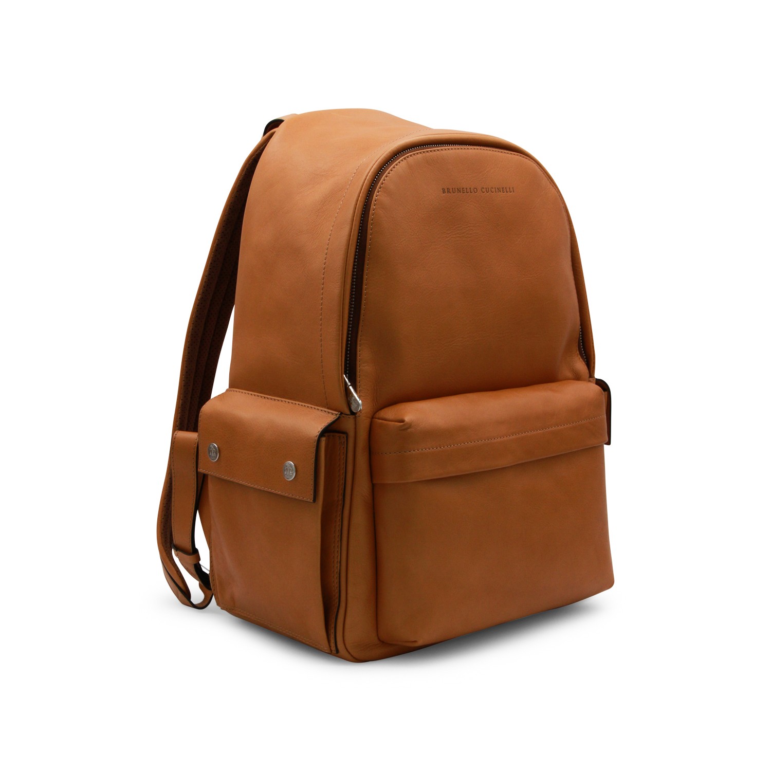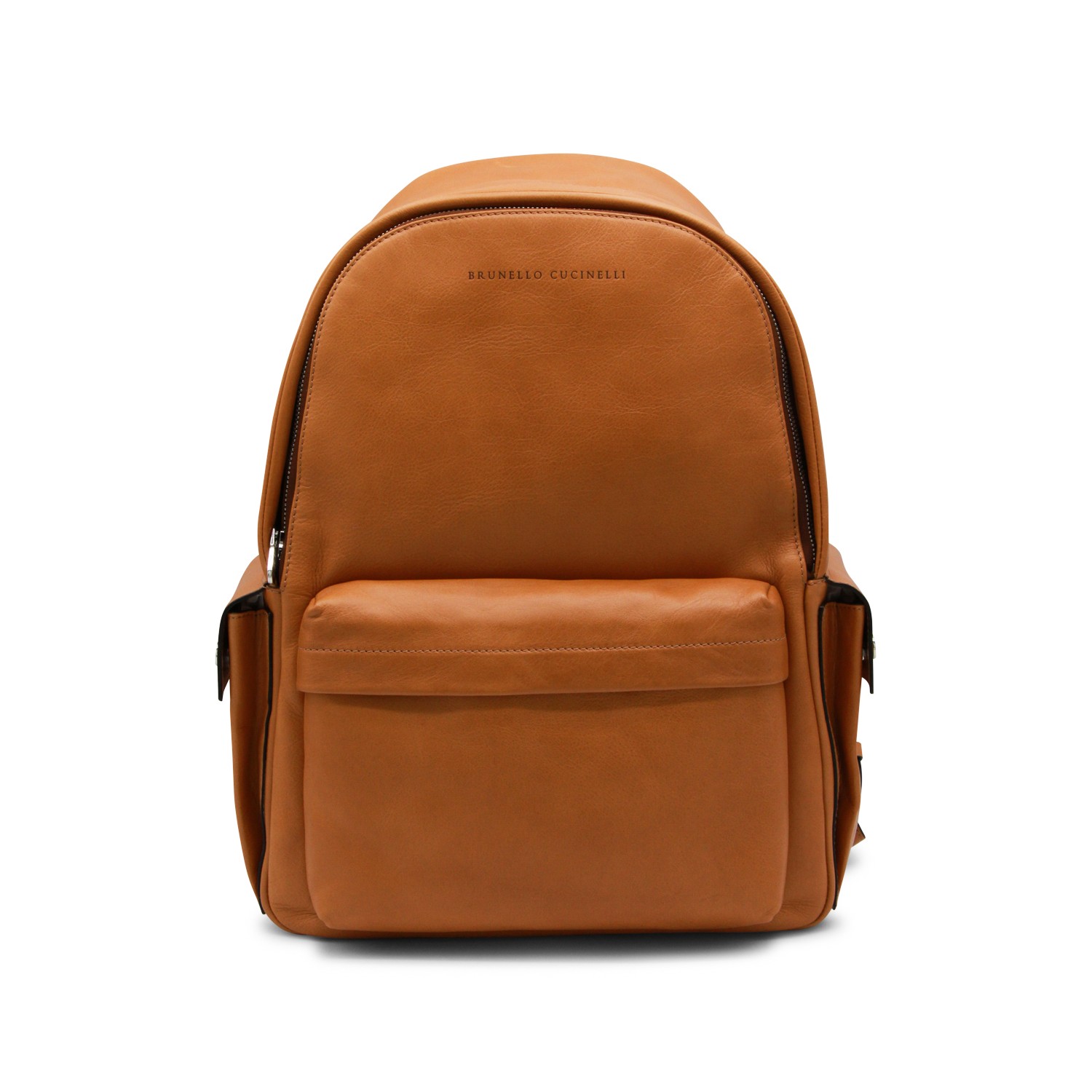 Brown leather backpack from Brunello Cucinelli featuring adjustable shouder straps, embossed logo at front, main compartment, zipped pocket and side pockets.