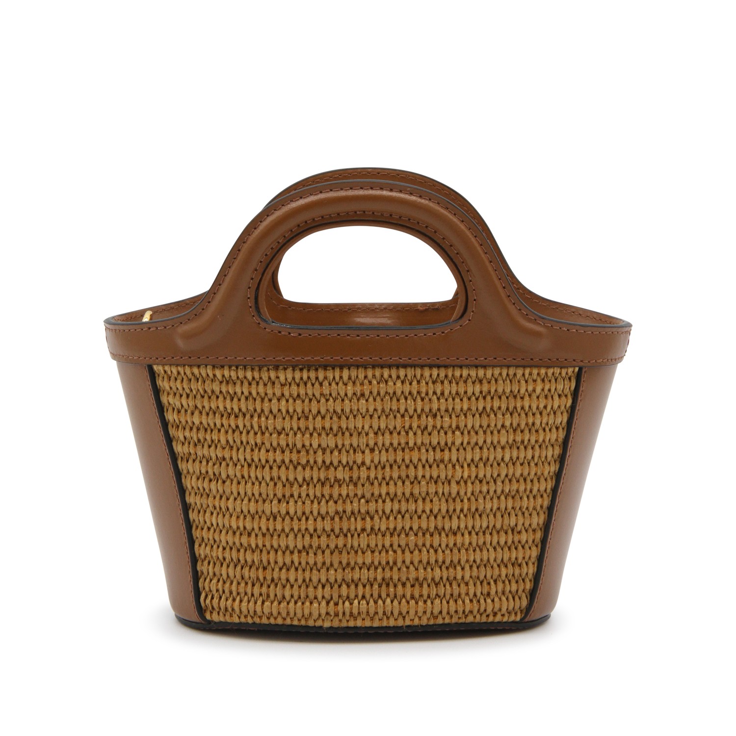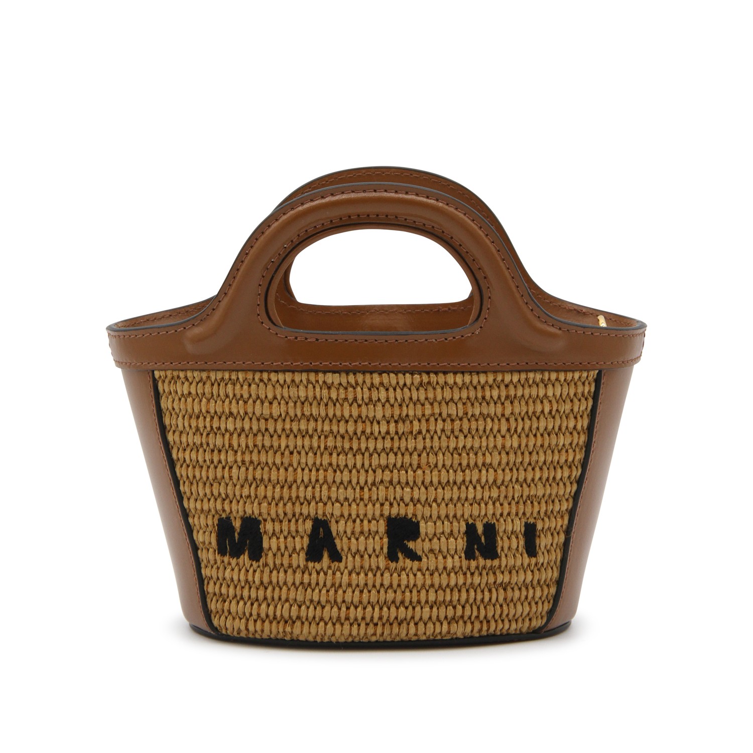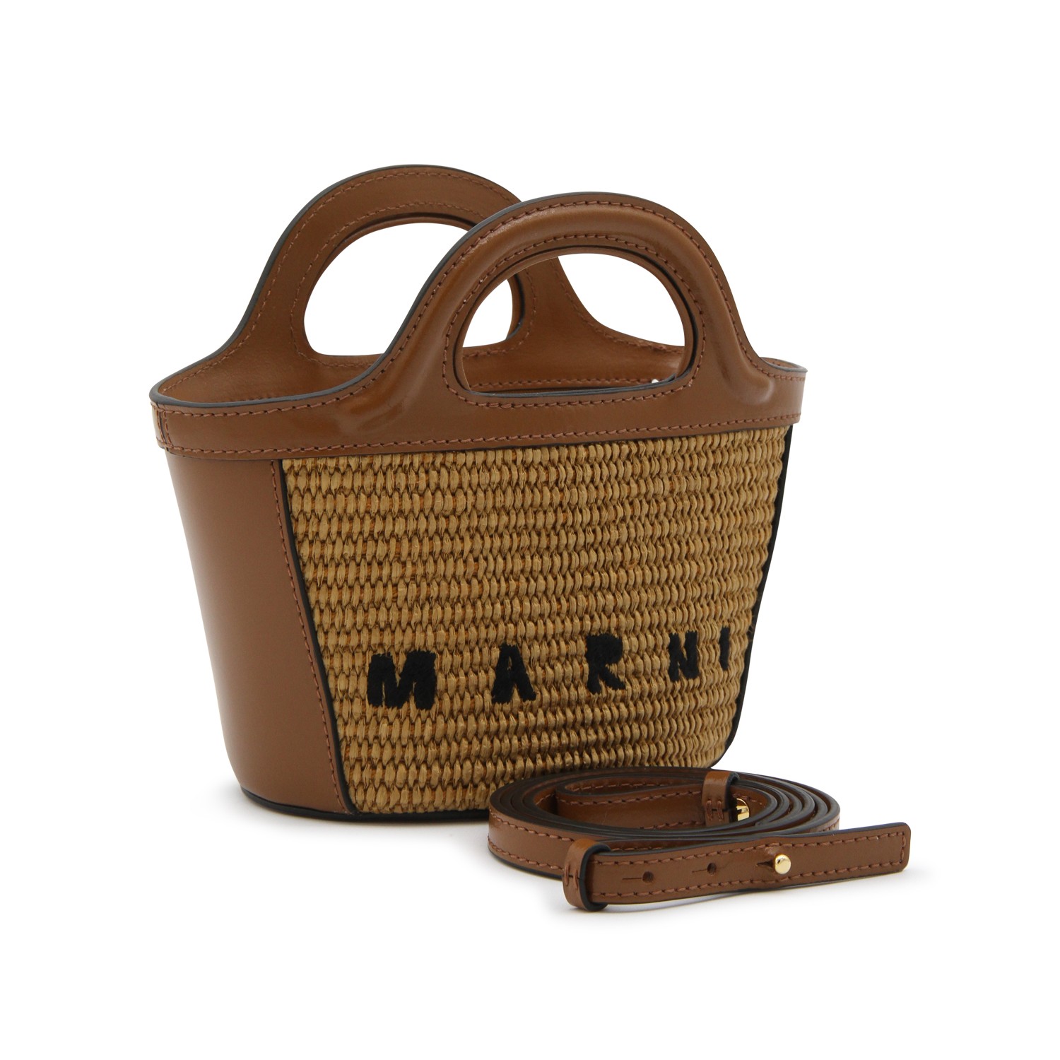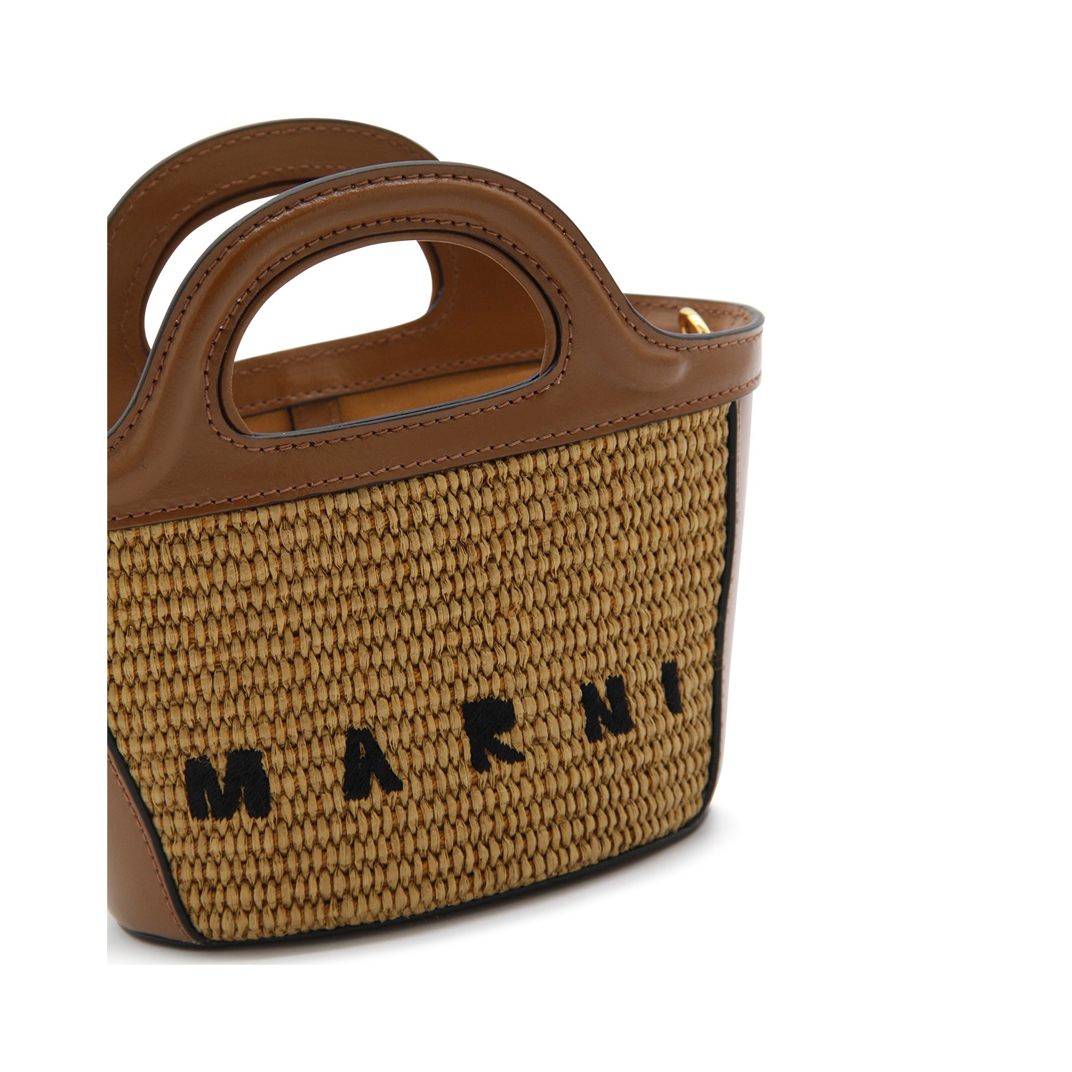 Brown Tropicalia mini top handle bag fro Marni featuring adjustable shoulder strap, leather handles, logo signature at front and internl compartments.