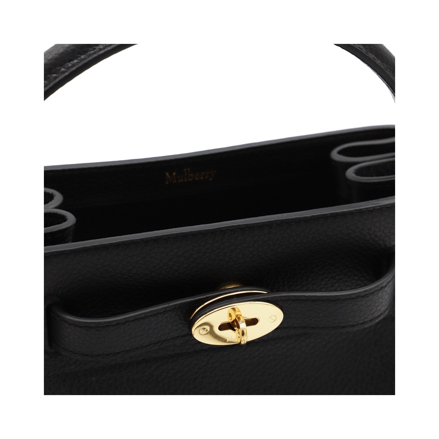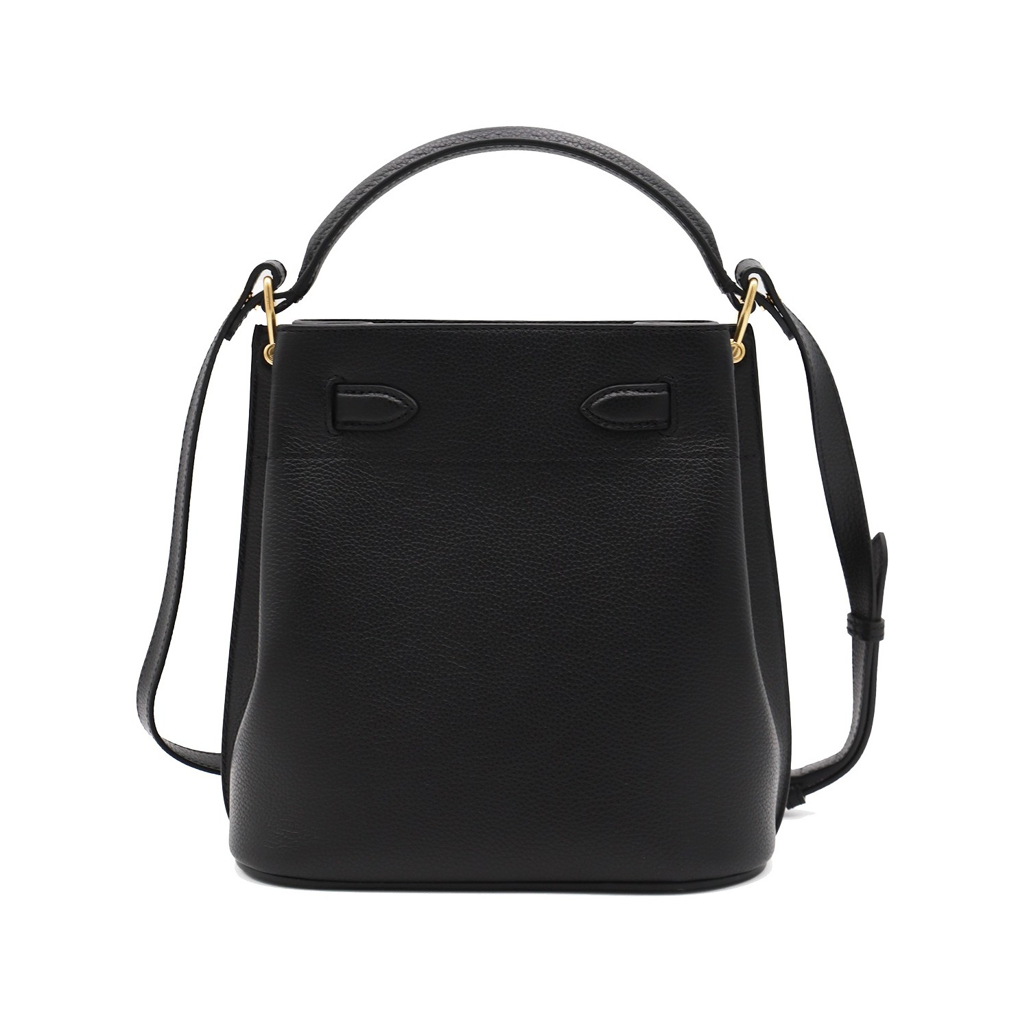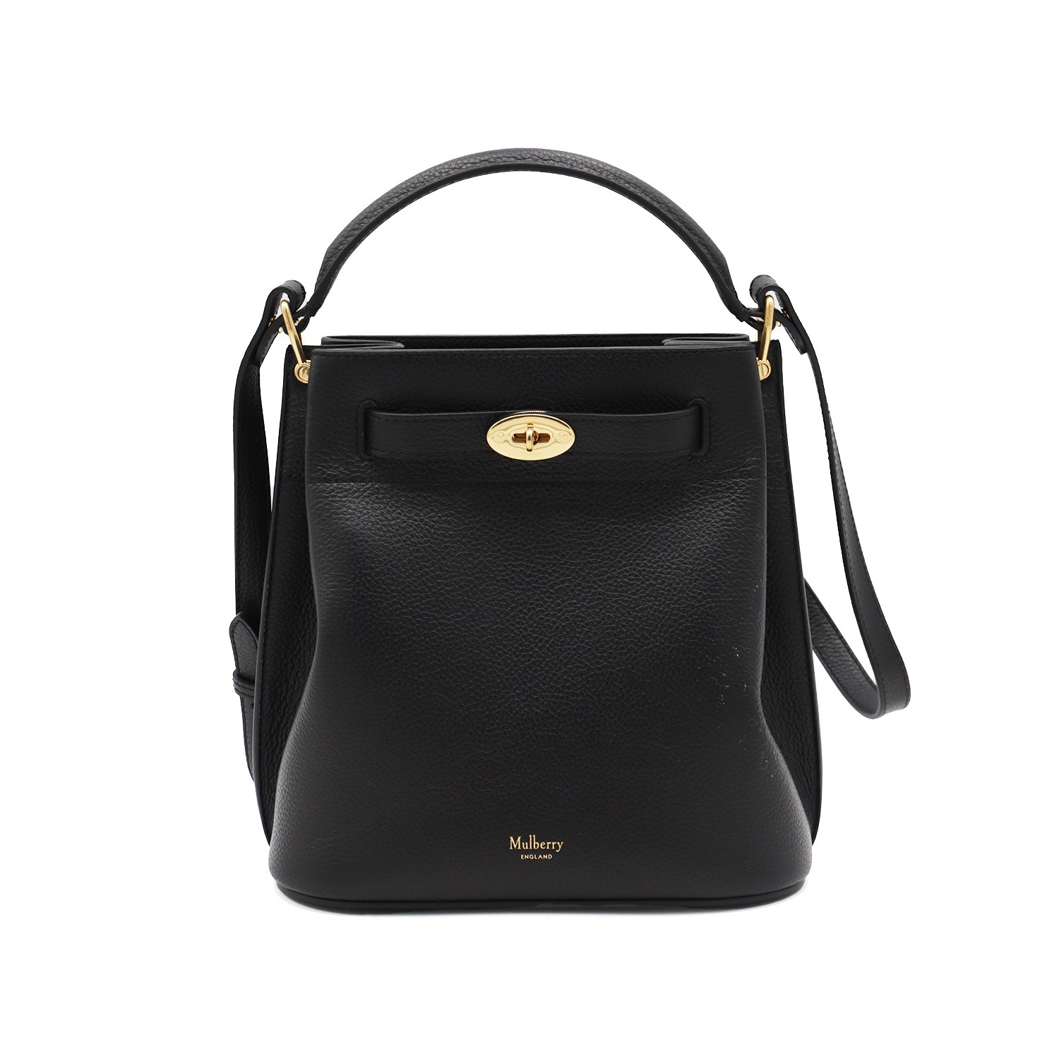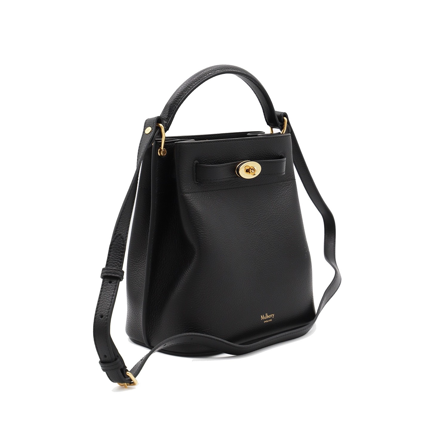Black leather Islington Bucket satchel from Mulberry featuring frontal fastening, gold tone hardware, strap and top handle.