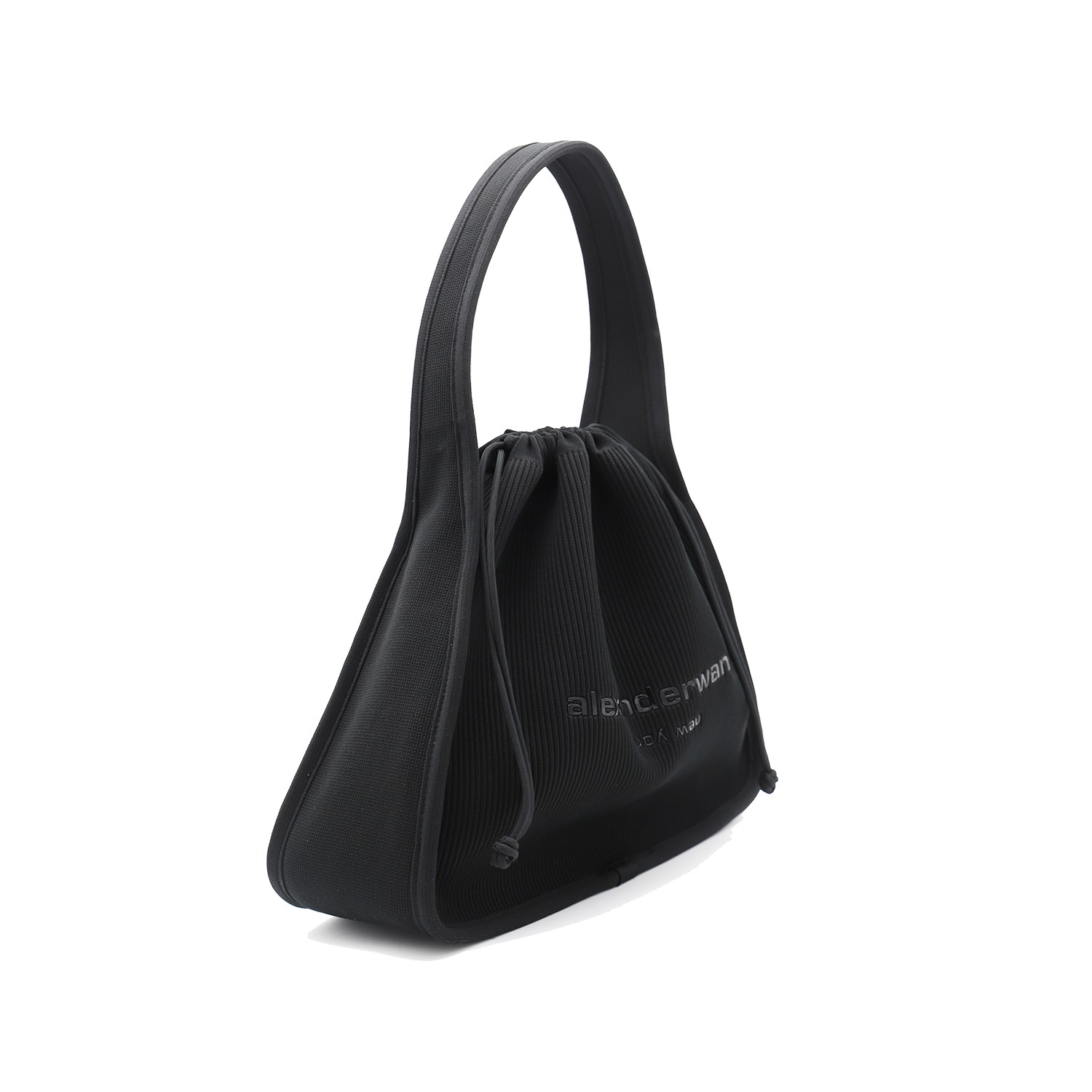 Black satchel from Alexander Wang featuring top handle, frontal logo and upper fastening.