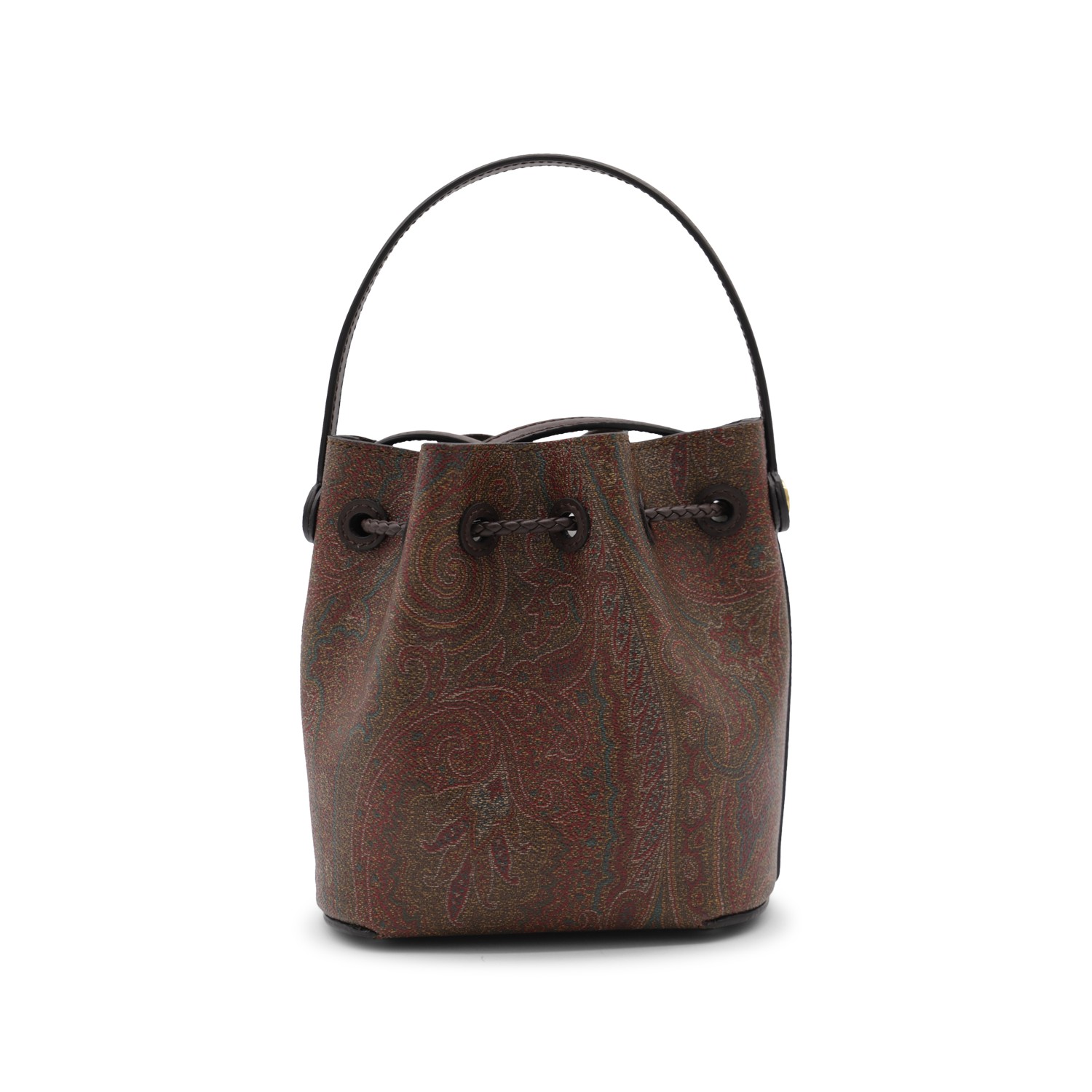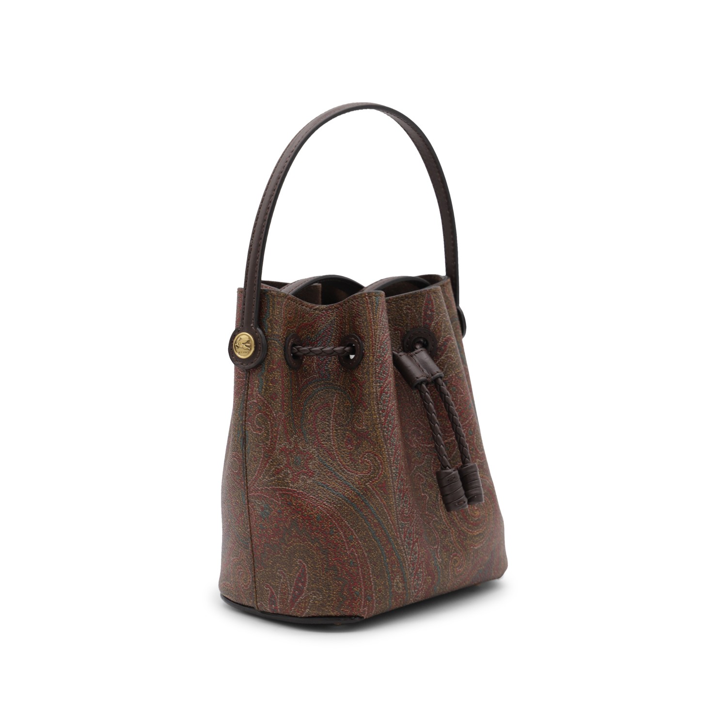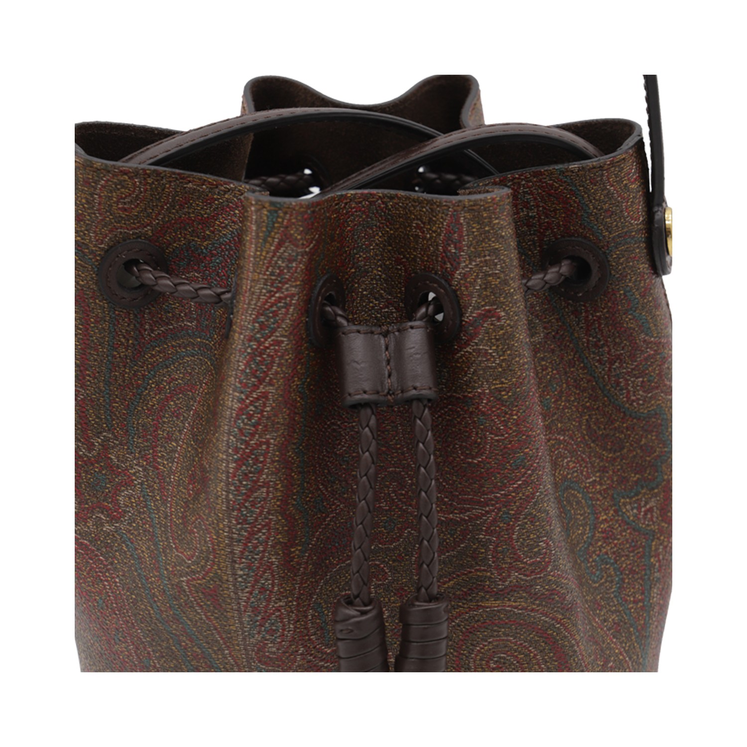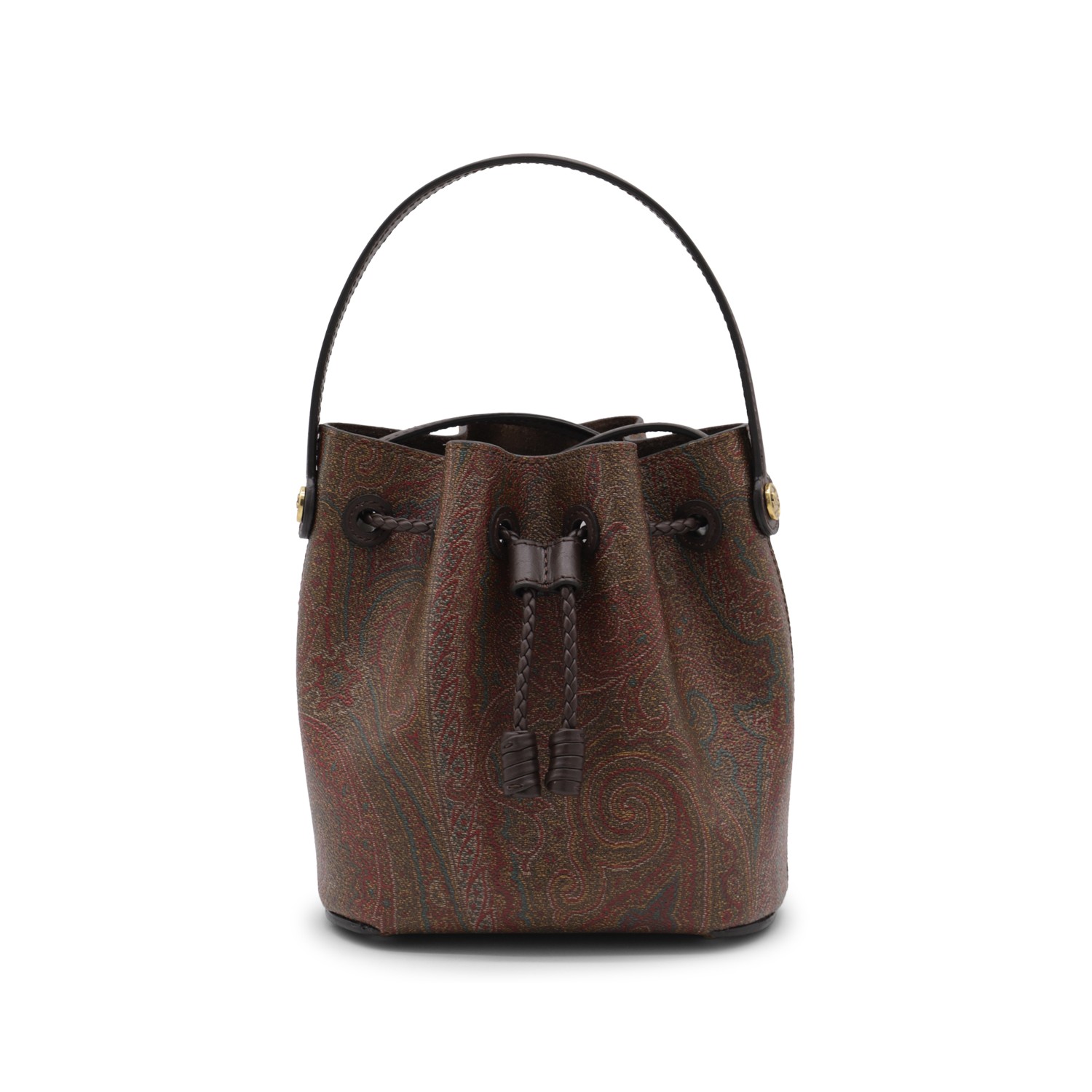 Brown cotton satchel from Etro featuring top handle, adjustable shoulder strap, braided drawstring closure, main compartment and gold tone hardware.