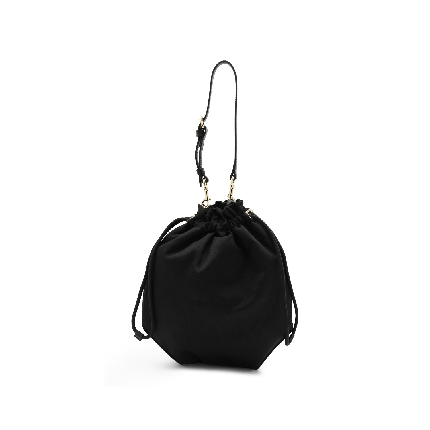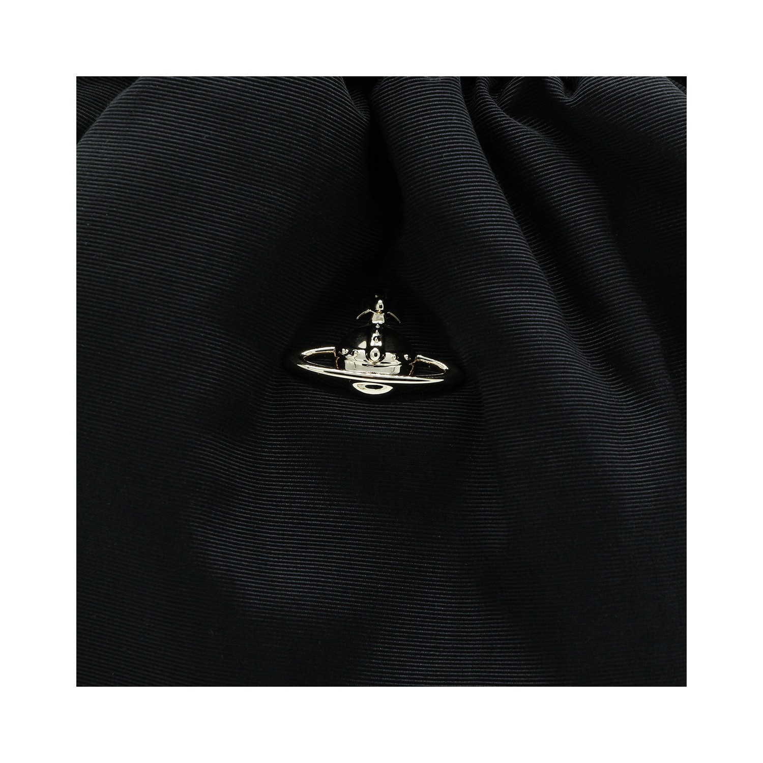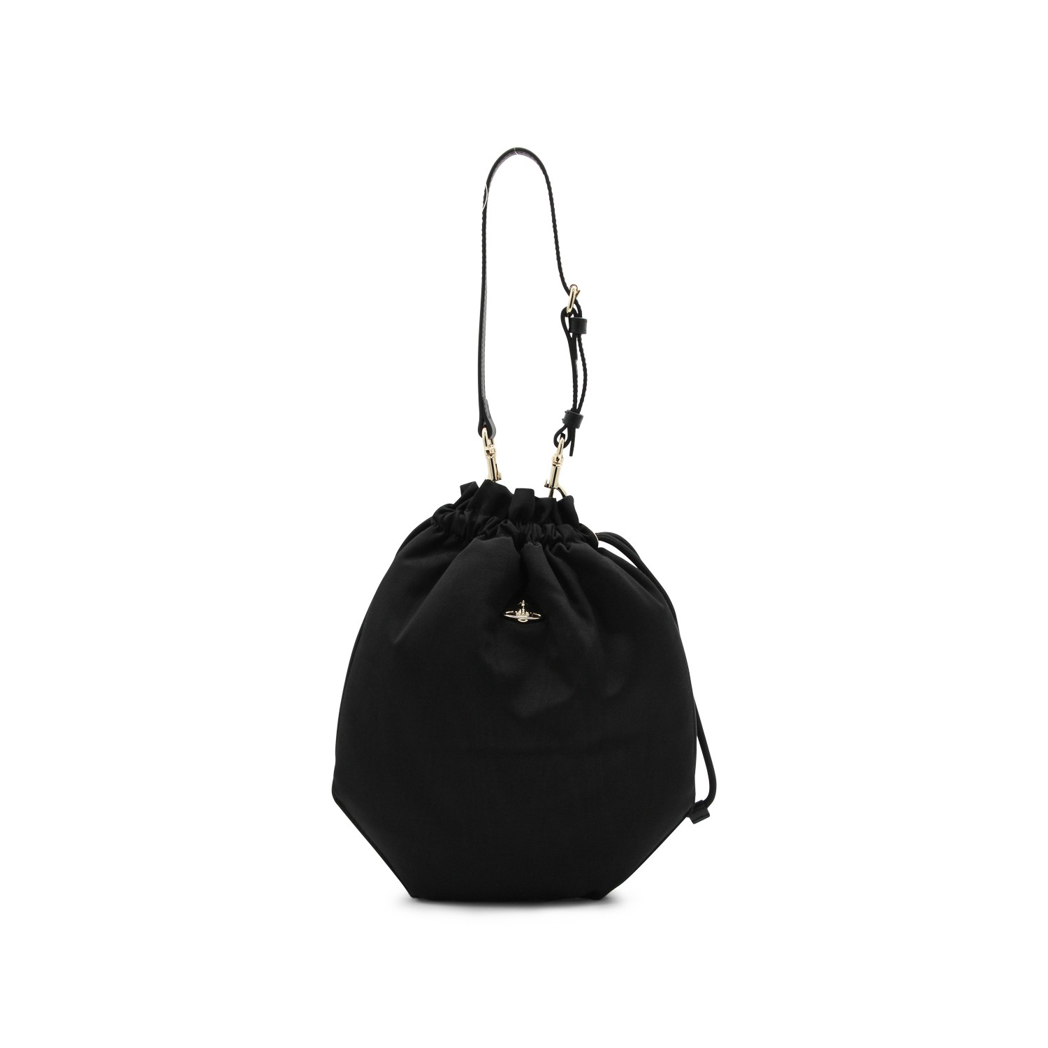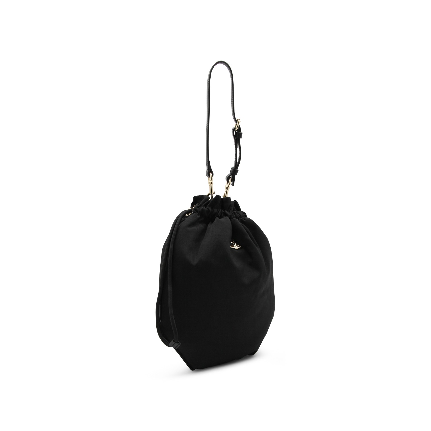Black viscose satchel from Vivienne Westwood featuring strap, drawstring fastening, frontal logo and gold tone hardware.