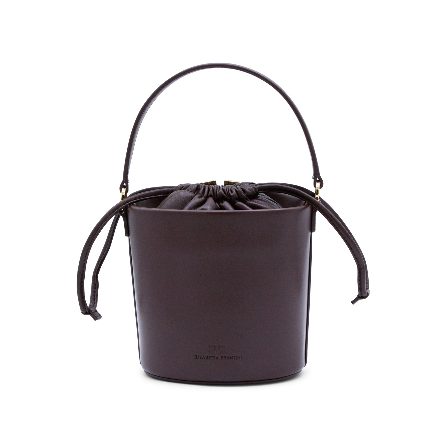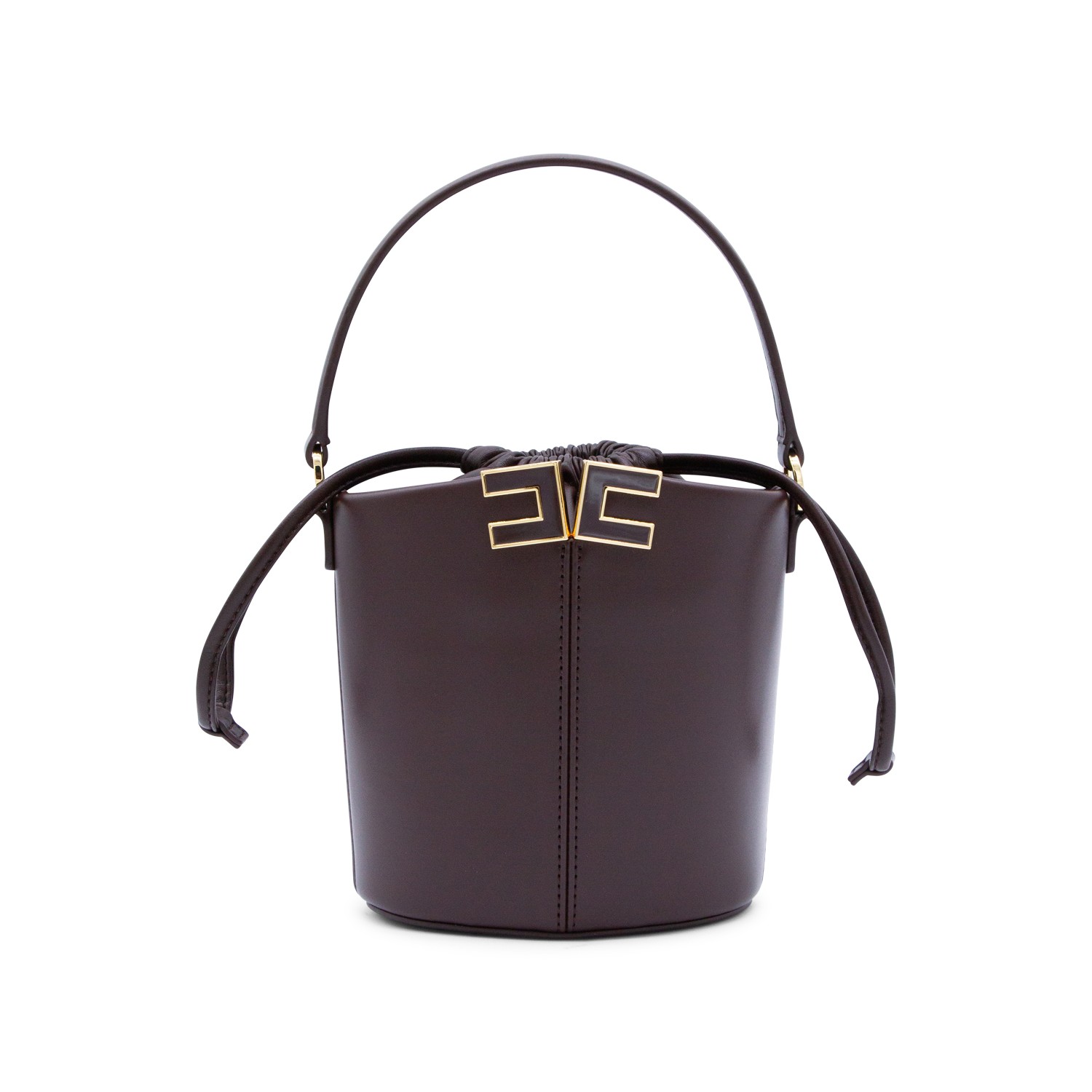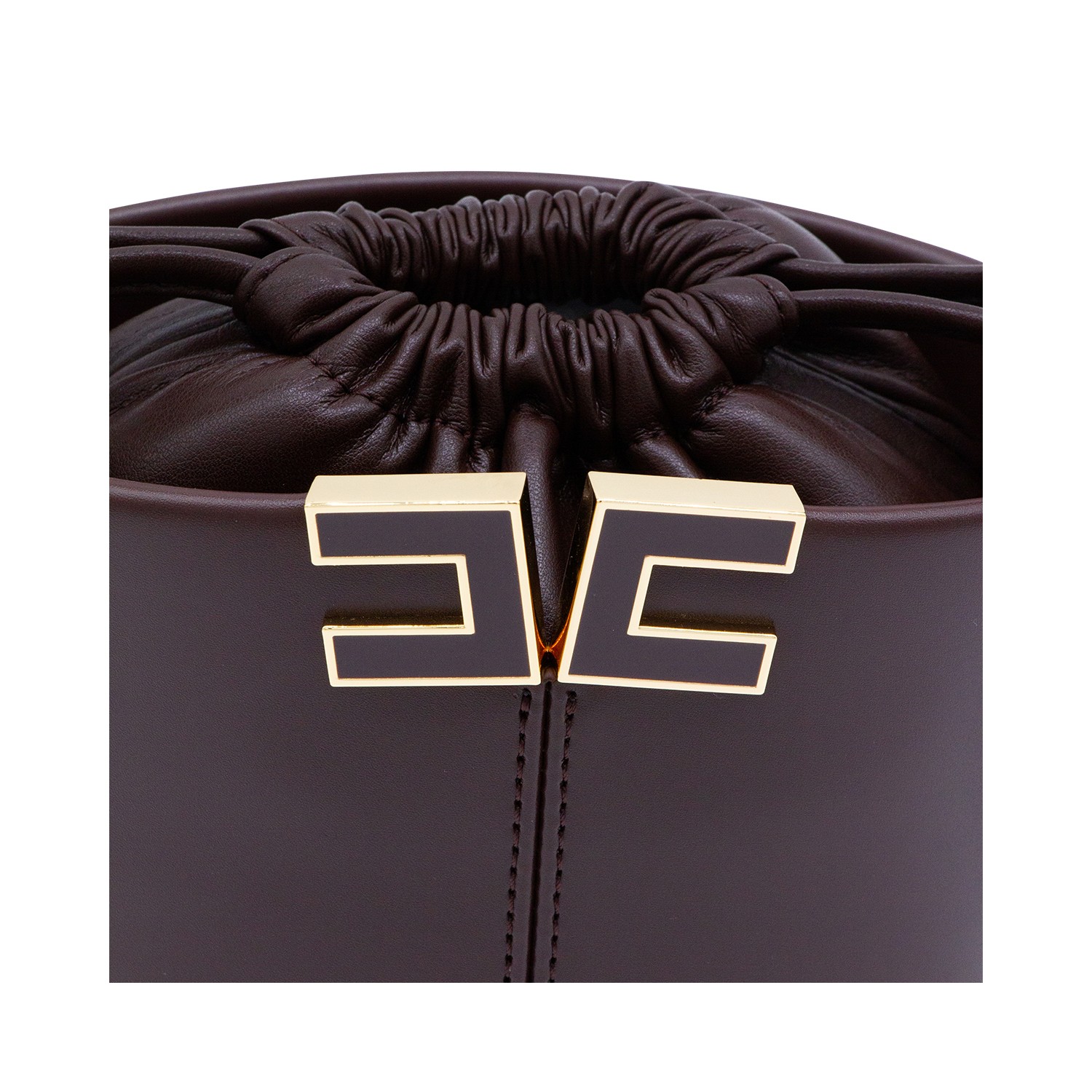 Brown satchel from Elisabetta Franchi featuring single top handle, removable chain link shoulder strap, drawstring closure and main compartment.
