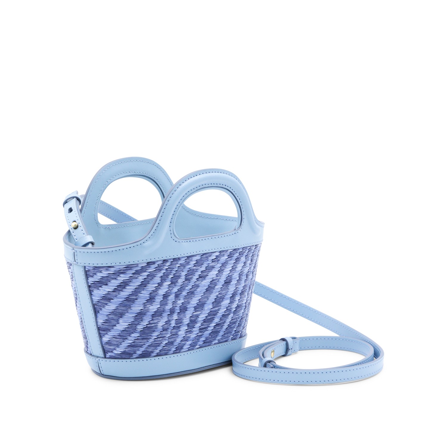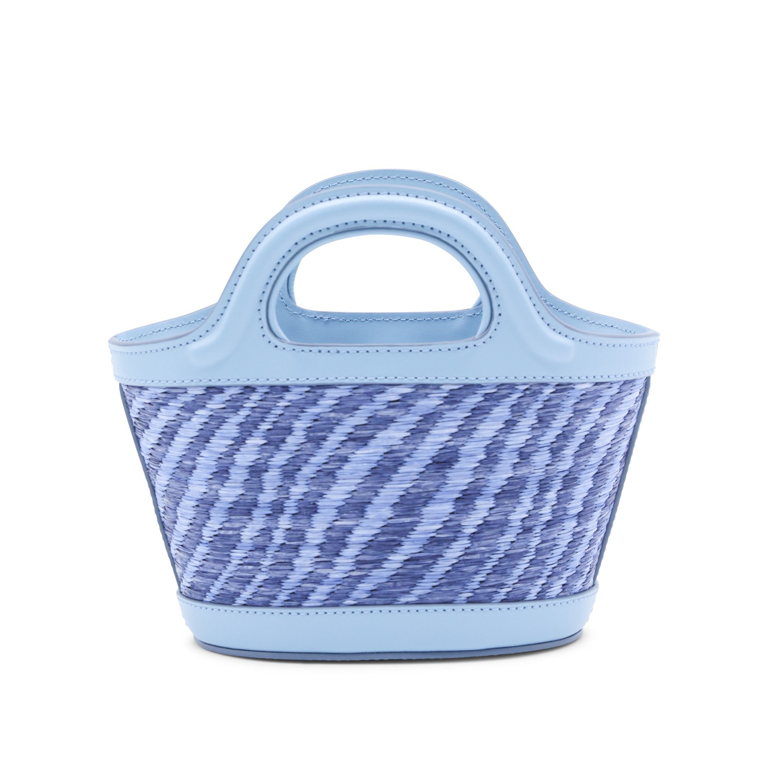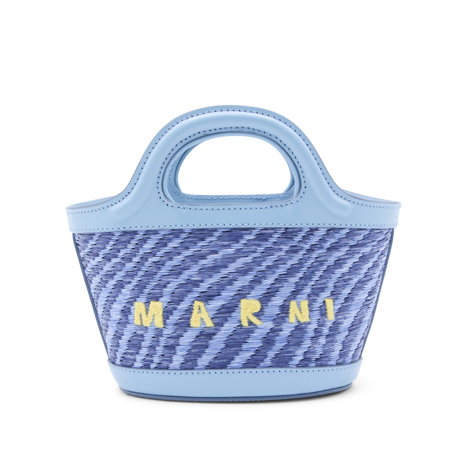 Light blue satchel from Marni featuring rigid top handles, raffia design, snap button closure, adjustable and removable shoulder strap, logo and main compartment.