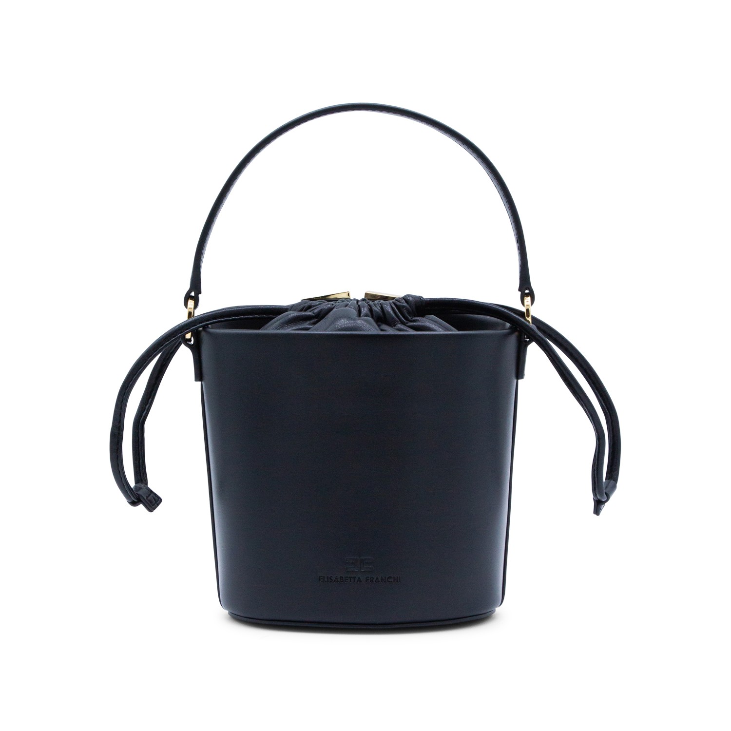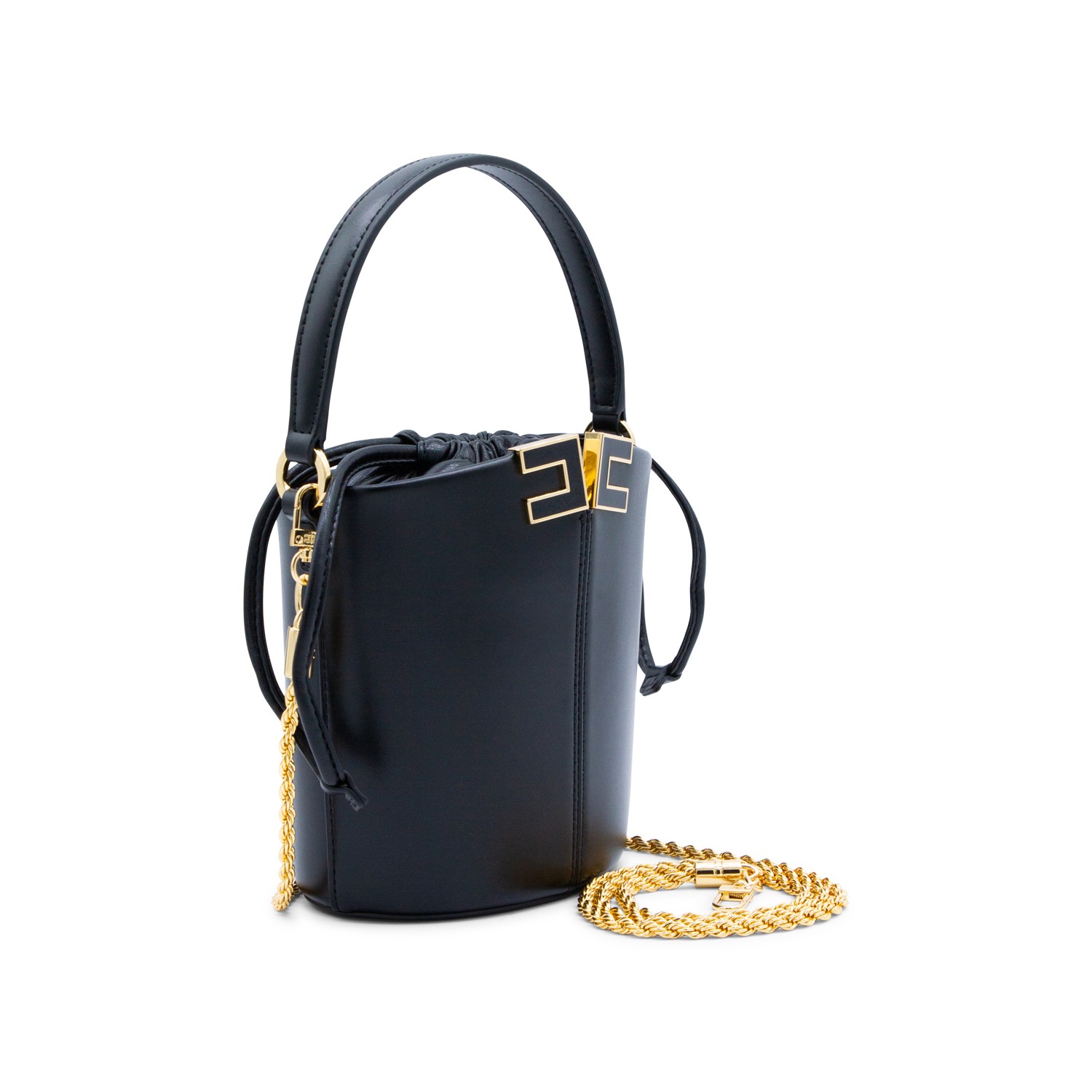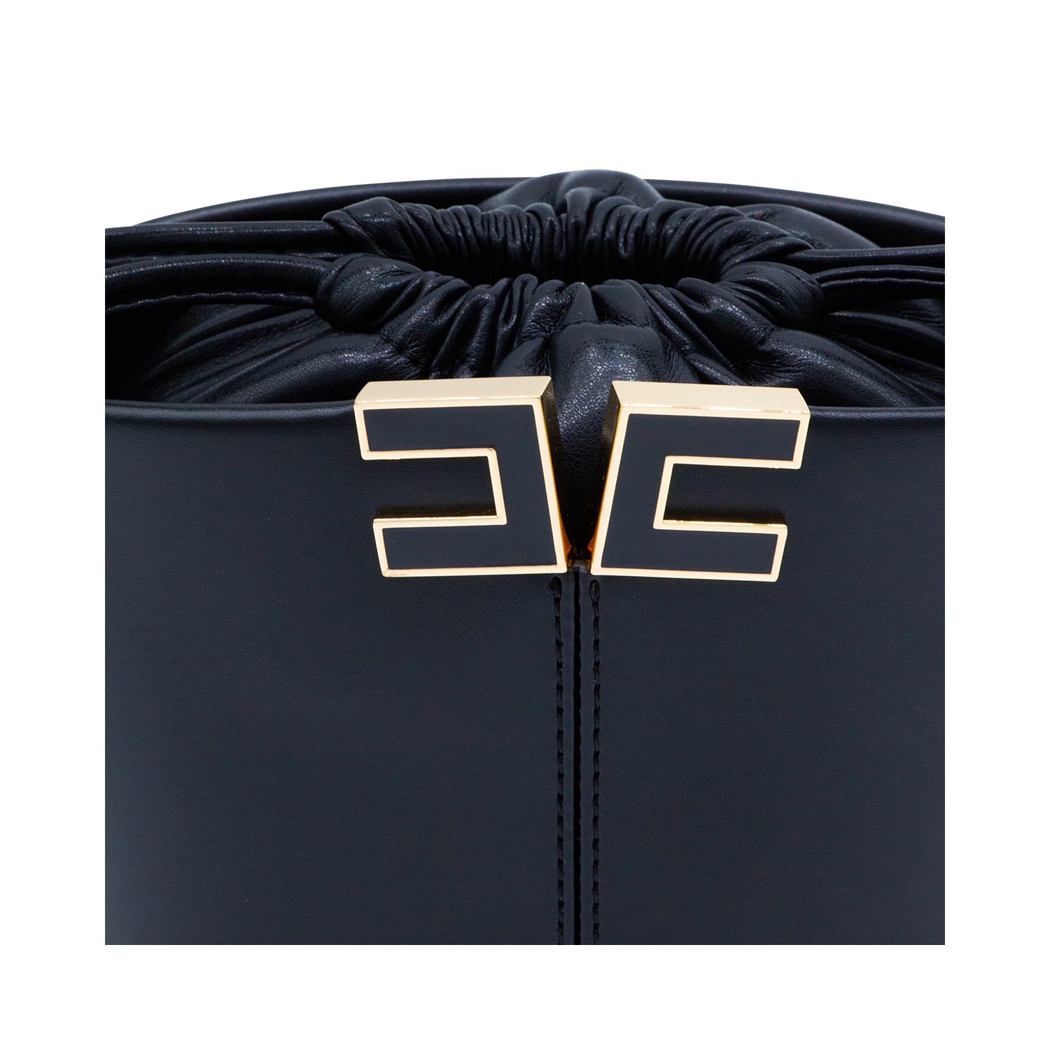 Black satchel from Elisabetta Franchi featuring top handle, drawstring fastening, gold tone hardware with logo and inside pocket.