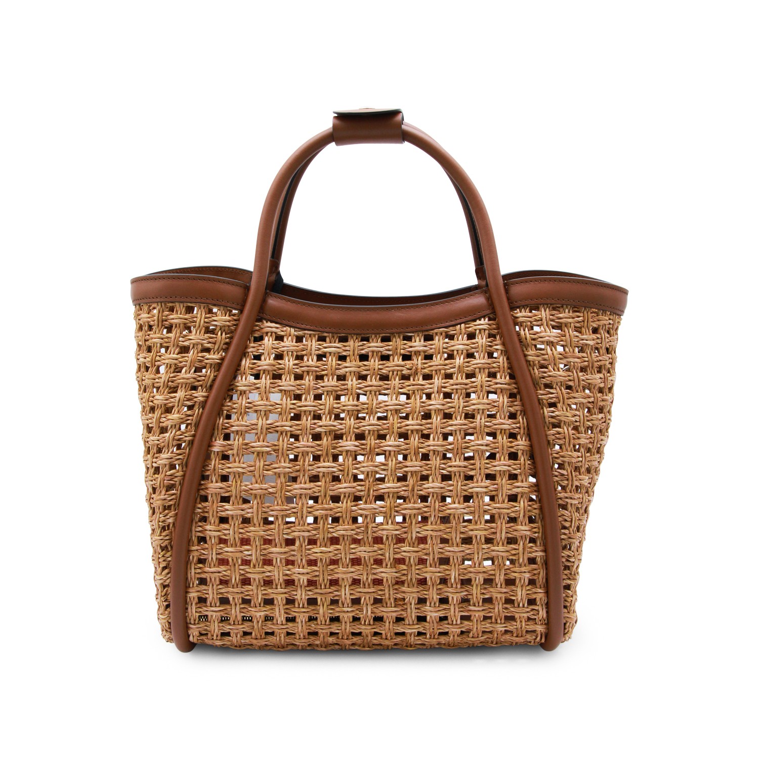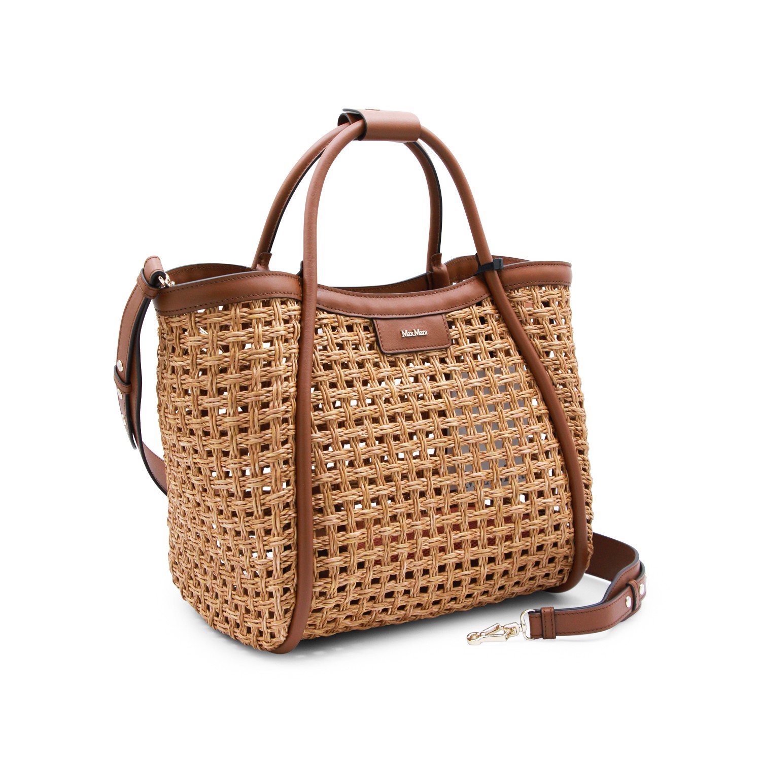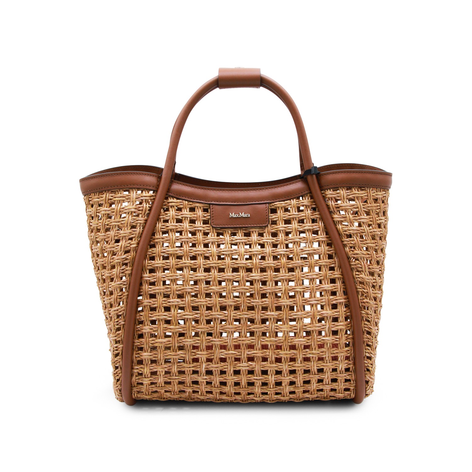 Natural satchel from Max Mara featuring top handle, frontal logo patch, trasparence, raffia and leather details.