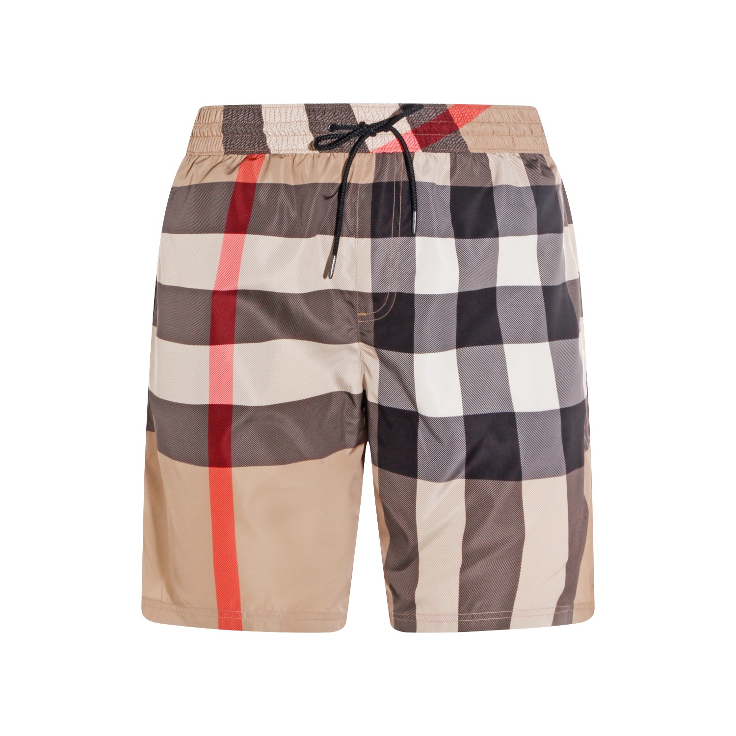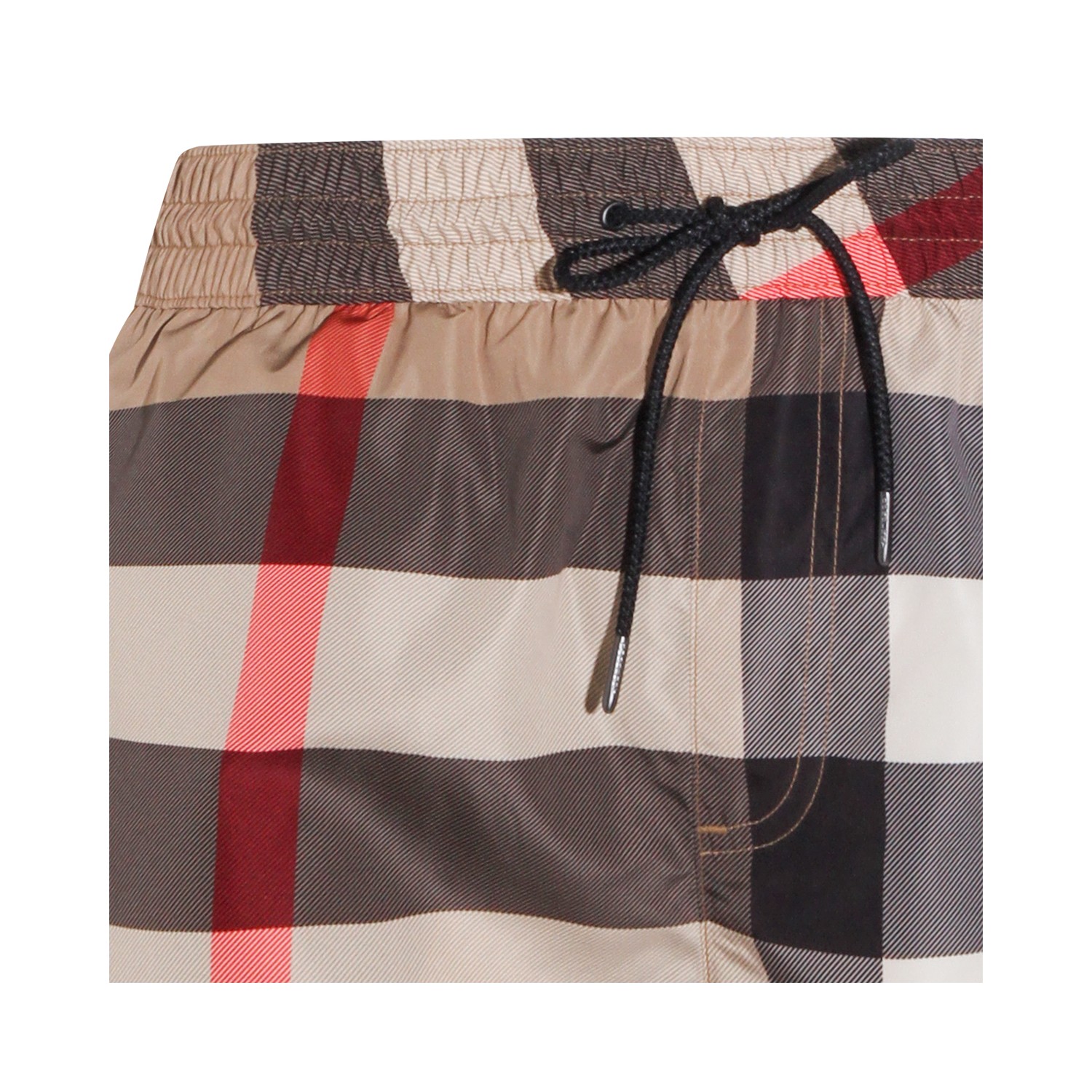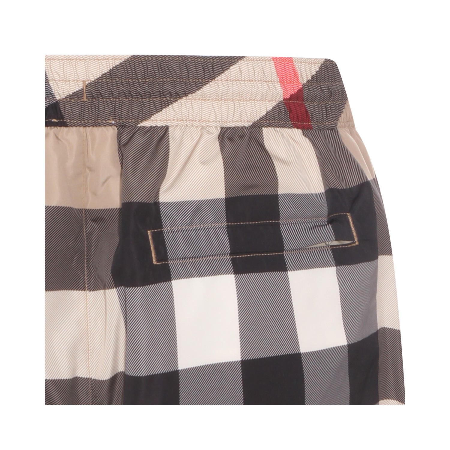 Beige boxer beachwear from Burberry featuring elasticated waist with drawstring, side slip pocket, back zip pocket, Check pattern and loose fit.