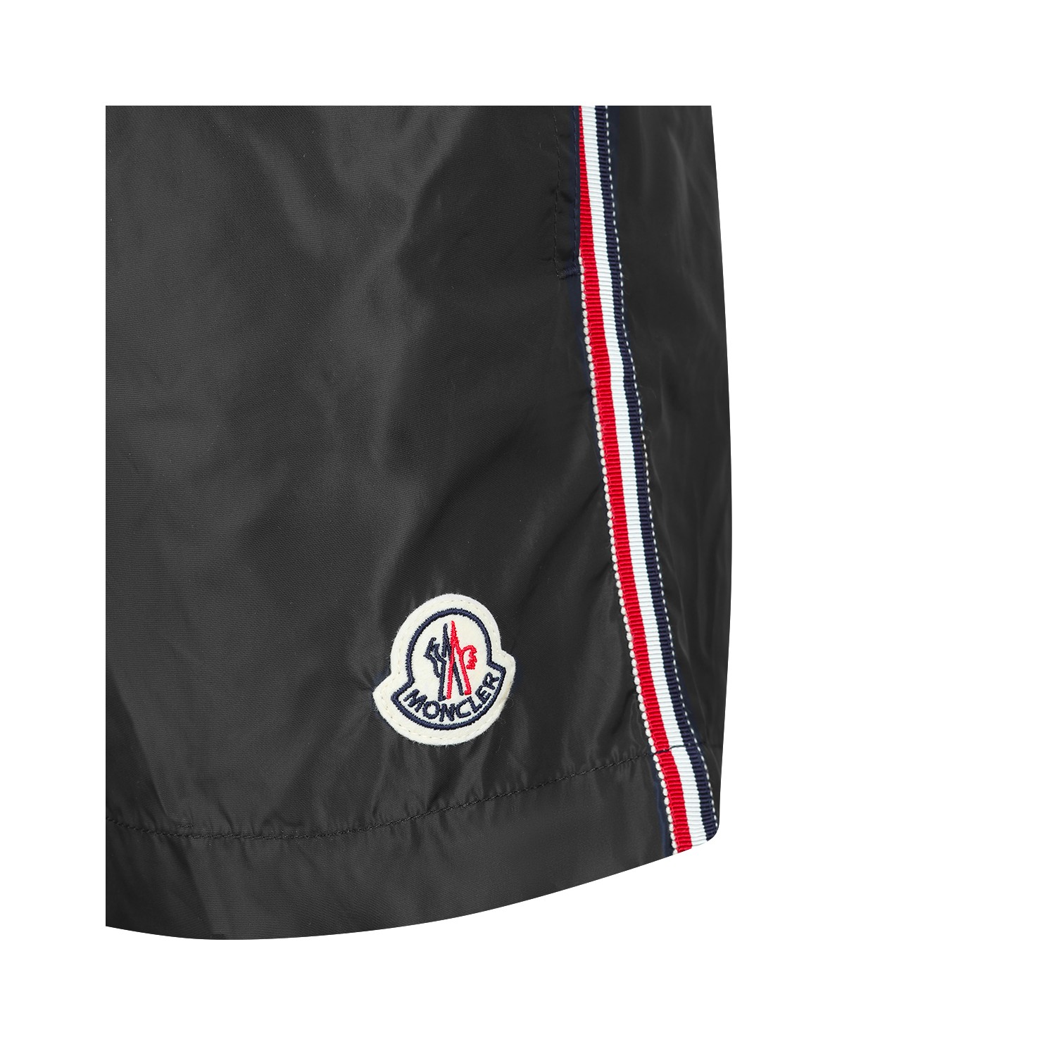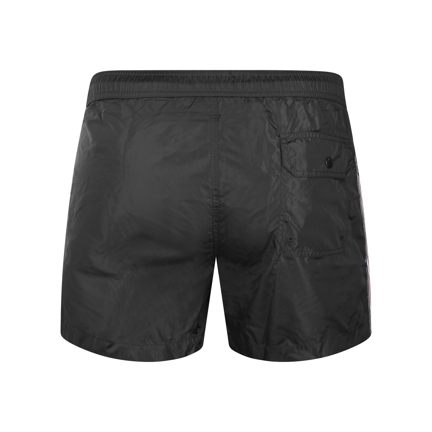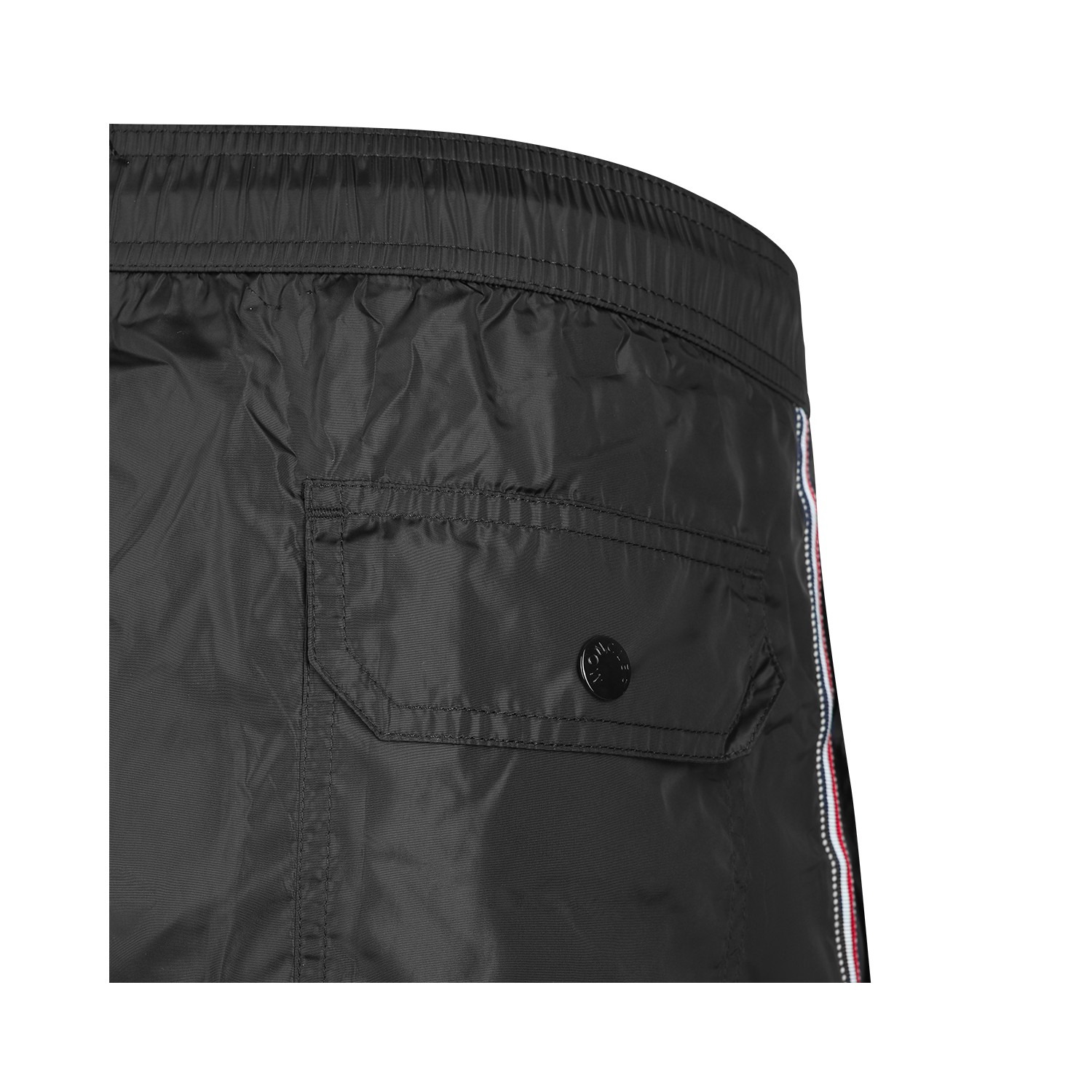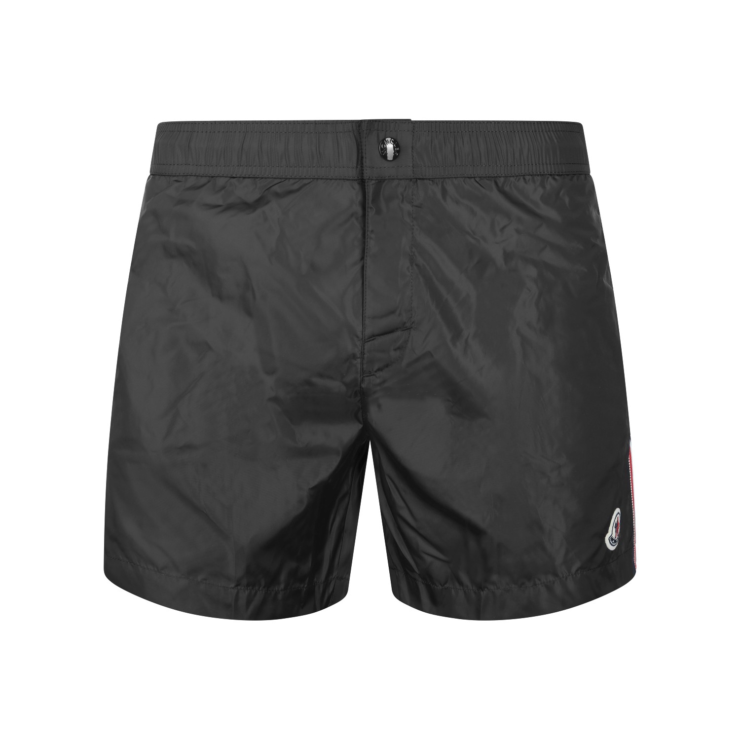 Black beachwear from Moncler featuring elastic waist, frontal button closure, logo patch and regular fit.