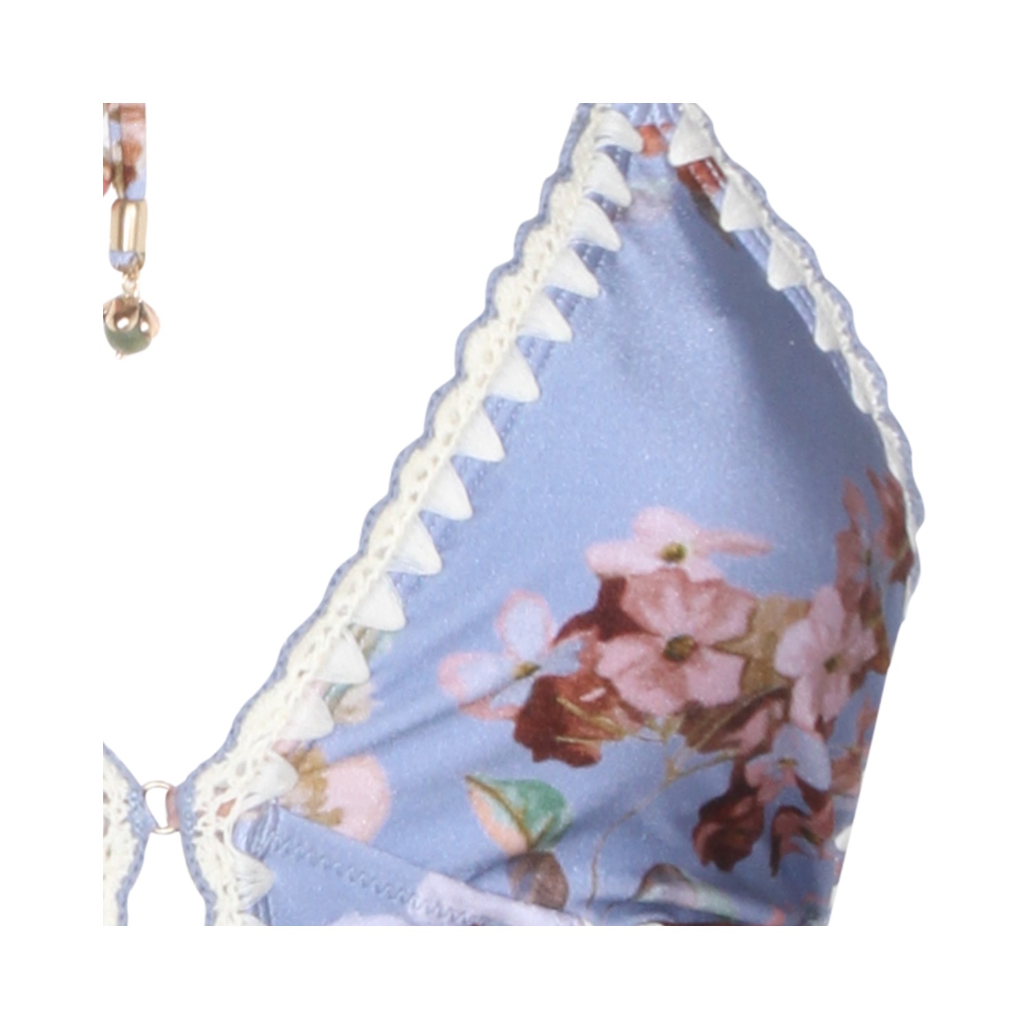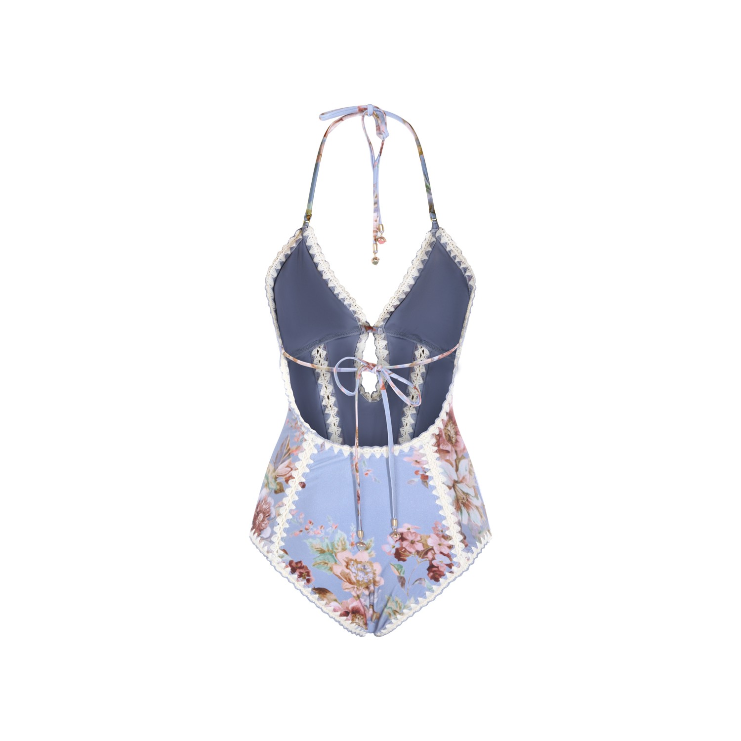 Light blue beachwear from Zimmermann featuring one piece, open back, necklace drawstrings and flower print.