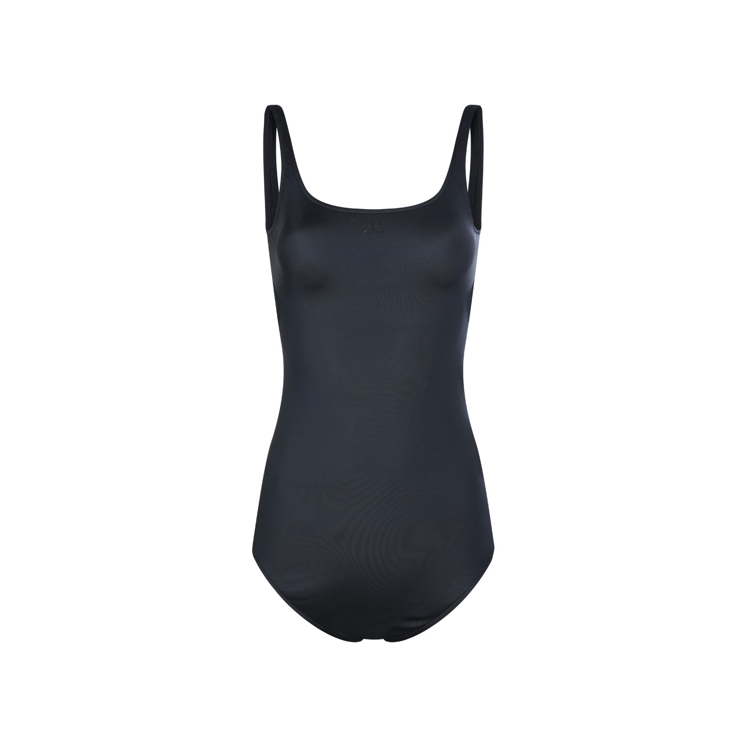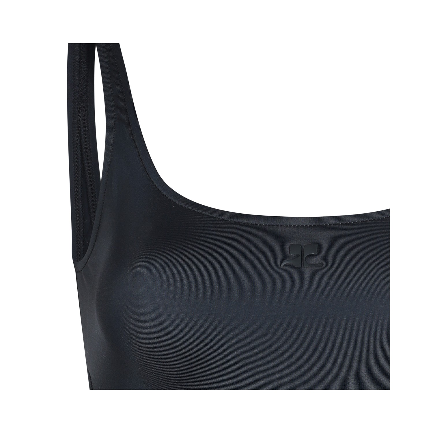 Black beachwear from Courreges featuring round deep collar and sleeveless.