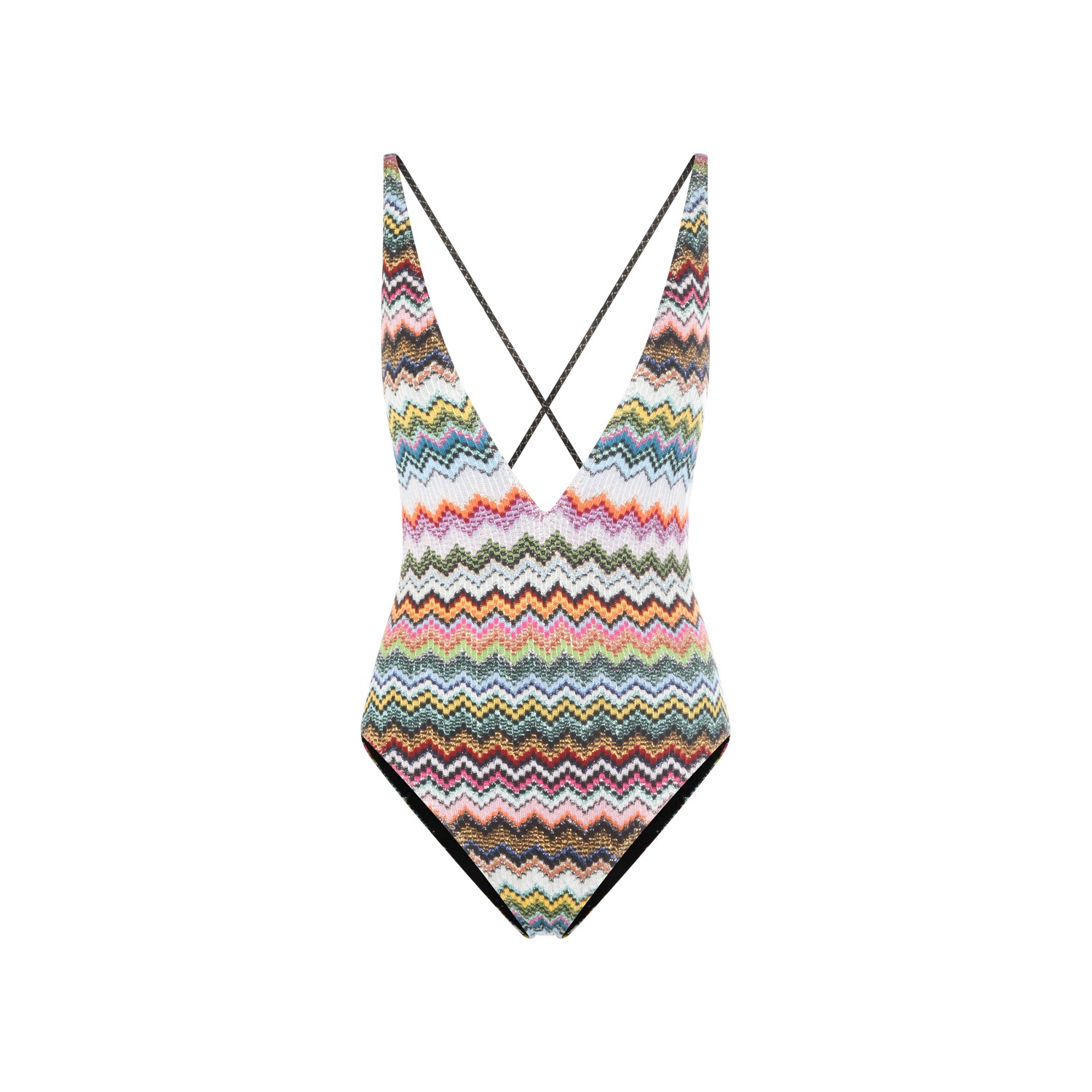 Colorful beachwear from Missoni featuringV-neck deep collar, sleeveless and all over print.