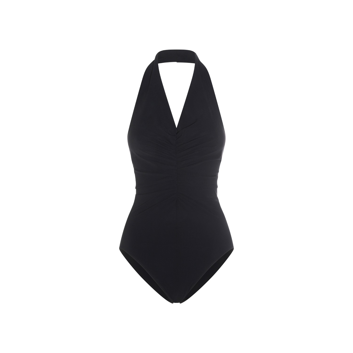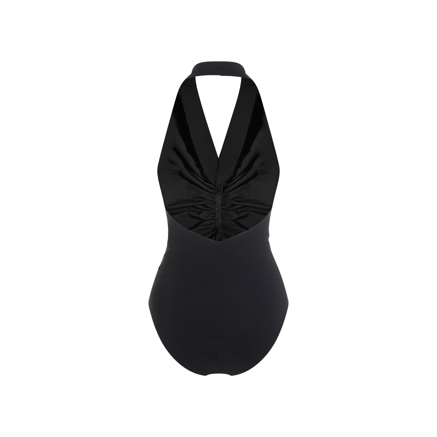 Black one piece beachwear from Rick Owens featuring regualr leg-lifting, V neck and tank top line.