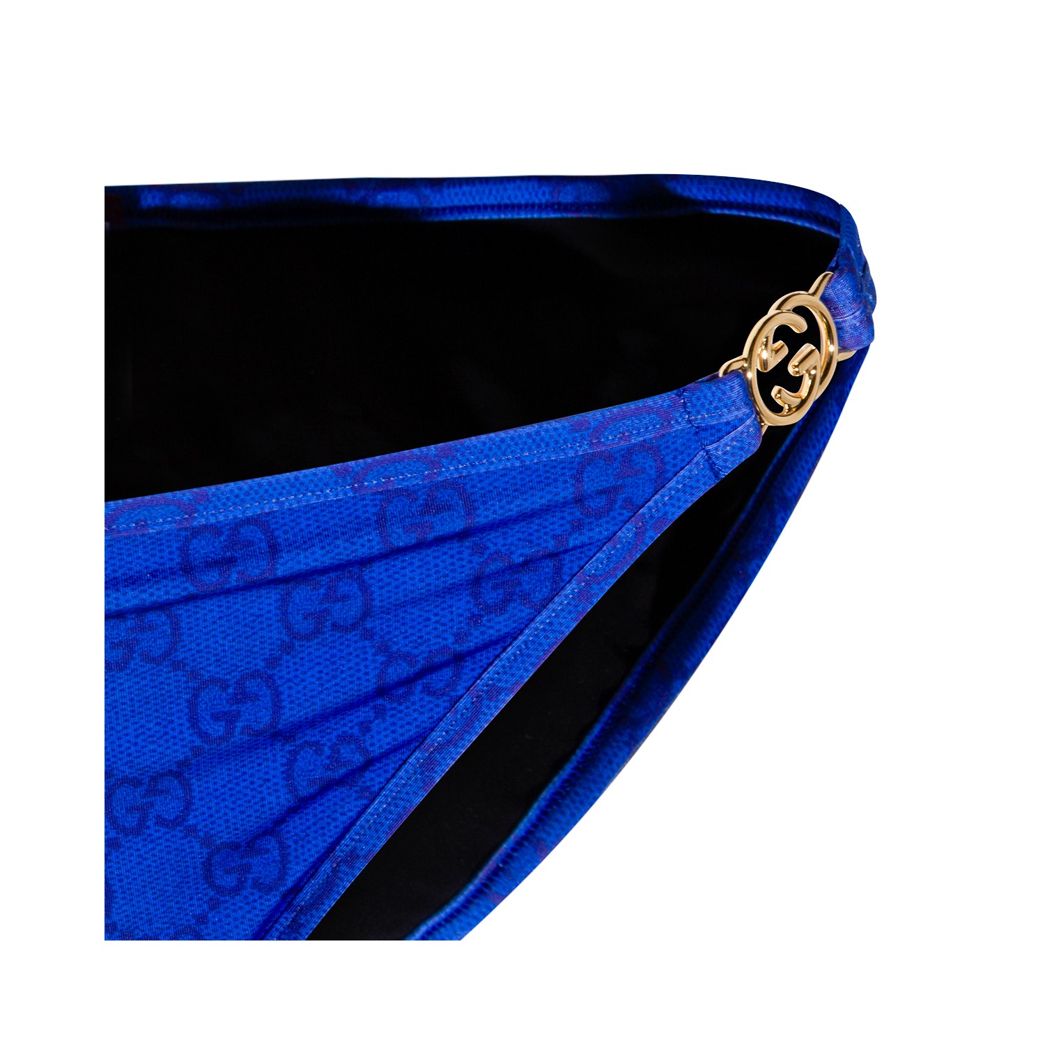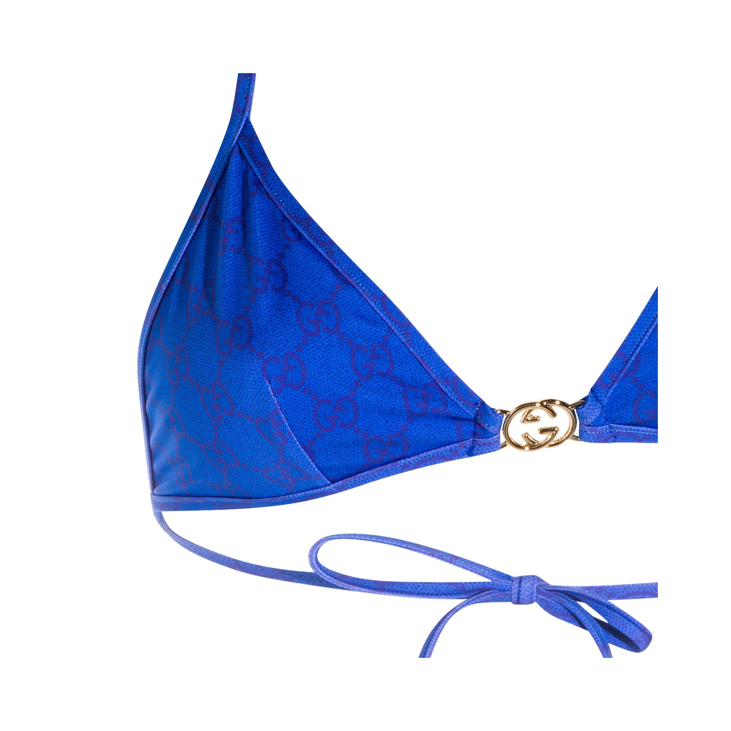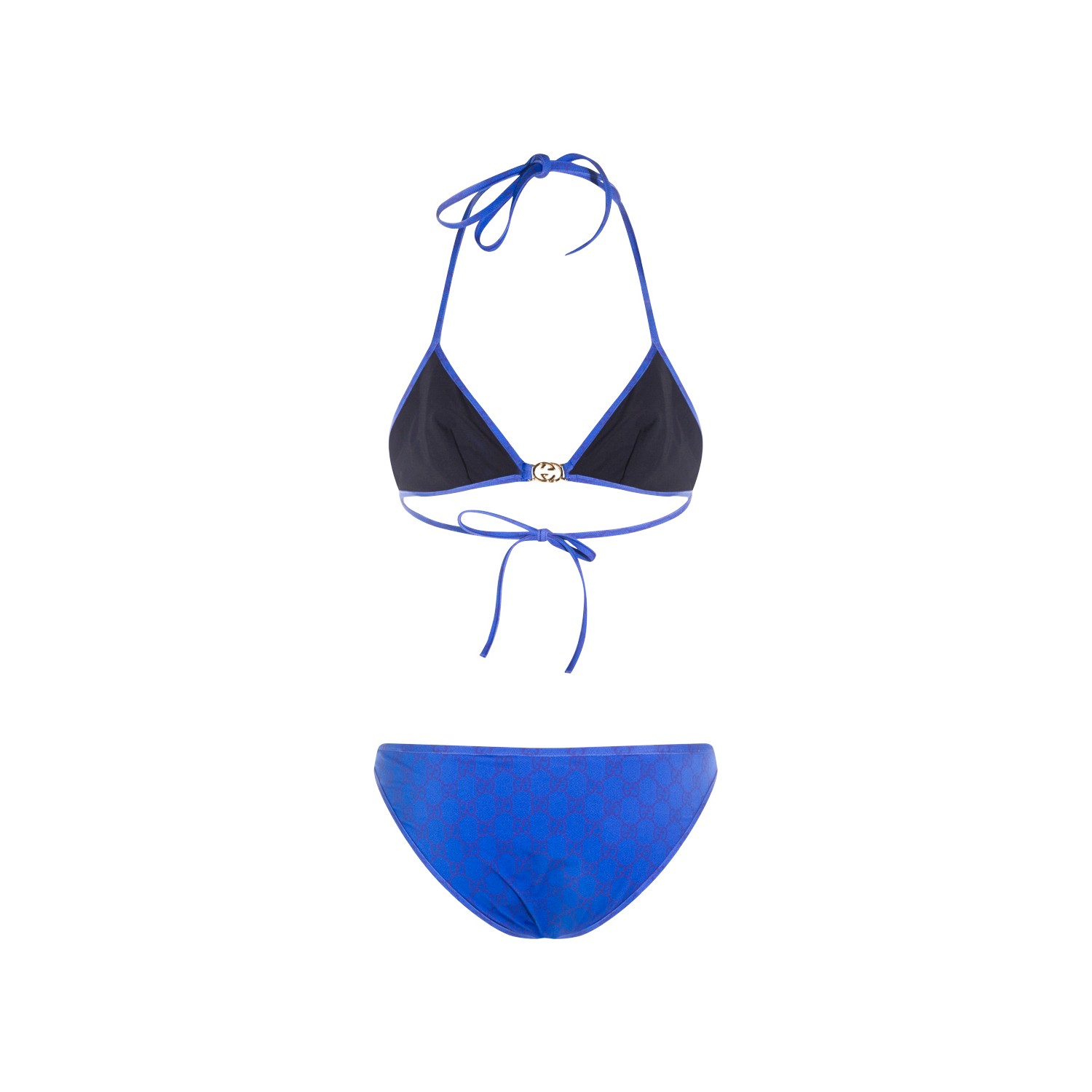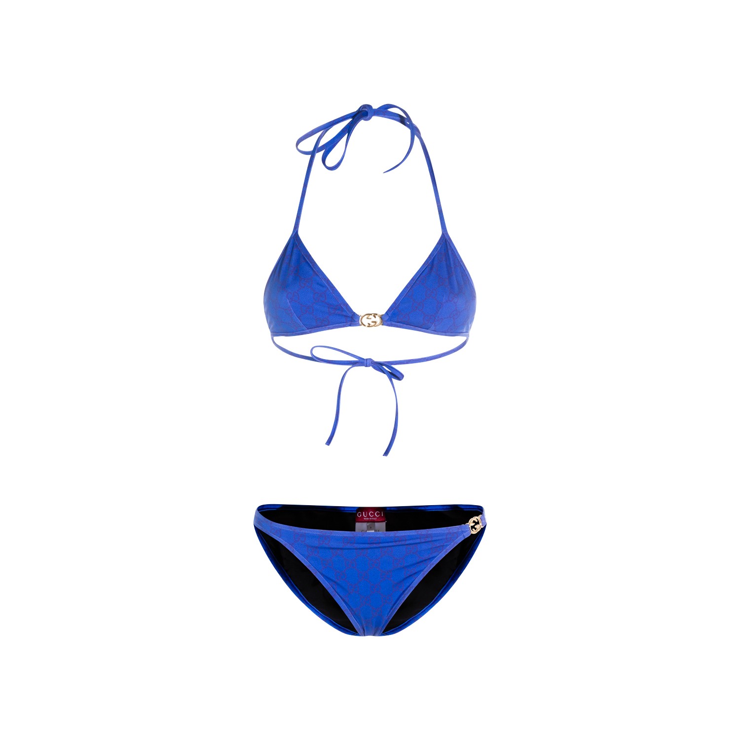 Blue beachwear from Gucci featuring two pieces, laces fastening and gold tone hardware.