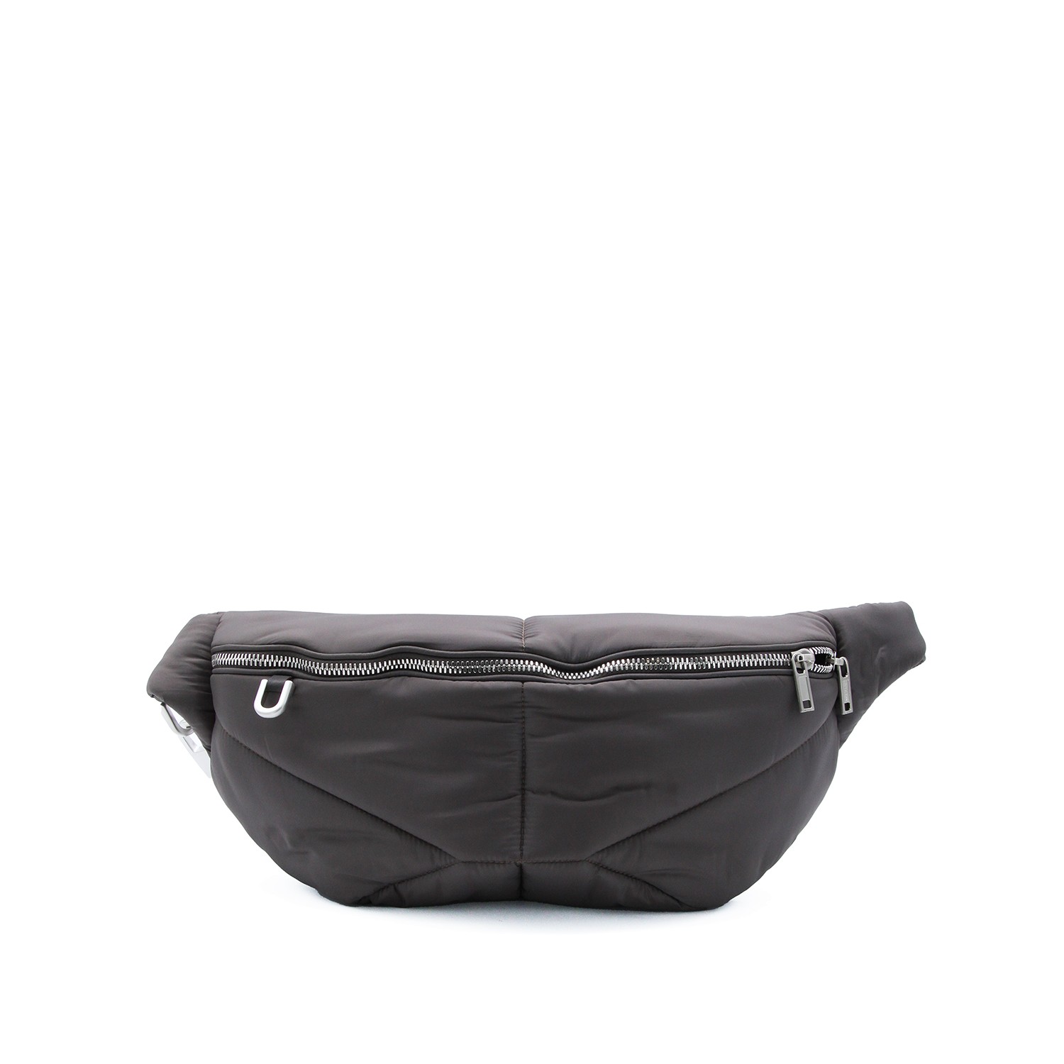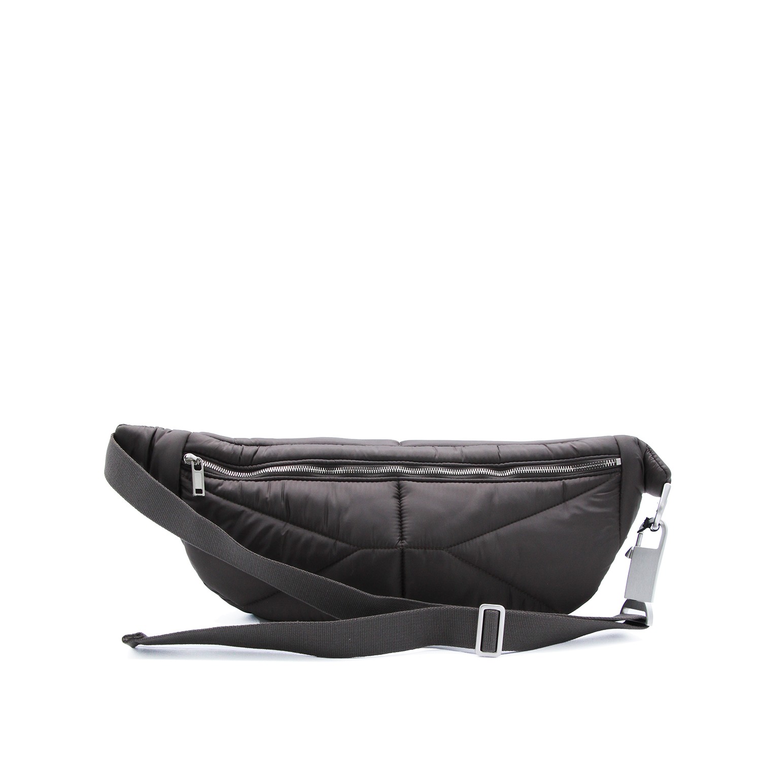 Dark grey Bumbag belt bag from Moncler + Rick Owens featuring ribbon belt with adjustable closure, zip closure, zip pocket, internal pockets, keychain and padded model.