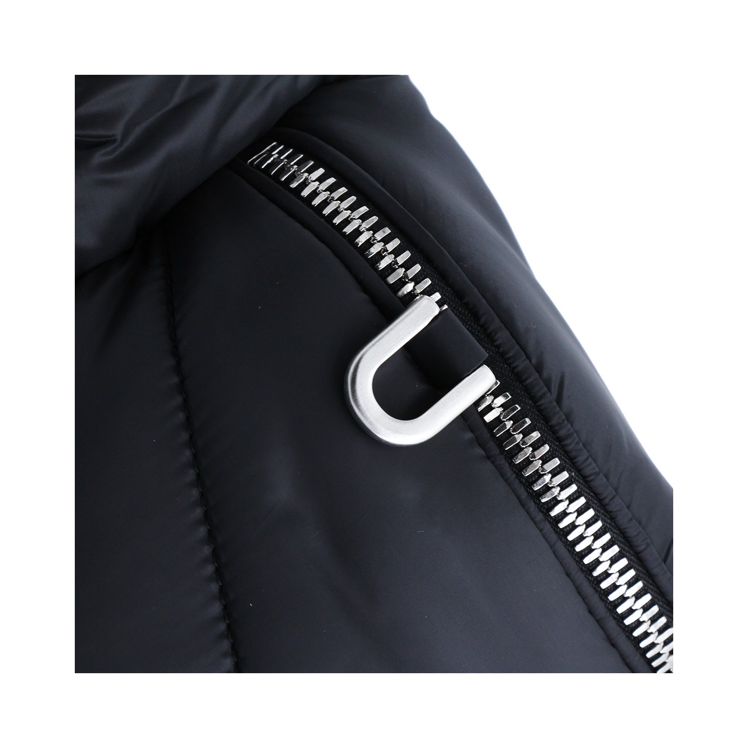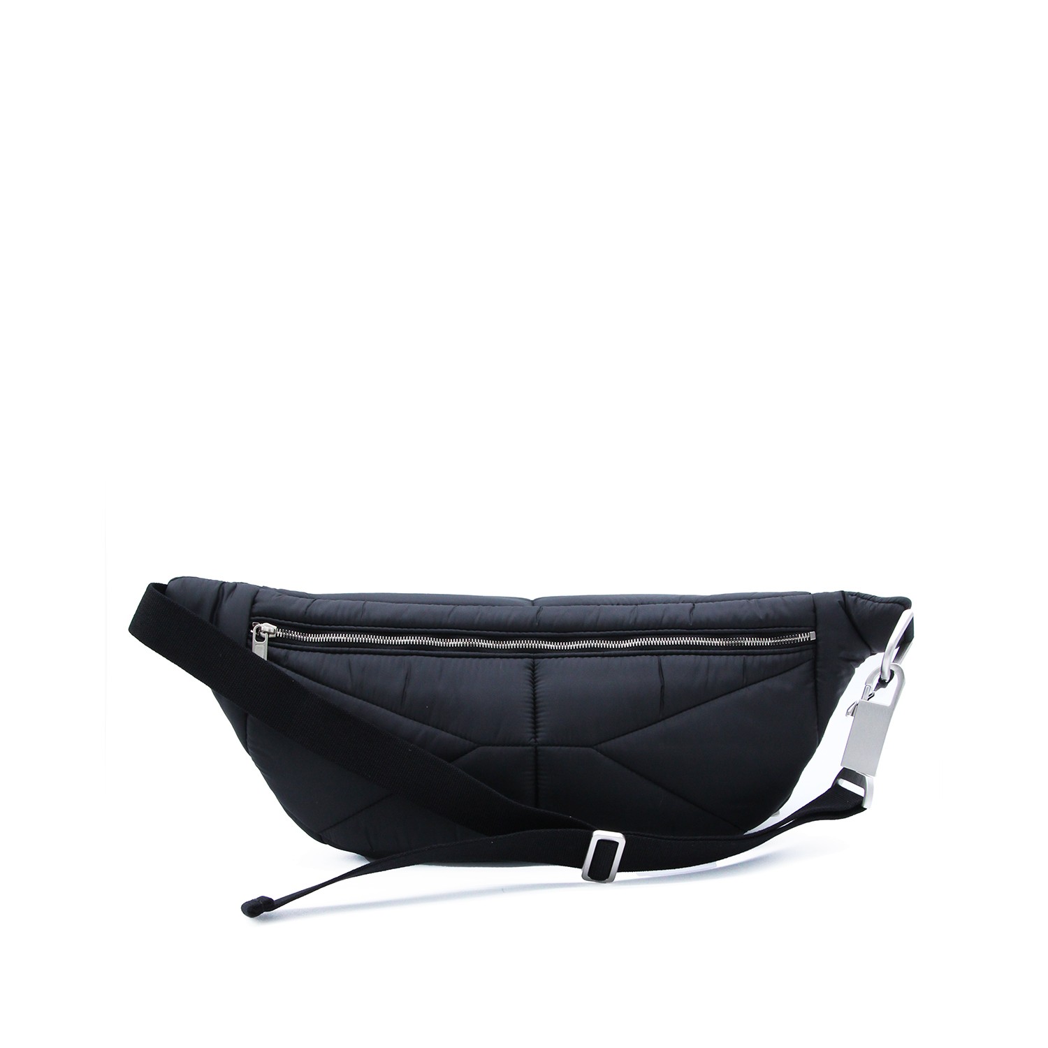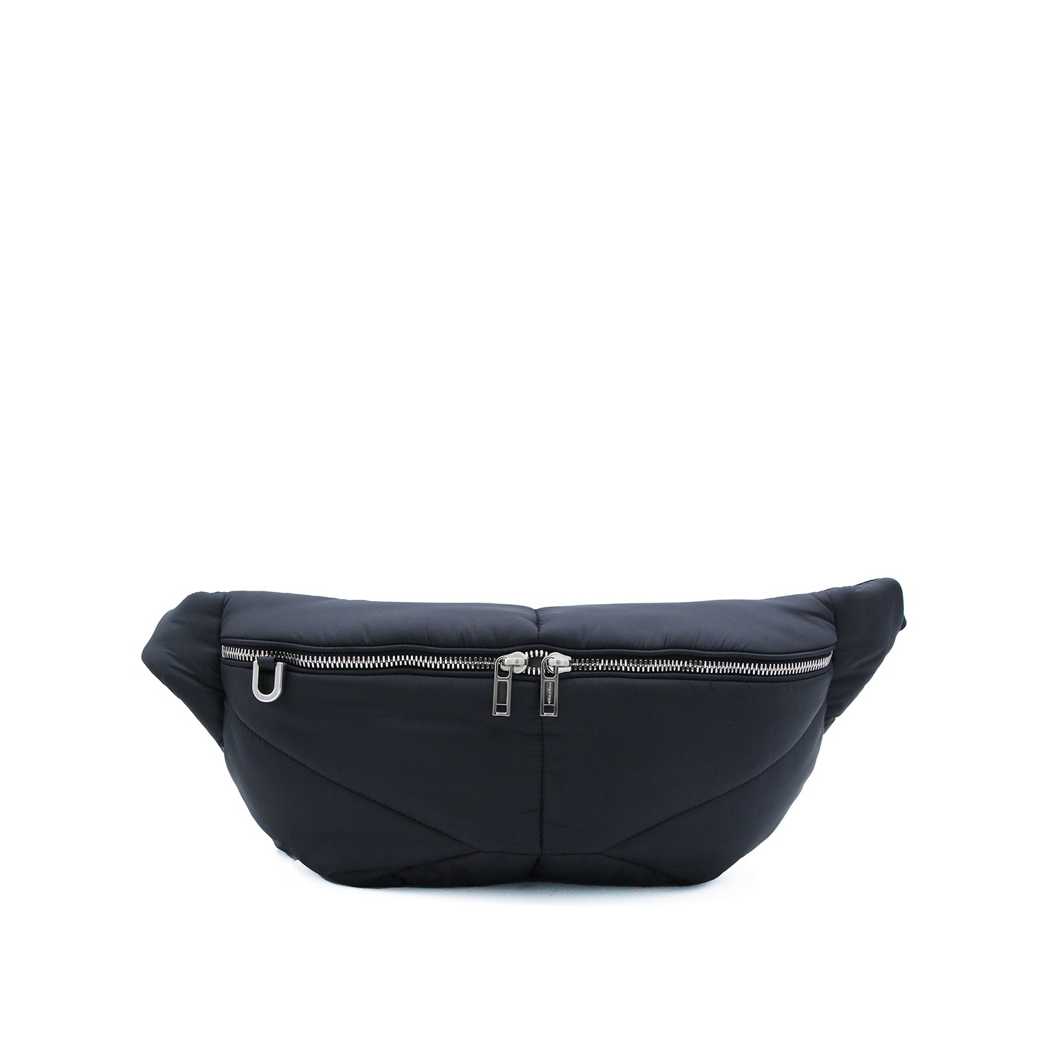 Black Bumbag belt bag from Moncler + Rick Owens featuring ribbon belt with adjustable closure, zip closure, zip pocket, internal pockets, keychain and padded model.