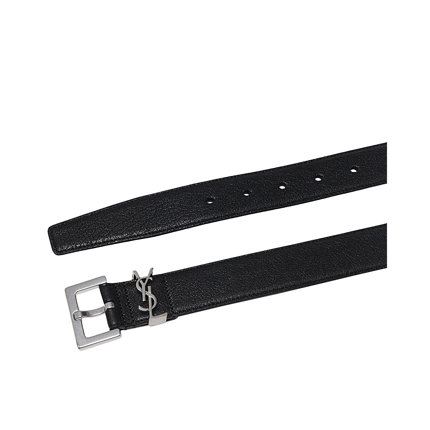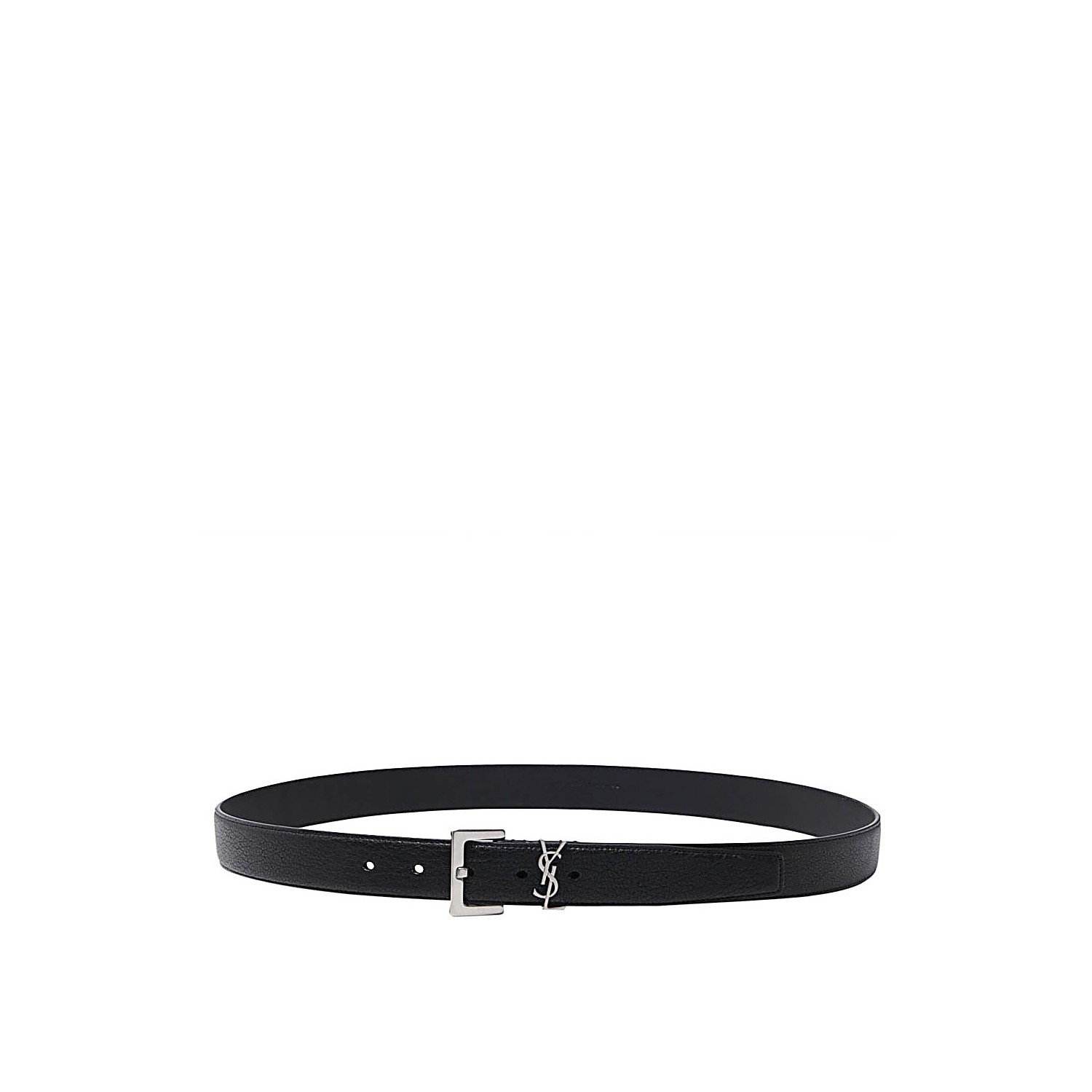 Black leather Cassandre belt from Saint Laurent featuring adjustable closure and buckle logo silver metal tone detail.