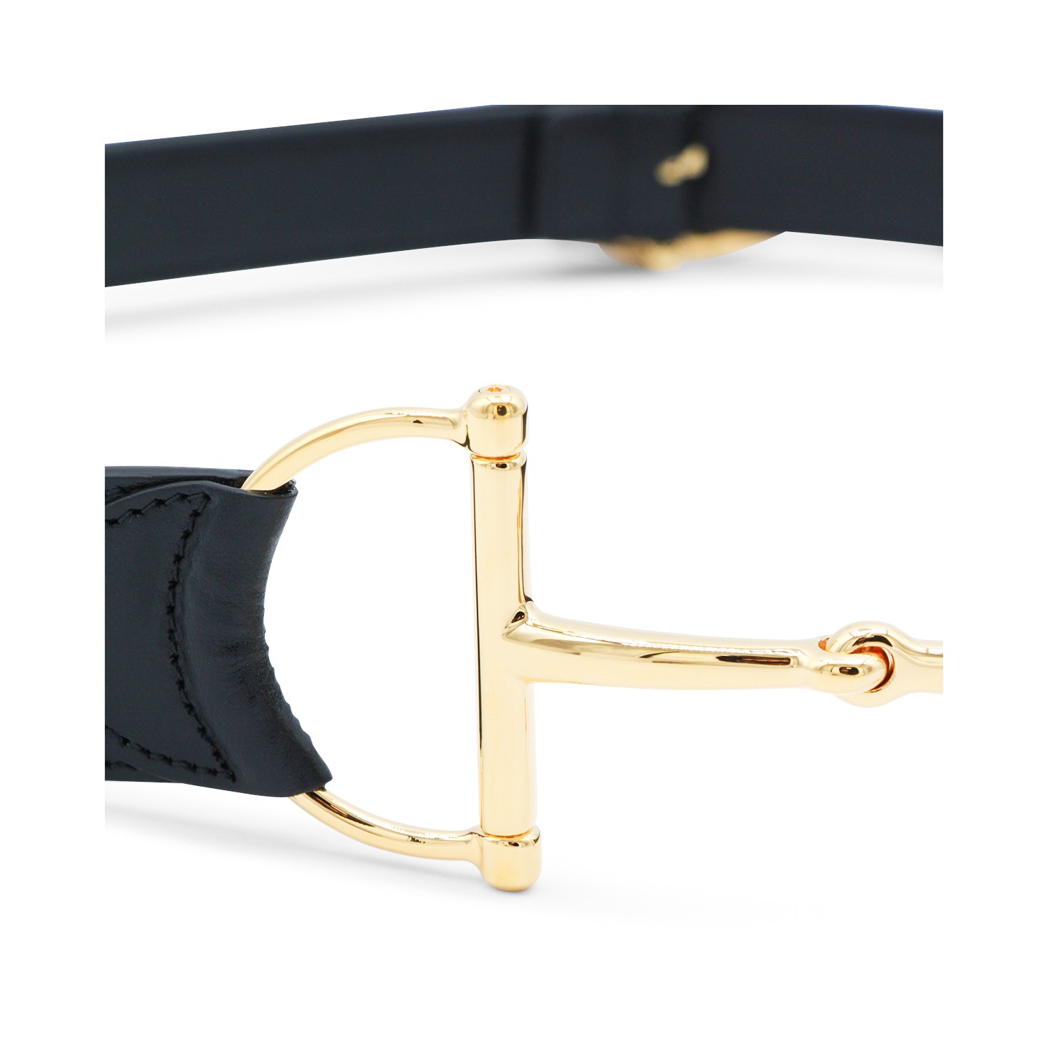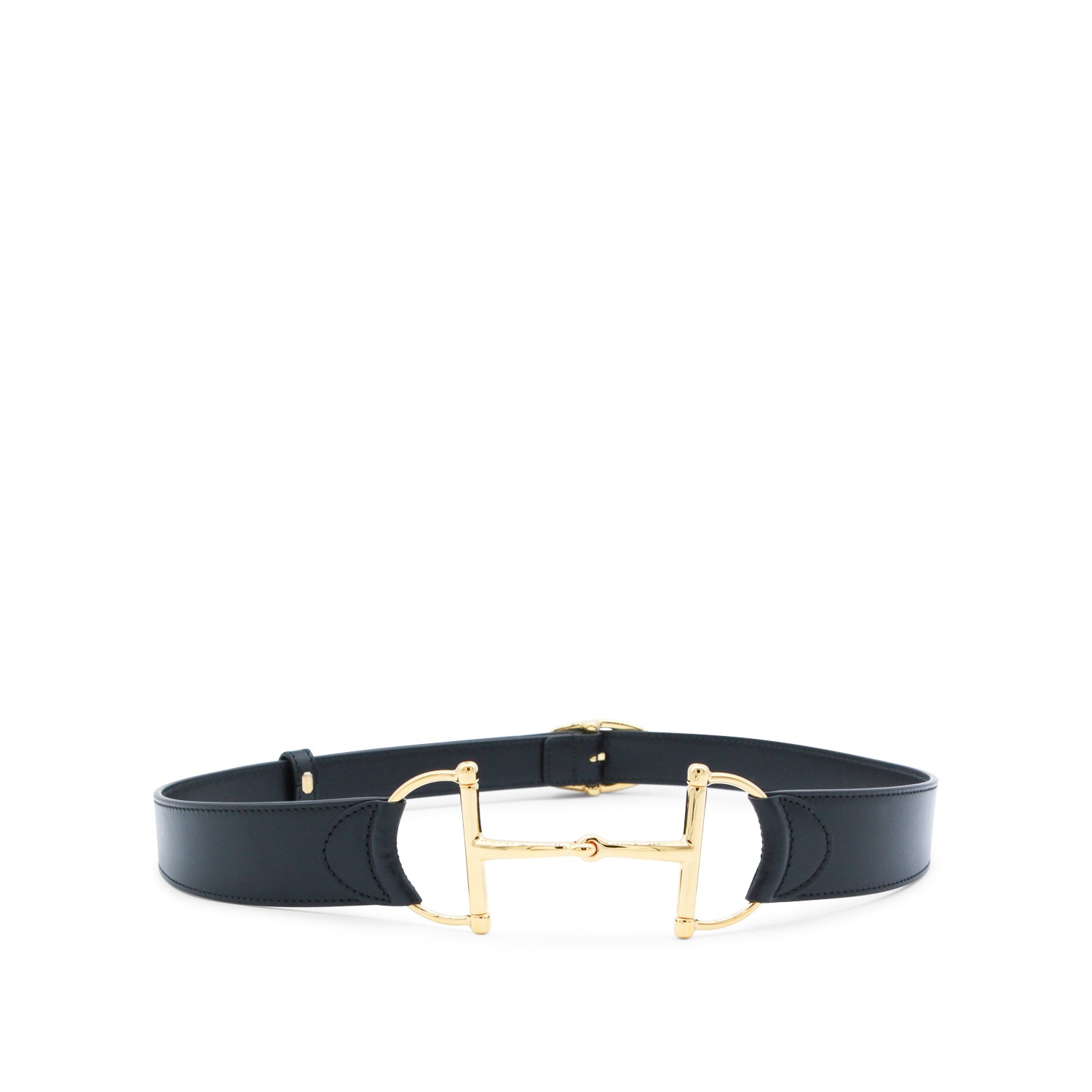 Black leather belt from Gucci featuring gold-tone hardware, oversize Horsebit buckle closure and adjustable size.