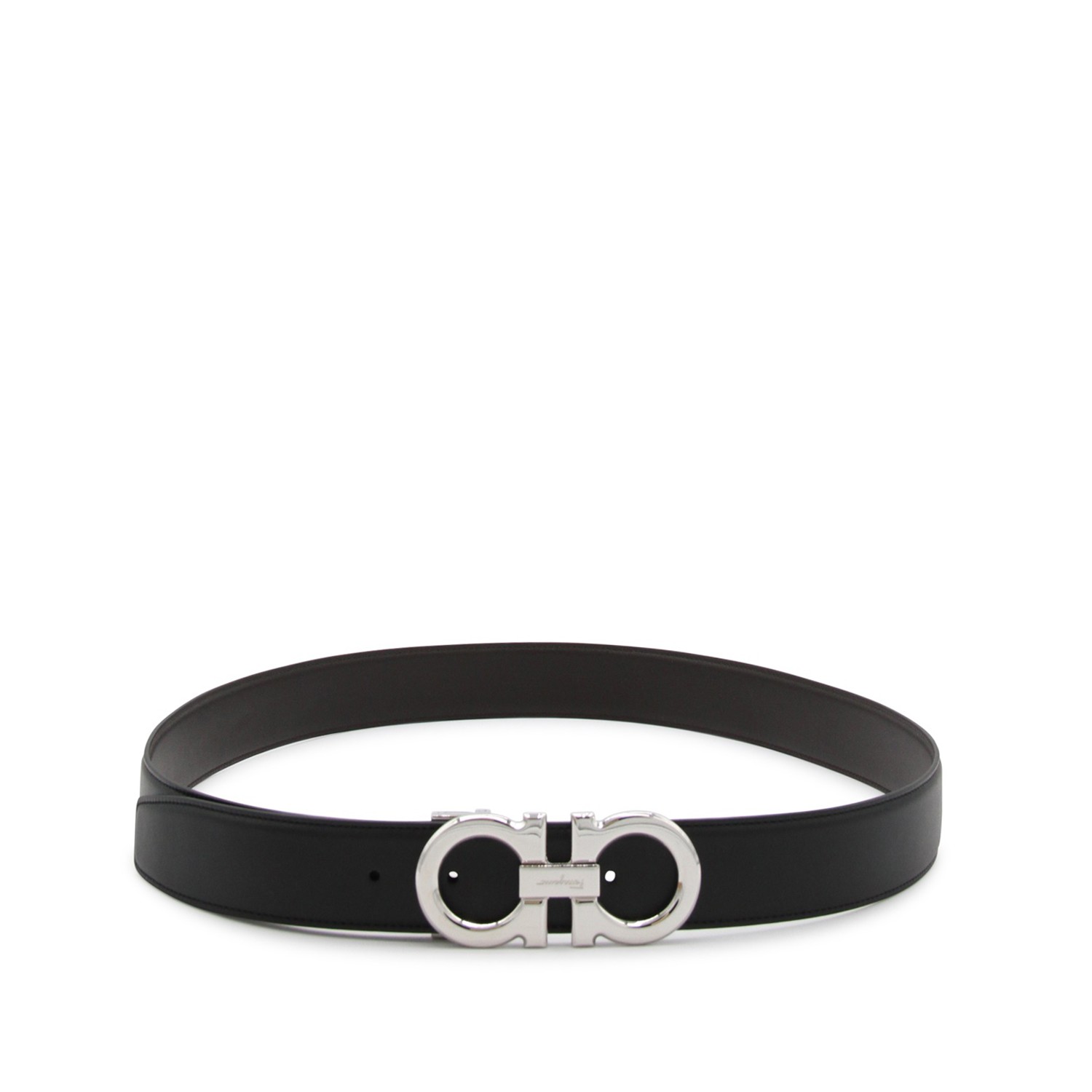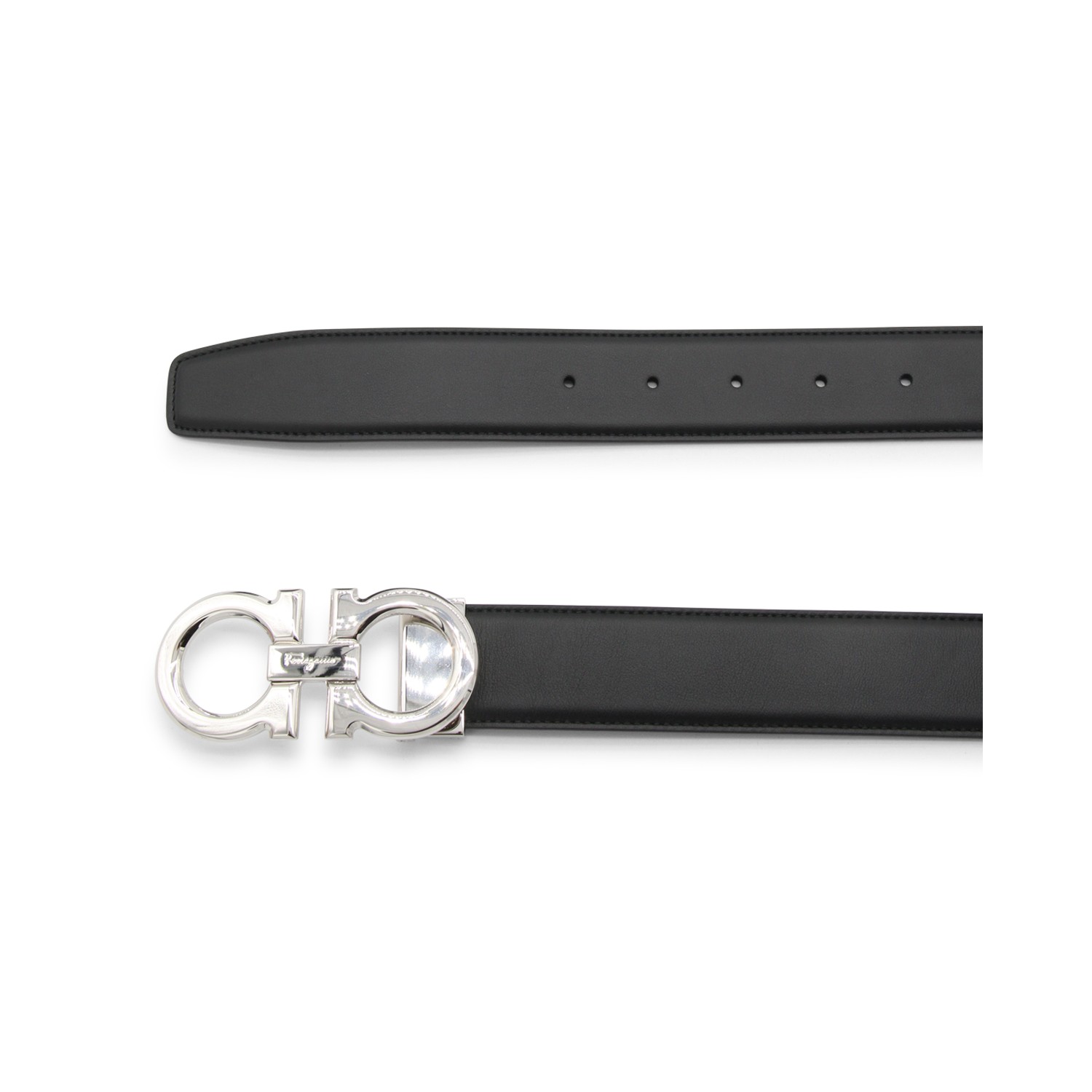 Black leather Gancini belt from Ferragamo featuring adjustablke closure, silver tone metal hardware, embossed internal logo and Gancini logo hook.