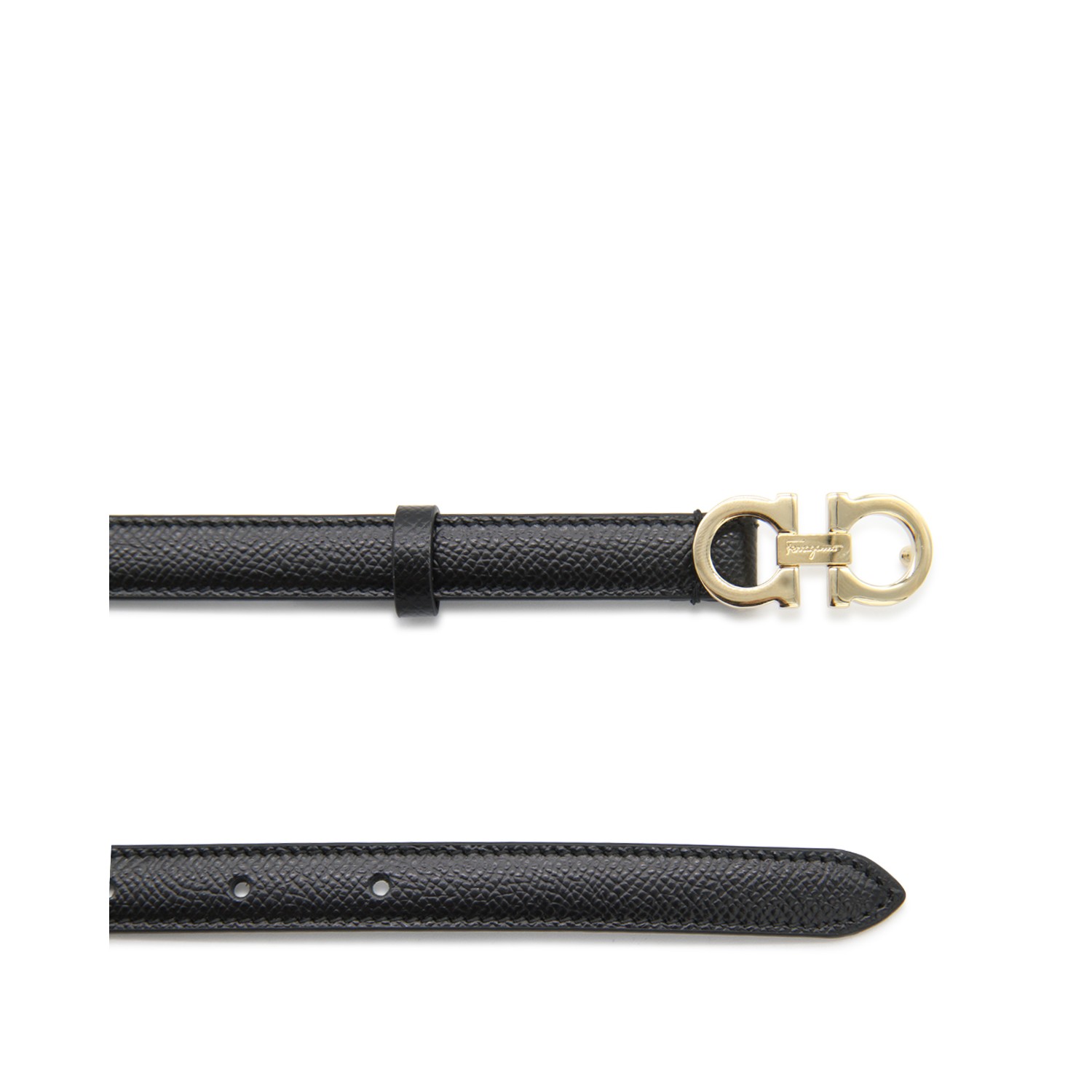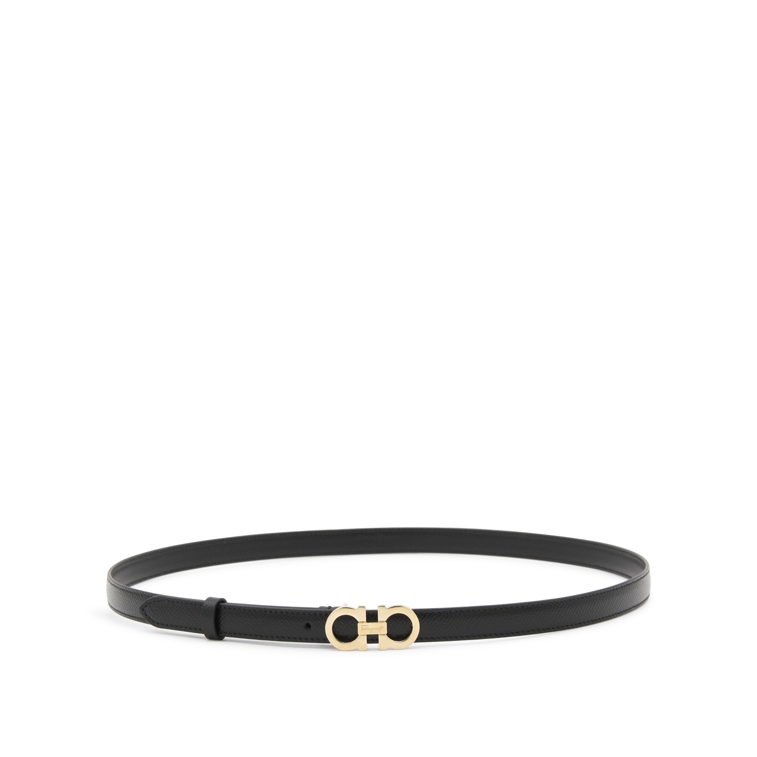 Black leather Gancini belt from Ferragamo featuring gold-tone hardware, Gancini bukle fastening, adjustable fit and pointed tip.