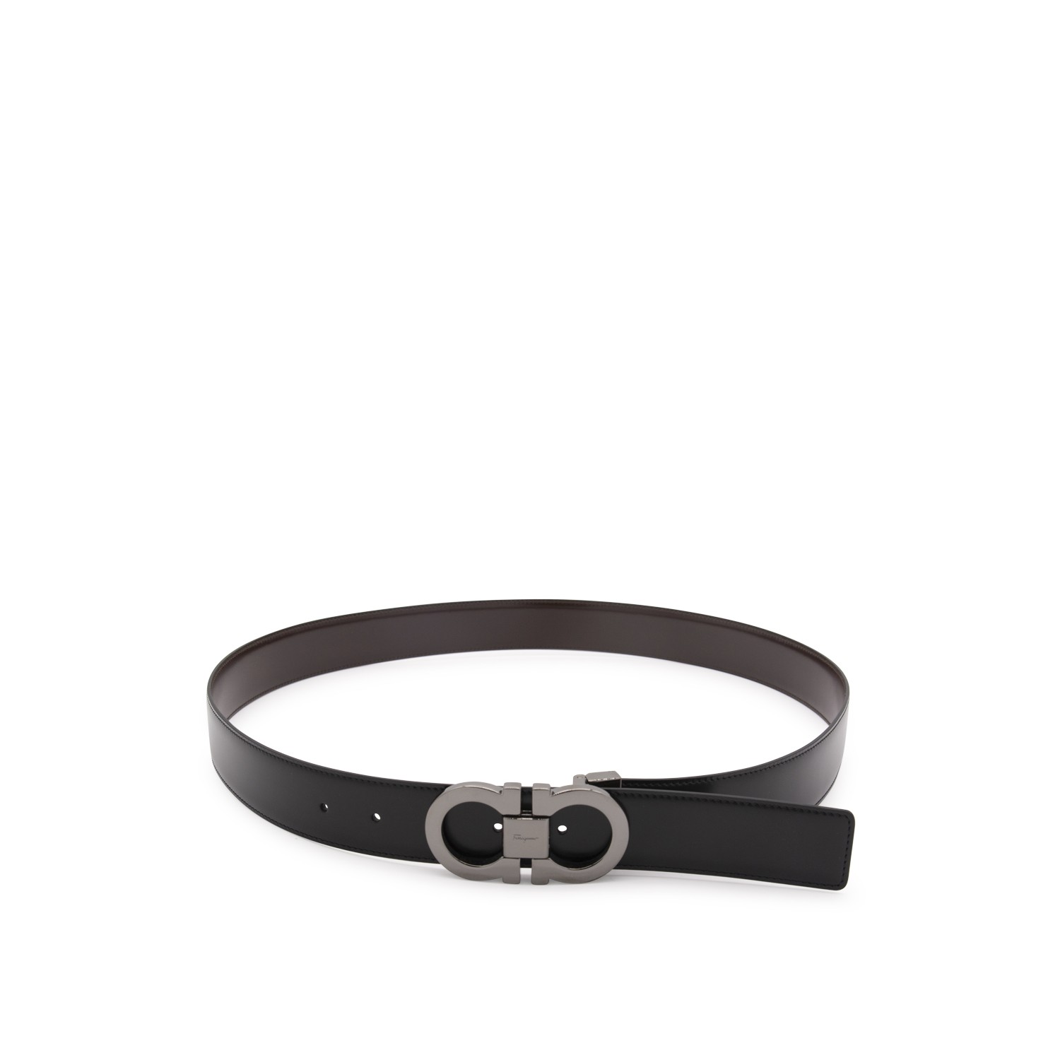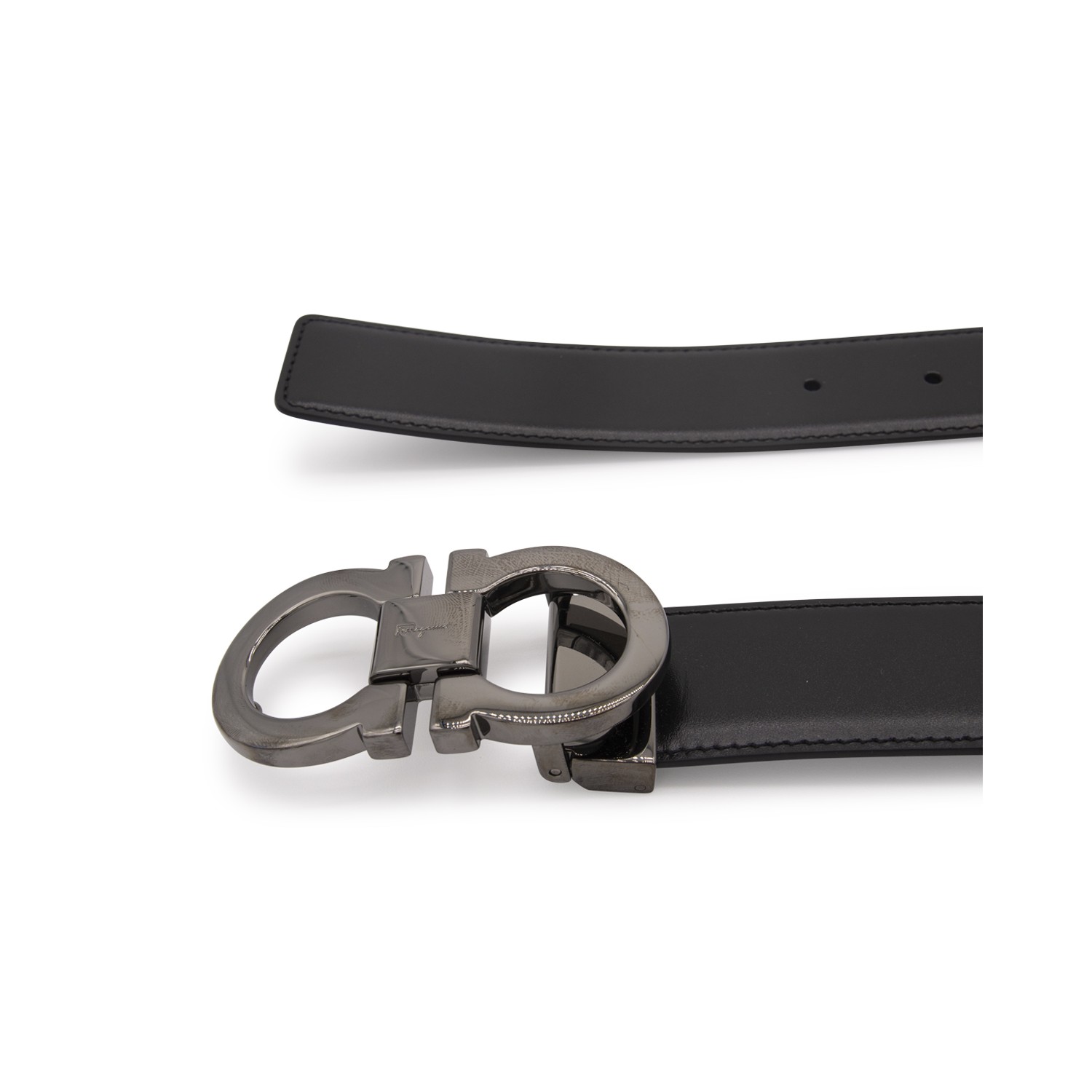 Black leather Gancini belt from Ferragamo featuring silver-tone hardware and front logo plaque.