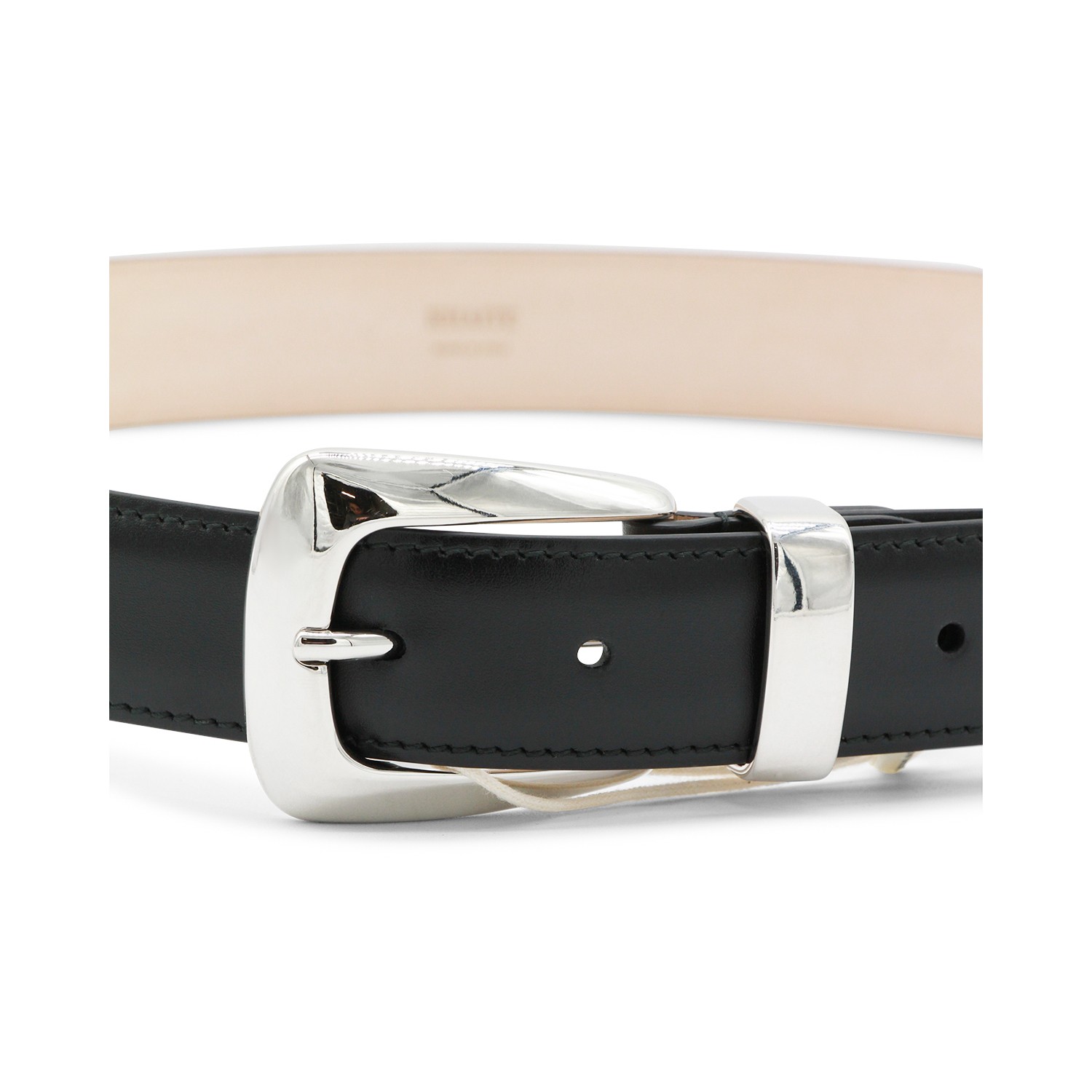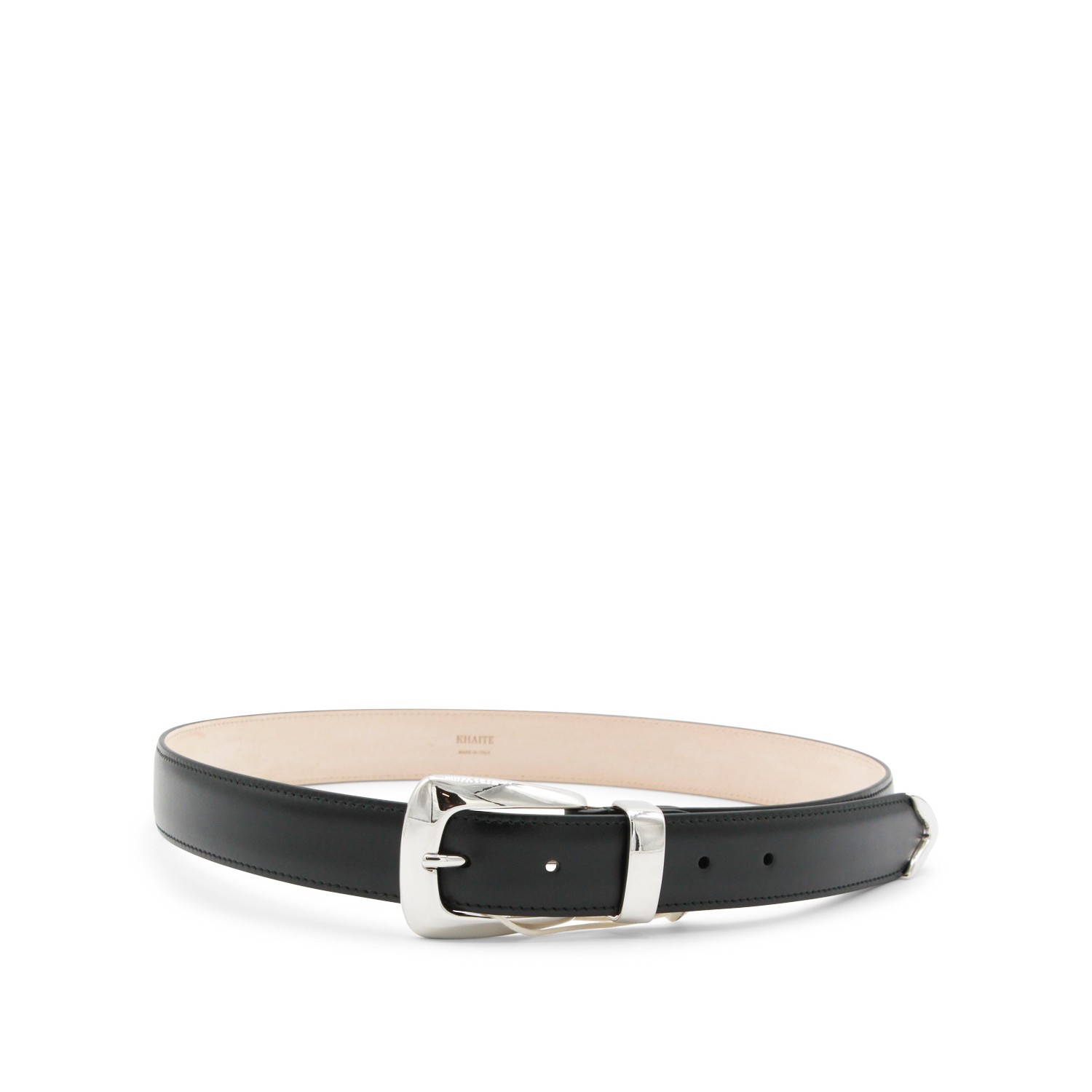 Black leather belt from Khaite featuring adjustable size and silver tone hardware.