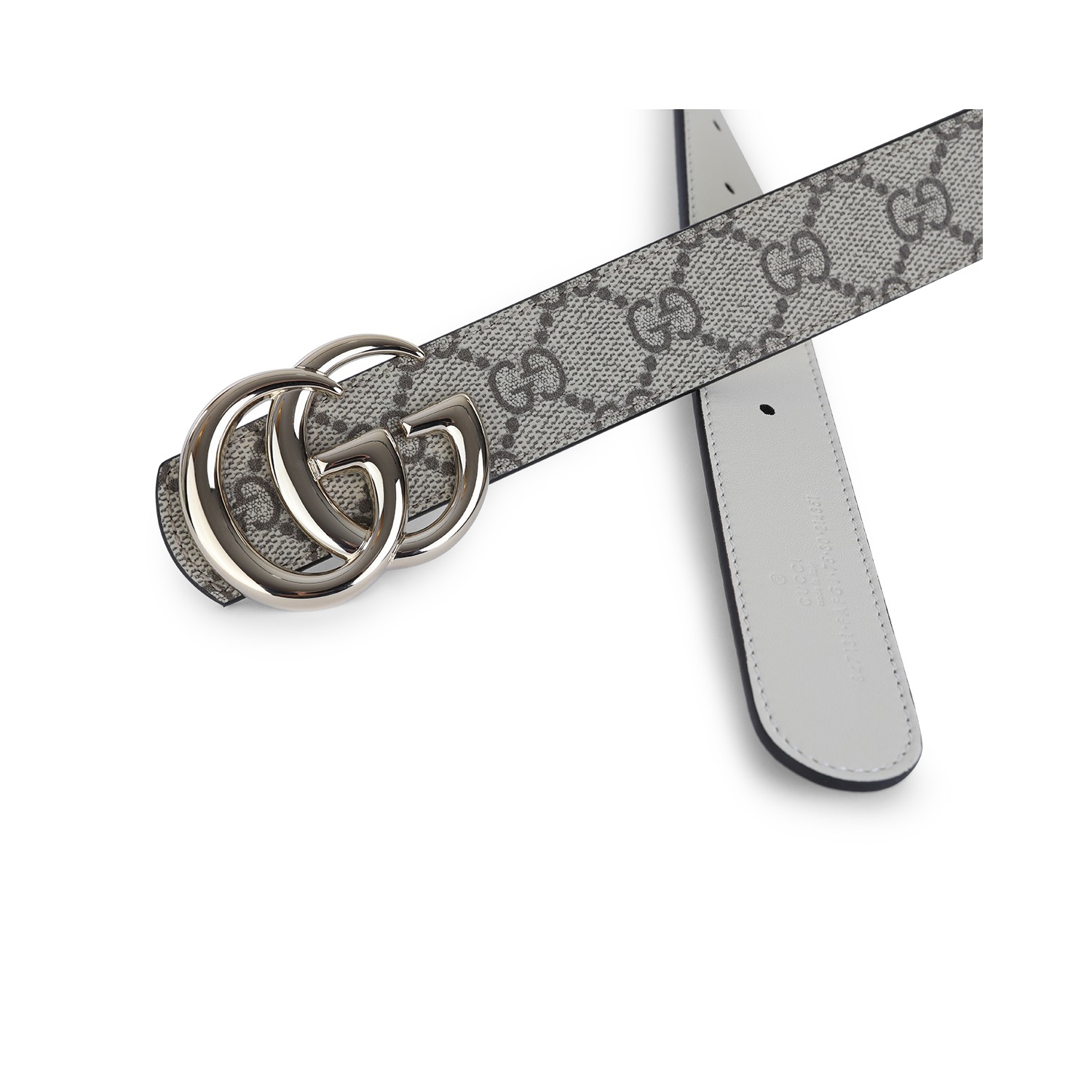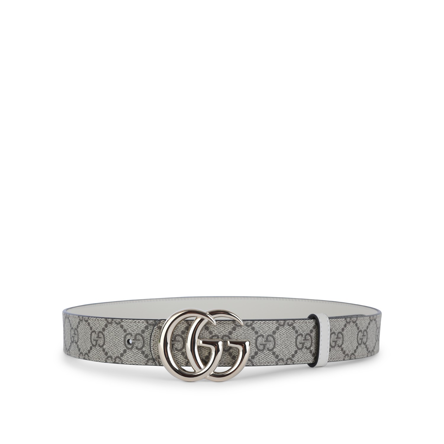 Beige belt from Gucci featuring monogram, adjustable size and GG gold tone hardware.