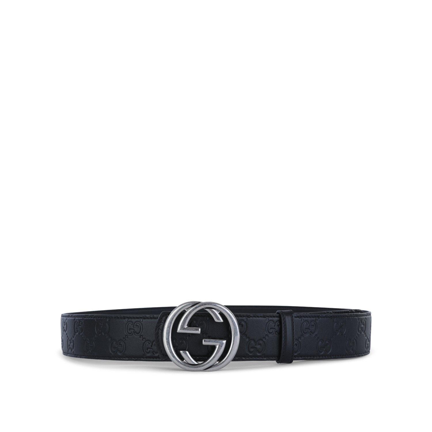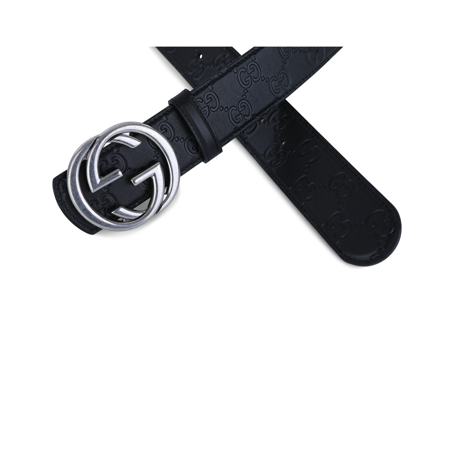 Black leather belt from Gucci featurinf adjustable size and silver tone GG hardware.