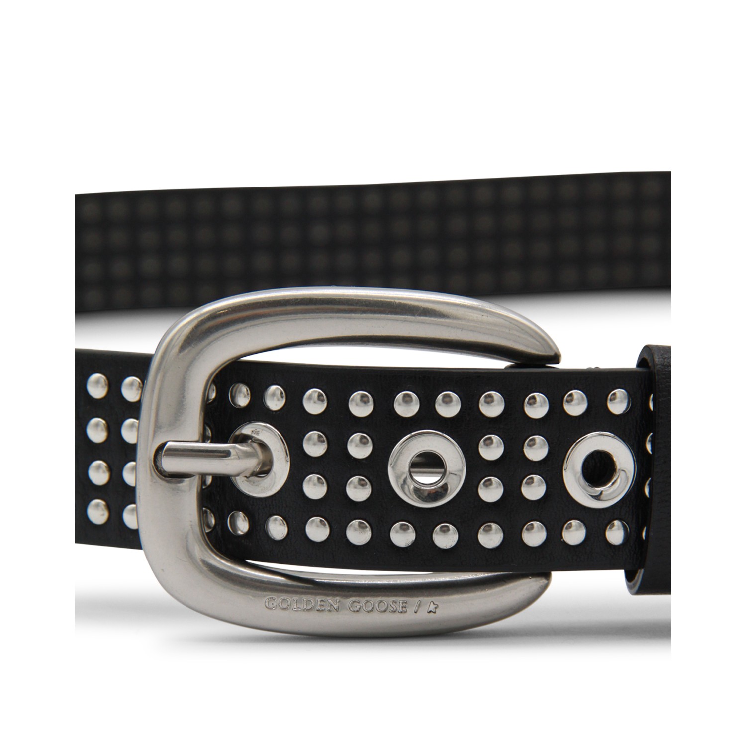 Black leather belt from Golden Goose featuring silver tone hardware, frontal buckle fastening and details.