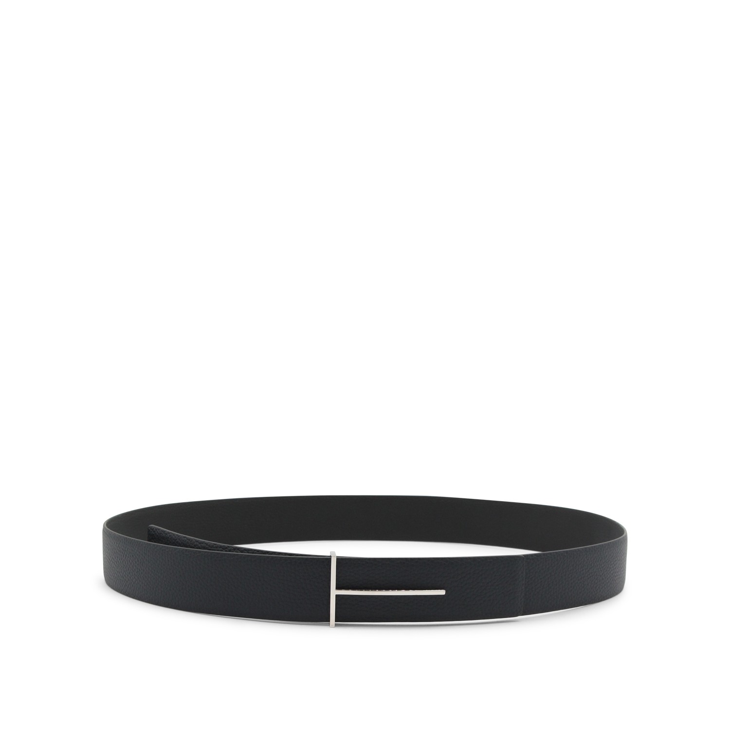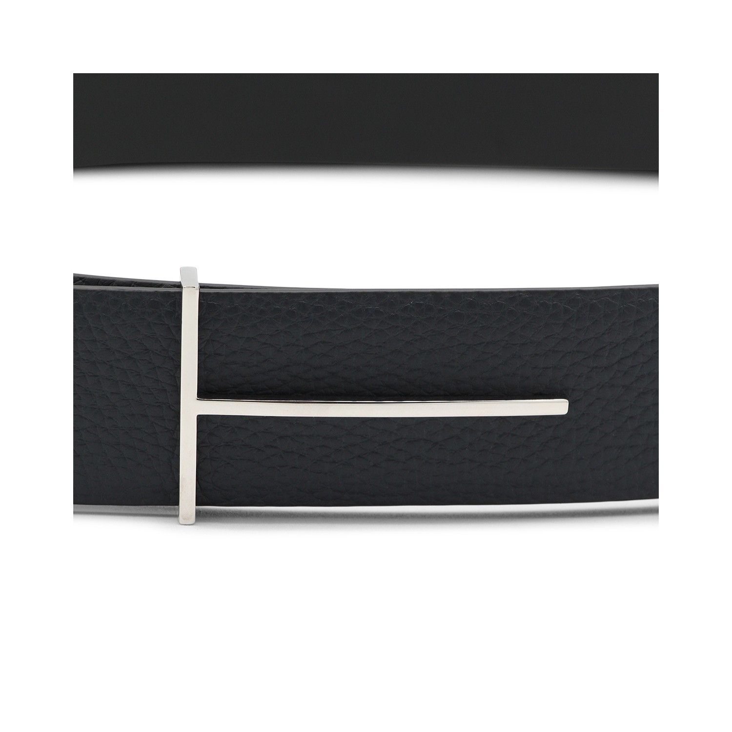 Navy leather belt from Tom Ford featuring adjustable size and silver tone hardware.