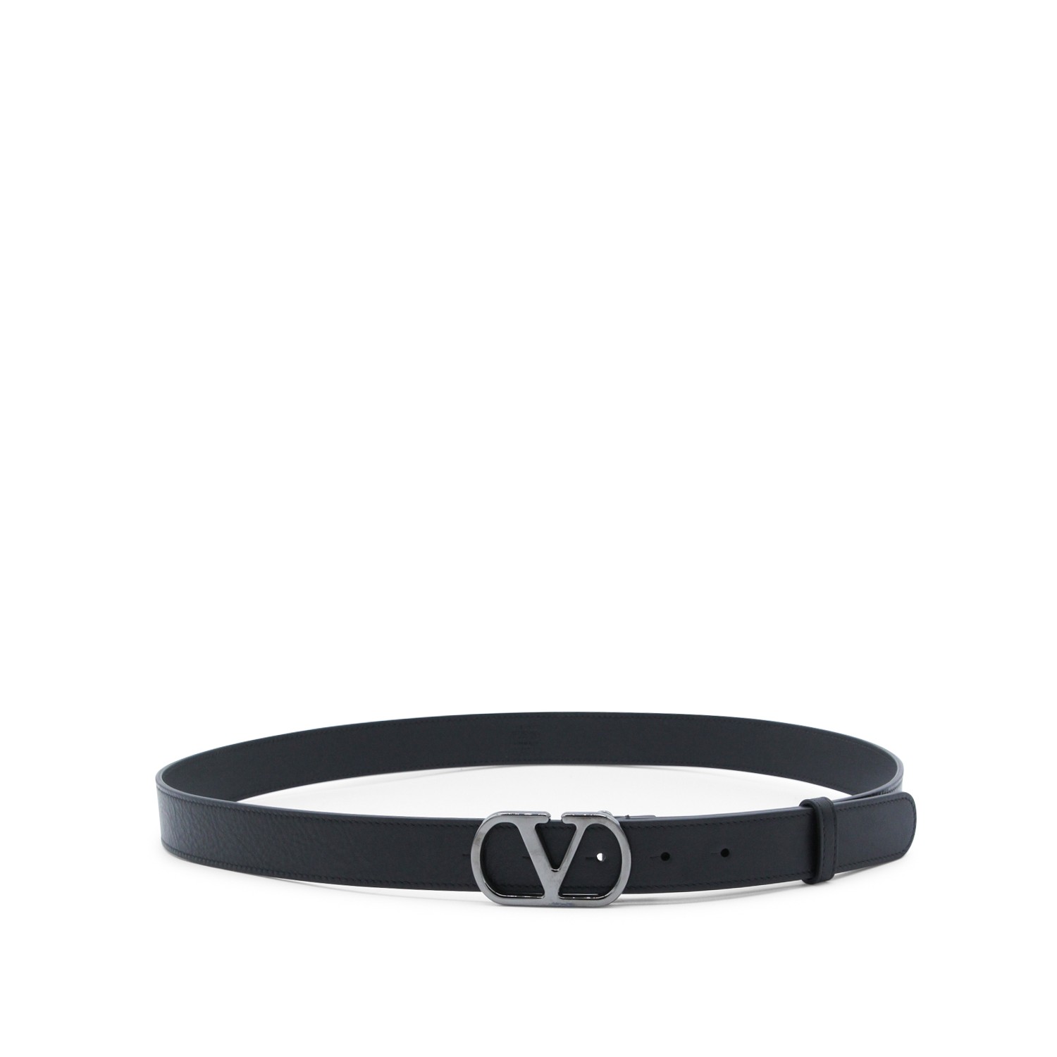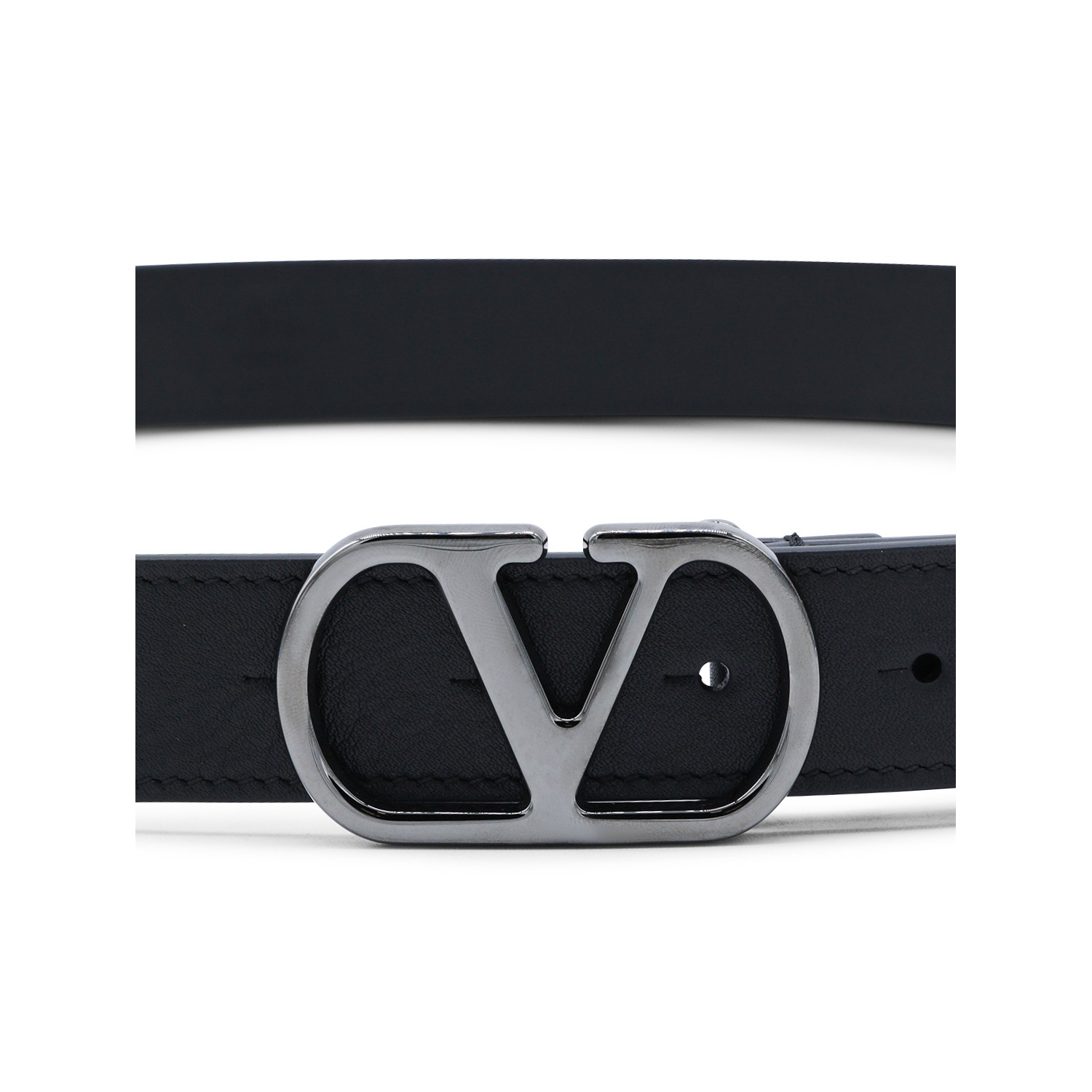 Black leather belt from Valentino Garavani featurig adjustable length, silver tone logo buckle and shiny skin treatment.