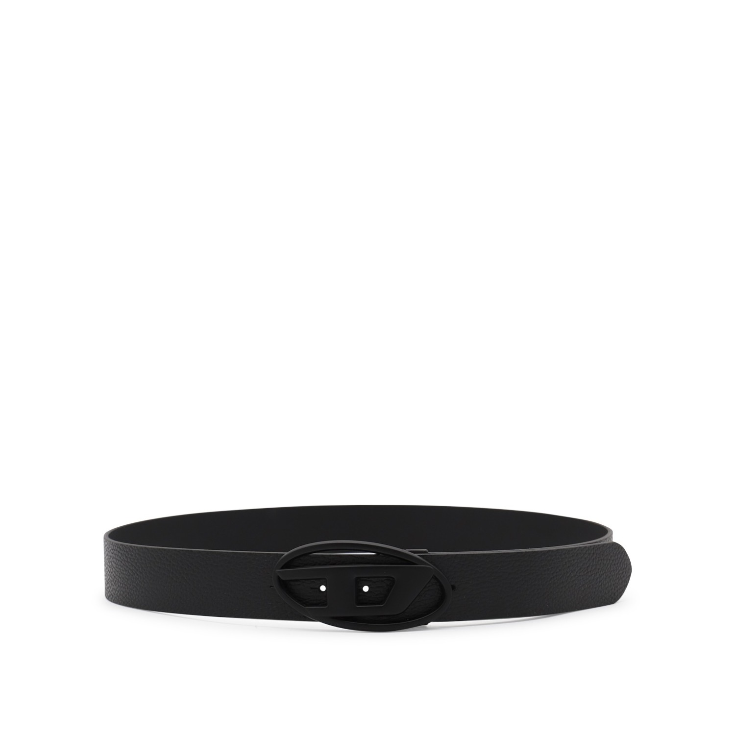 Black leather belt from Diesel featuring tone on tone buckle, reversible and adjustable closure.
