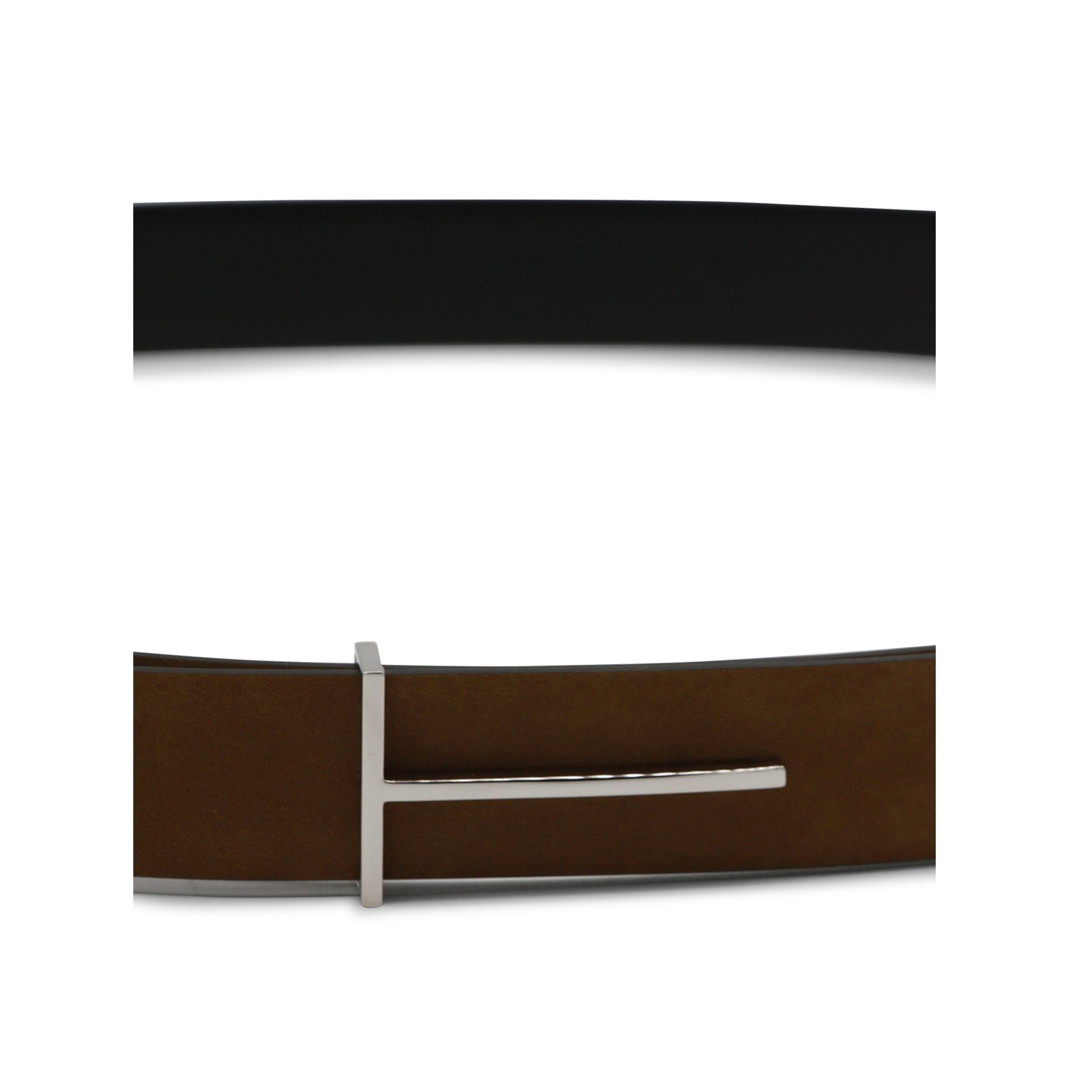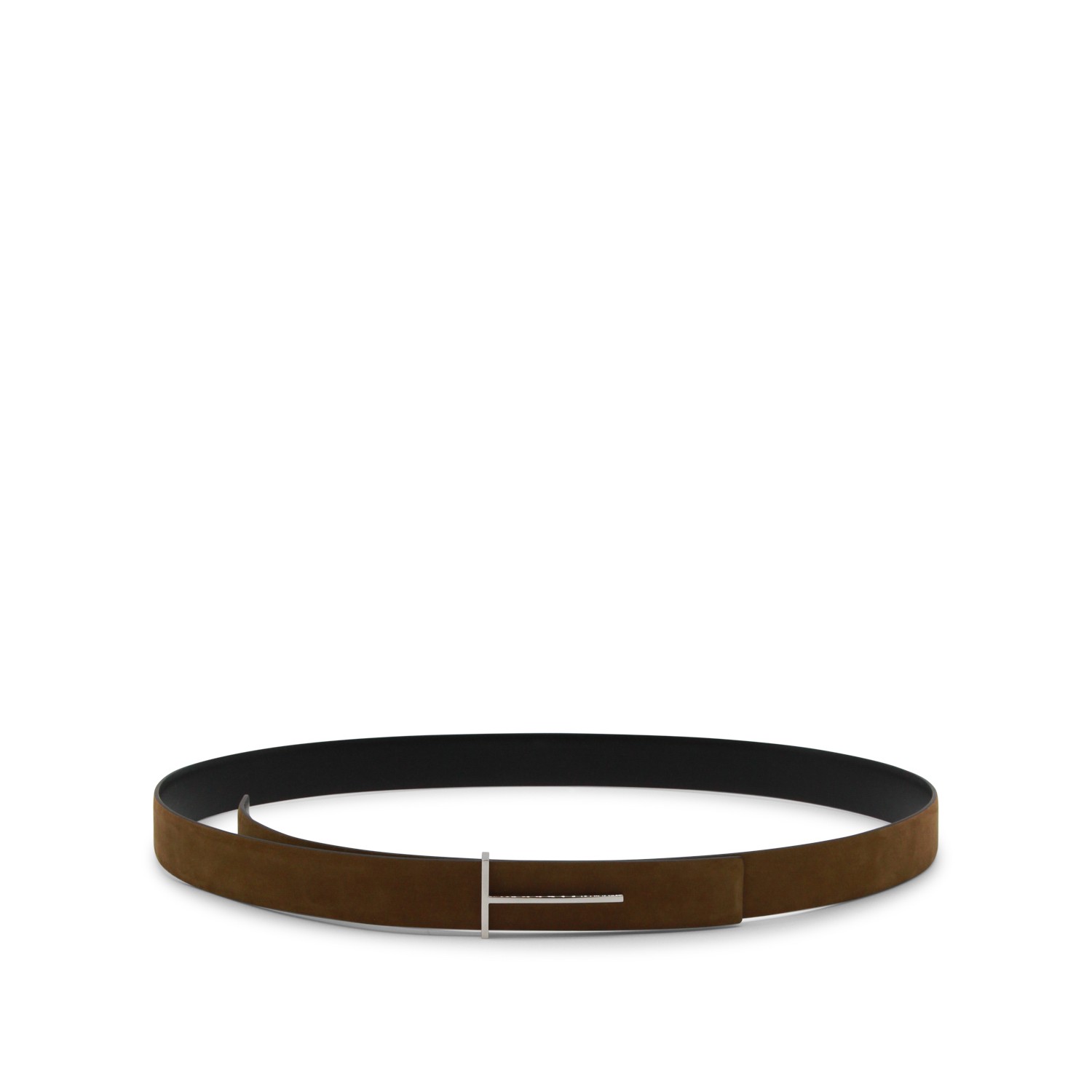 Tobacco suede belt from Tom Ford featuring adjustable buckle closure, T inserts and medium length.