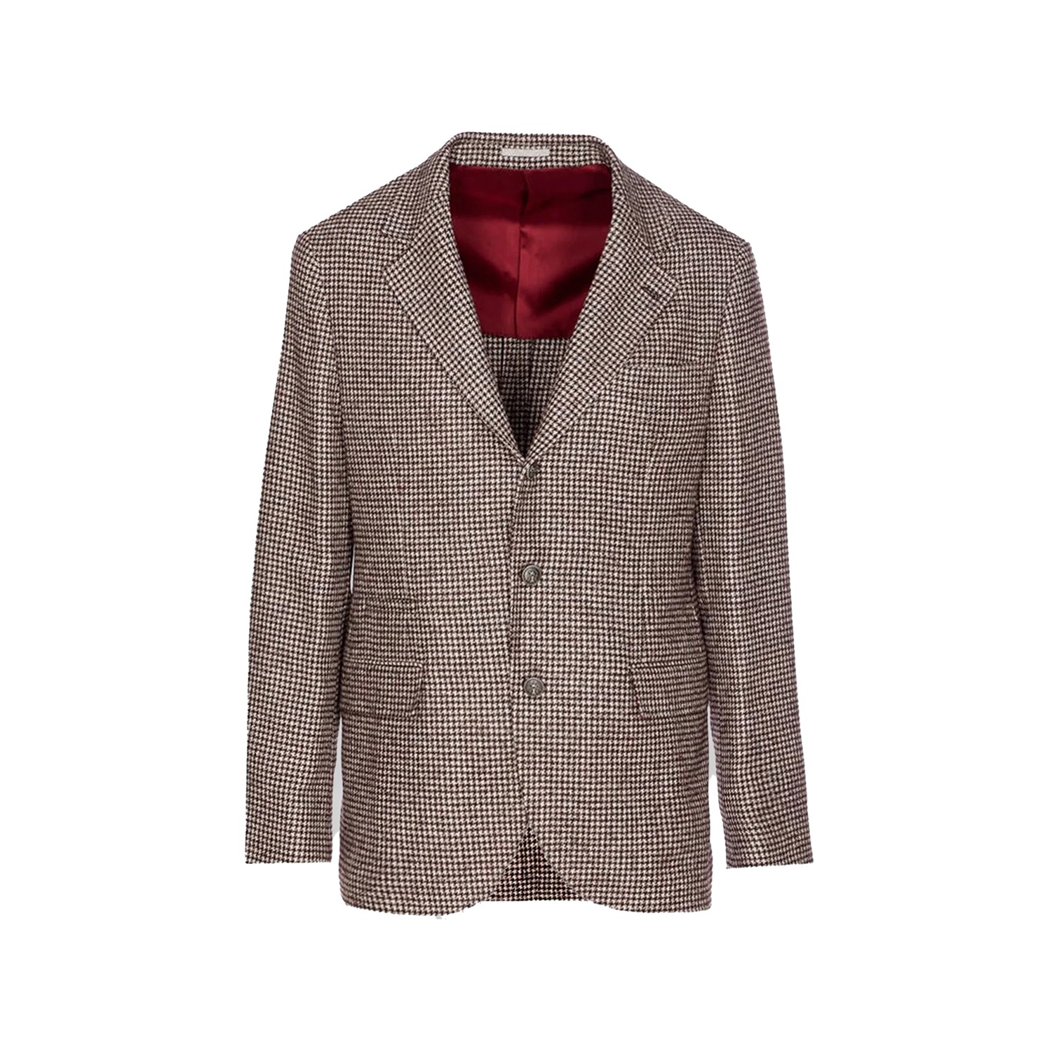 Brown wool blend blazer from Brunello Cucinelli featuring V-neckline, long sleeves, buttons fastening, frontal flap pockets, inside chest pocket, pied-de-poule pattern and regular vestibility.