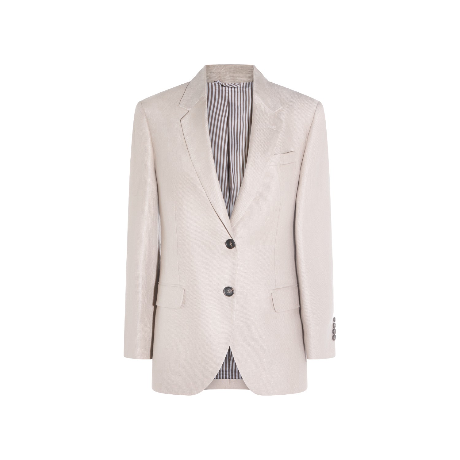Light beige linen blazer from Brunello Cucinelli featuring lapel collar, long sleeves, frontal buttons fastening, curved hem and regular vestibility.