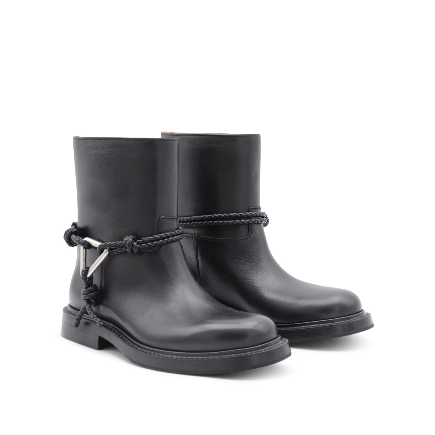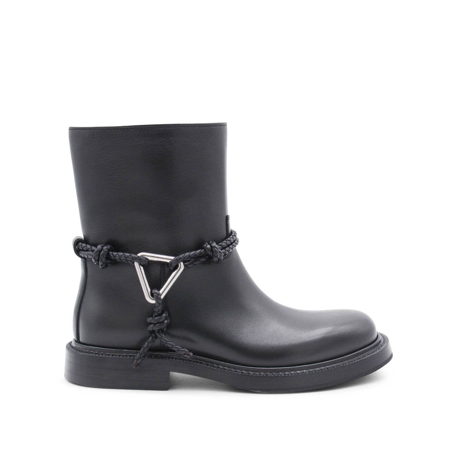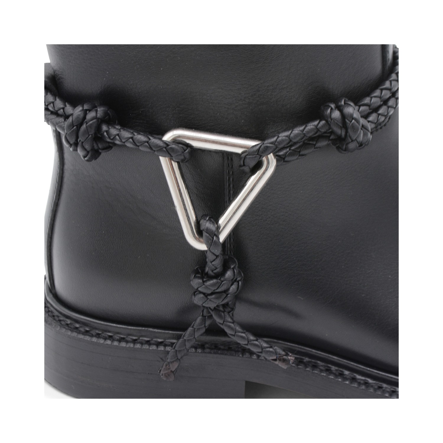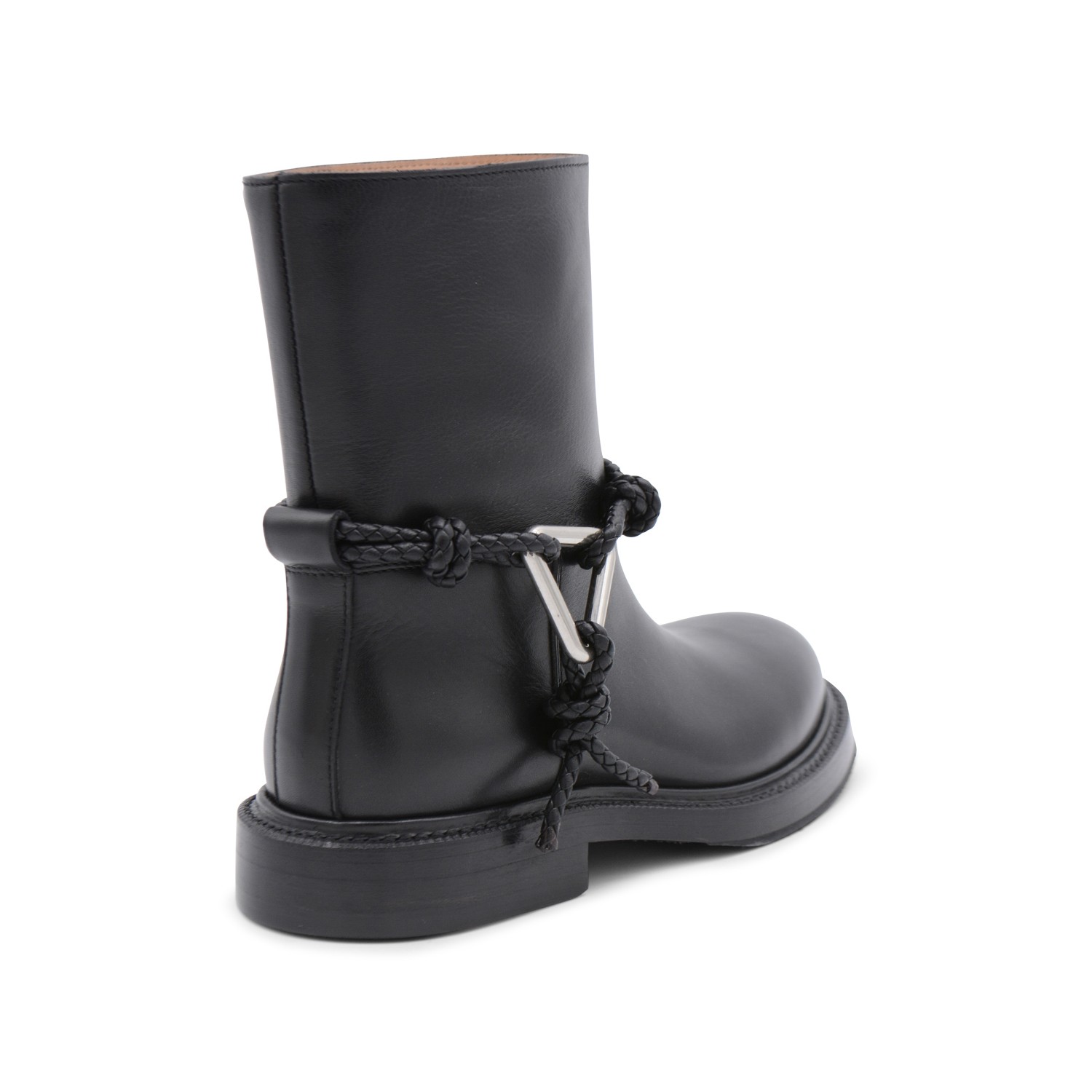 Black leather boots from Bottega Veneta featuring round toe, braided leather straps, silver tone hardware and low heel.