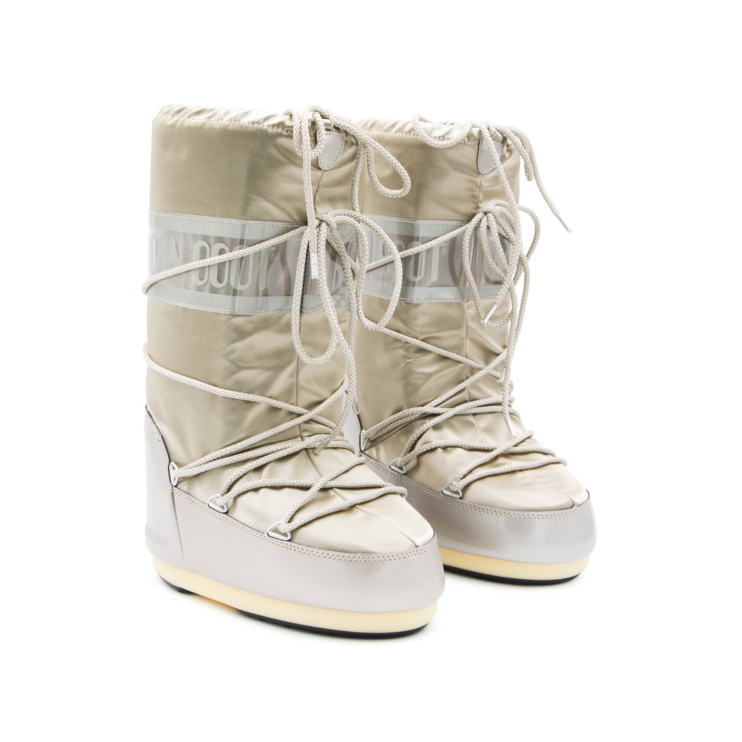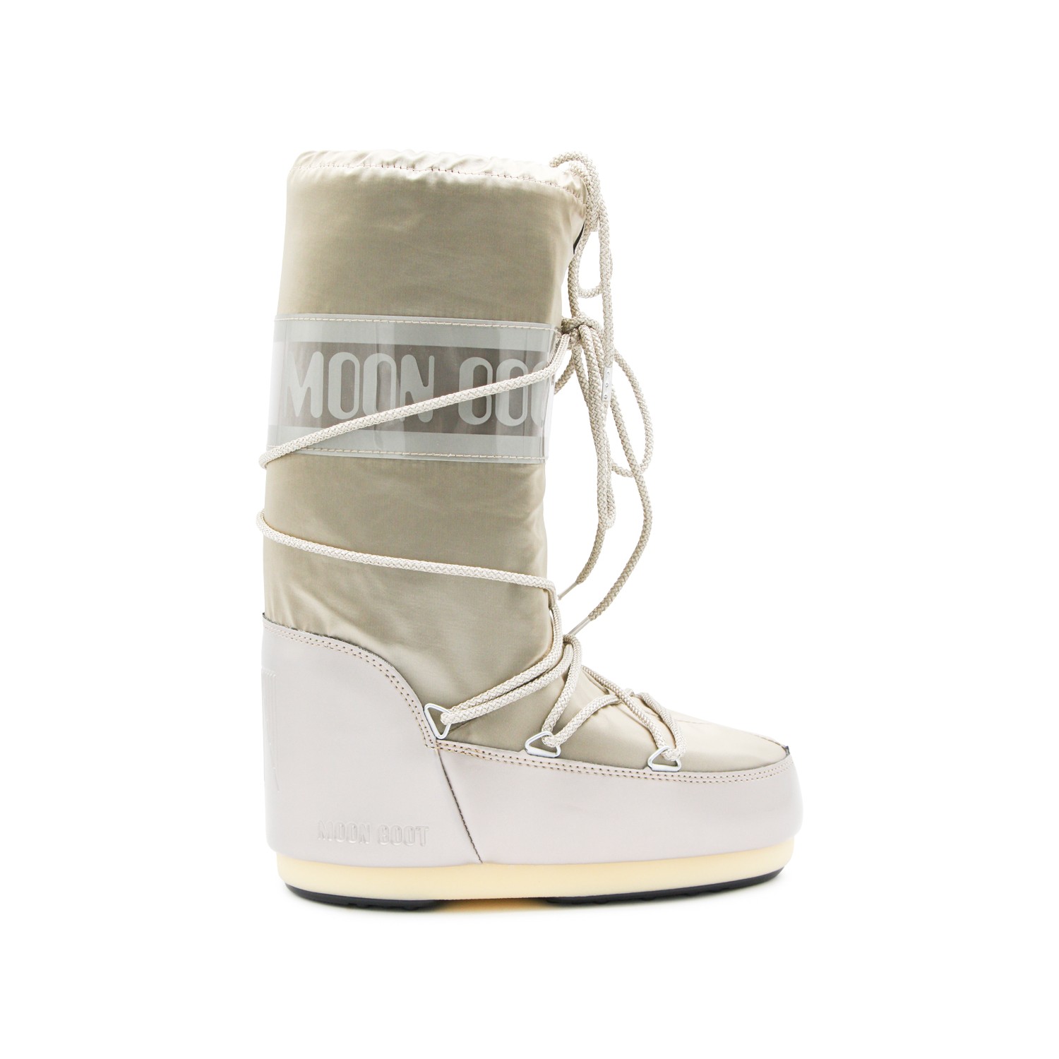 Platinum Icon Glance boots from Moon Boot featuring round toe, drawstrings, logo and leather sole.