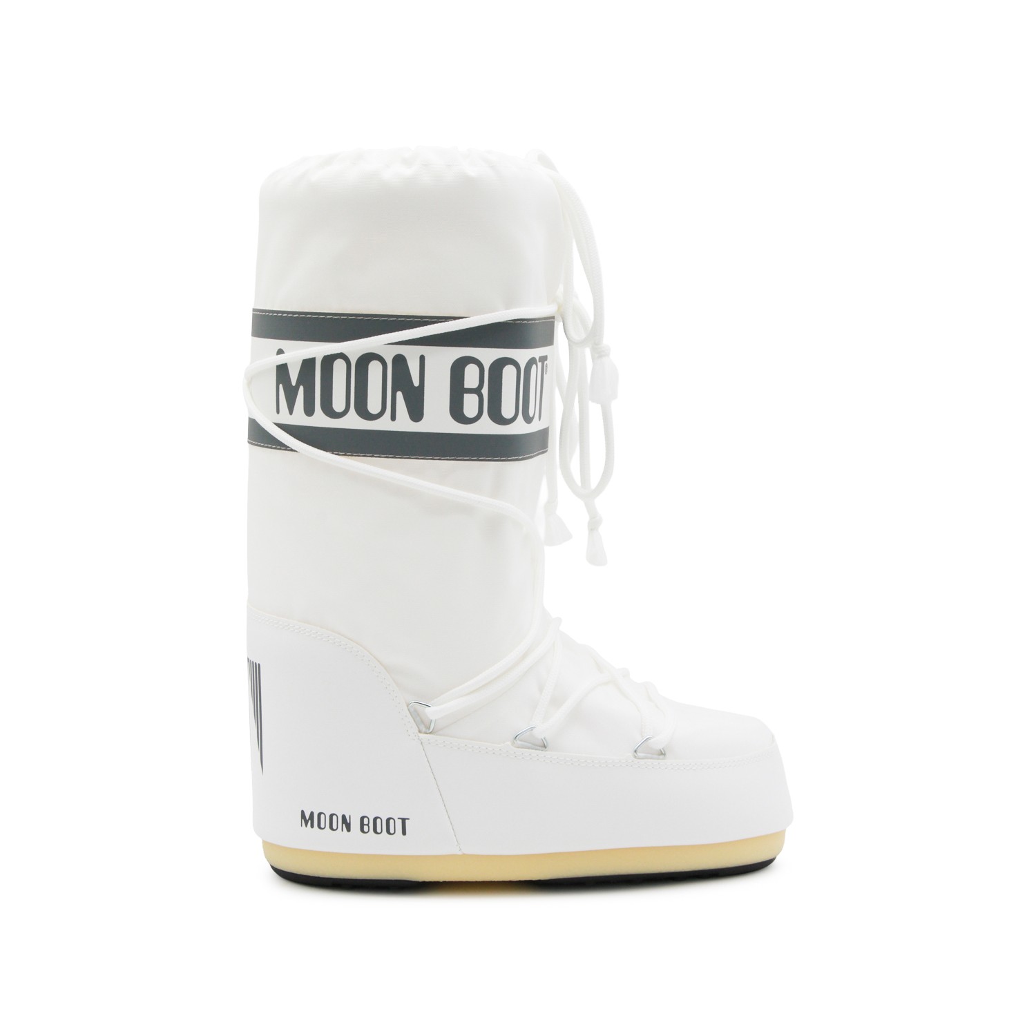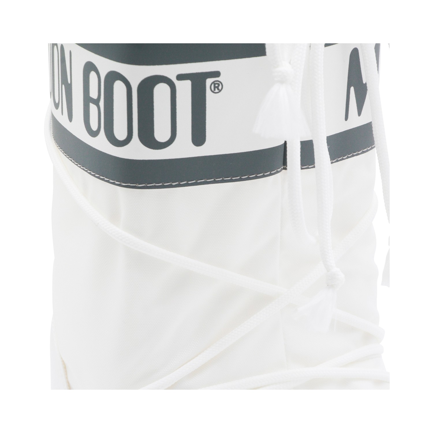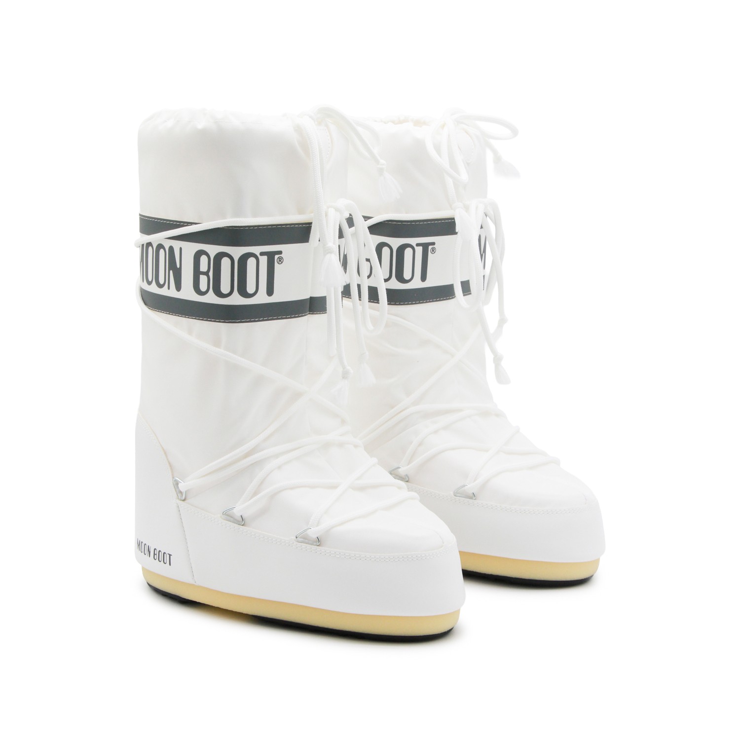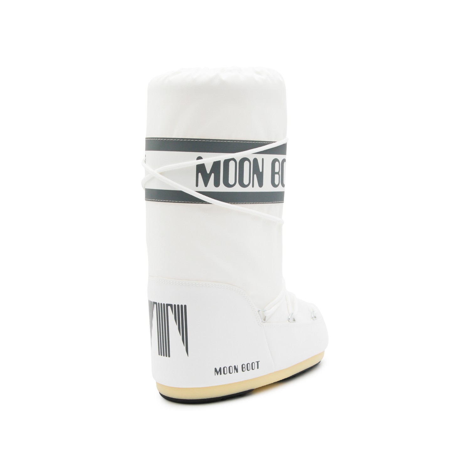 White Icon nylon boots from Moon Boot featuring round toe, laces, side logo print, drawstring and flat rubber sole.