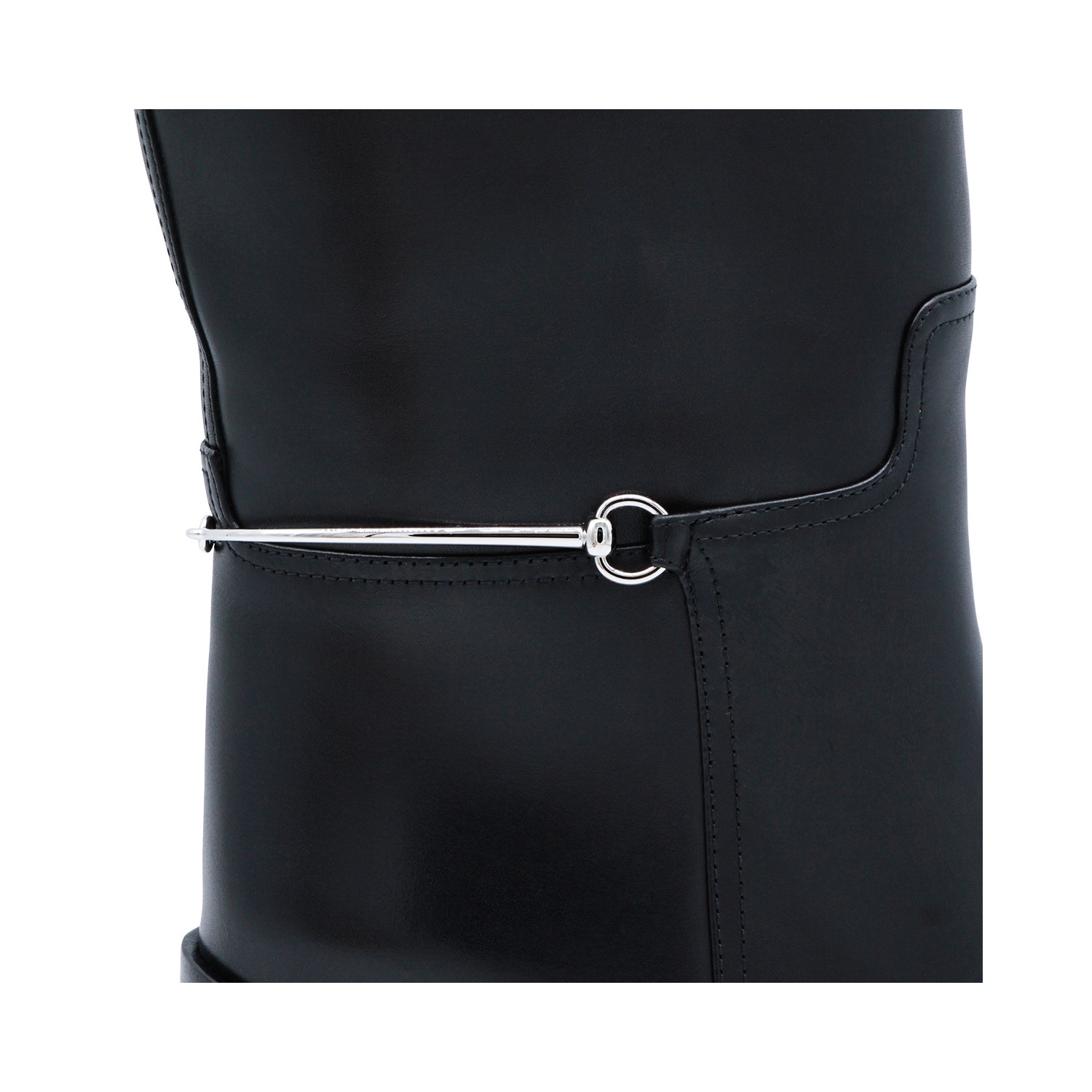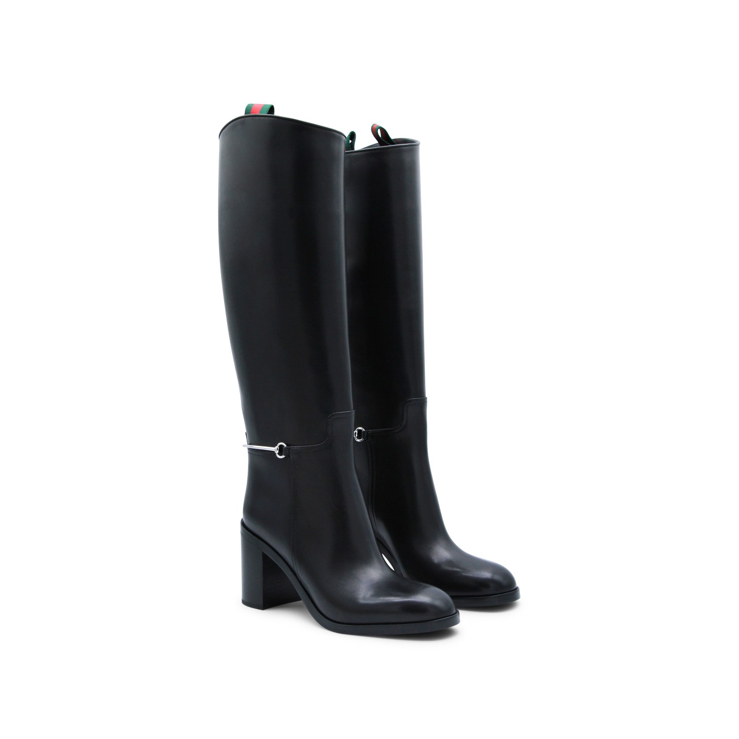 Black leather boots from Gucci featuring round toe, Clamp detail, slip-on style and mid block heel.