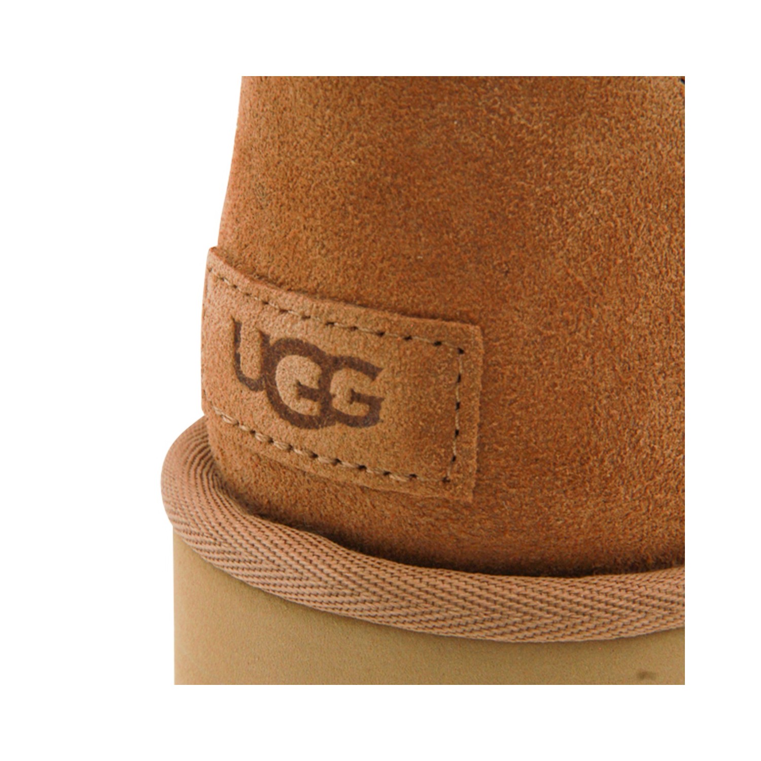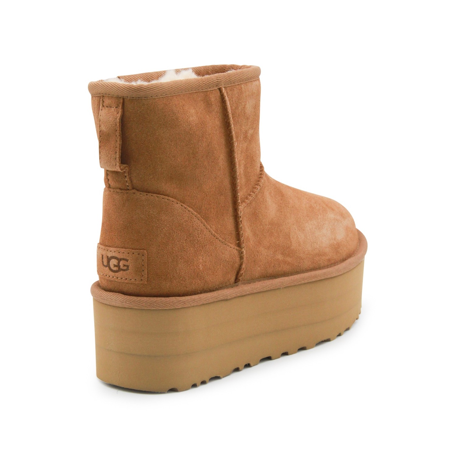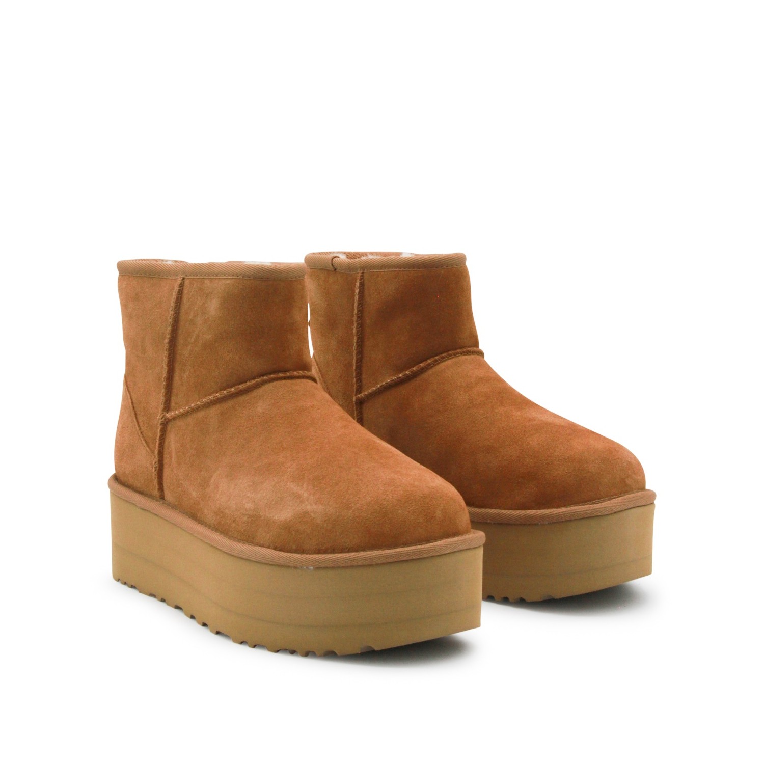 Beige classic mini platform boots from Ugg featuring round toe, platform sole and logo patch.