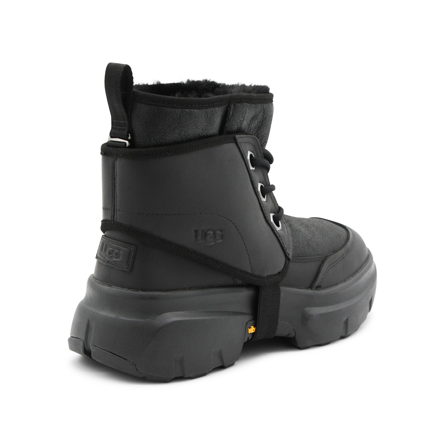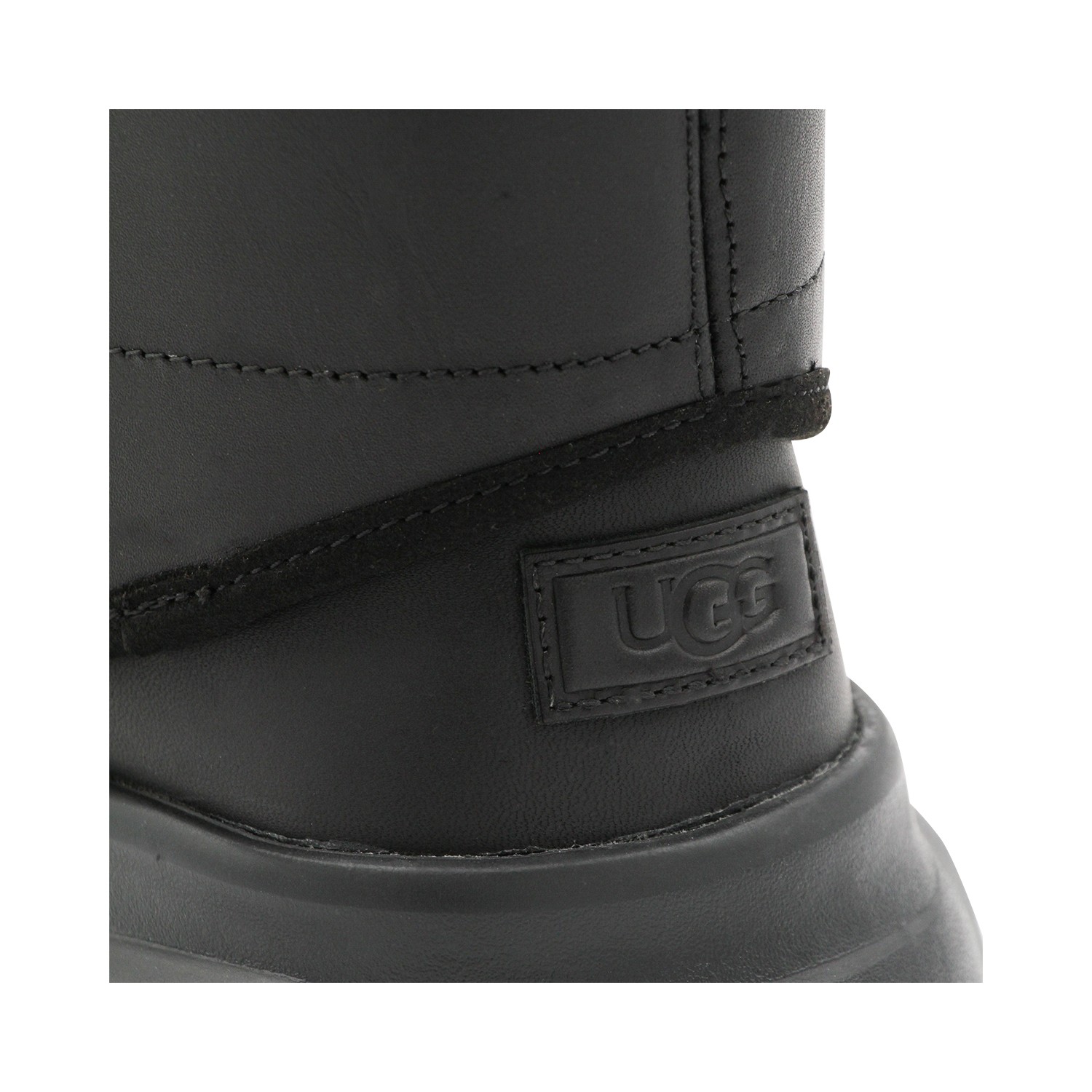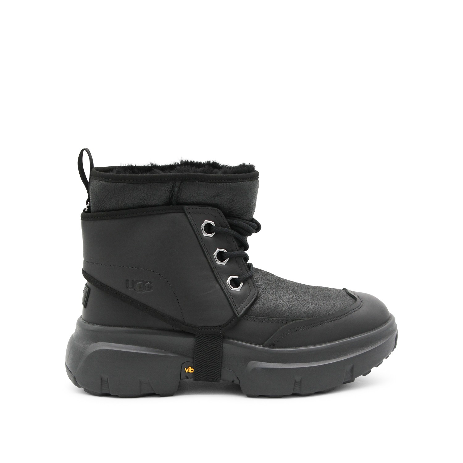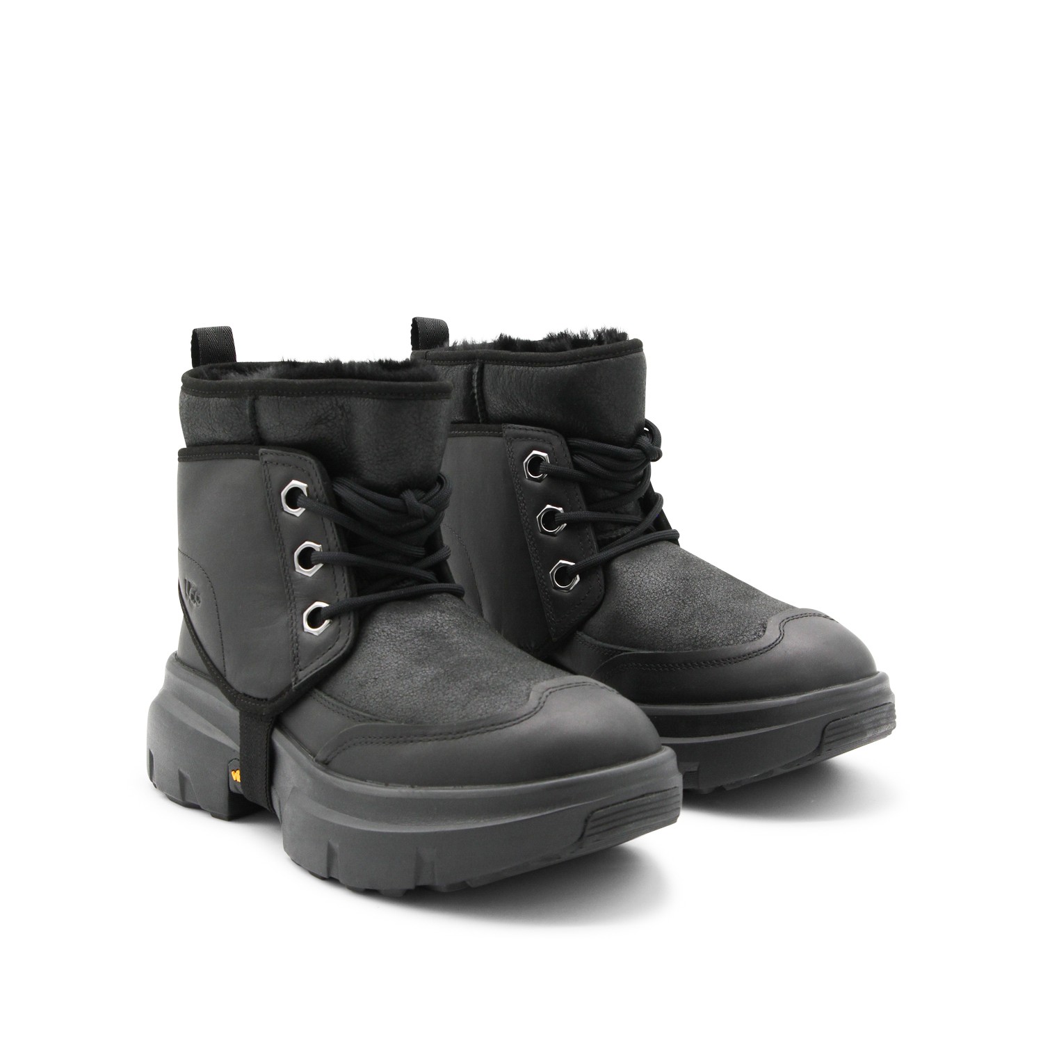 Black boots from UGG featuring round toe, lace up fastening, slip on style and rubber sole.